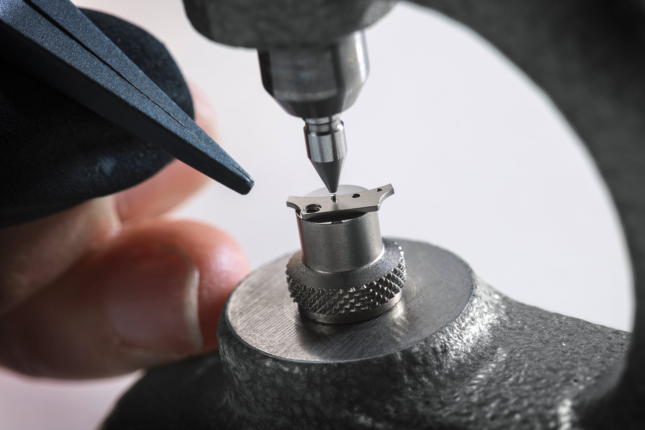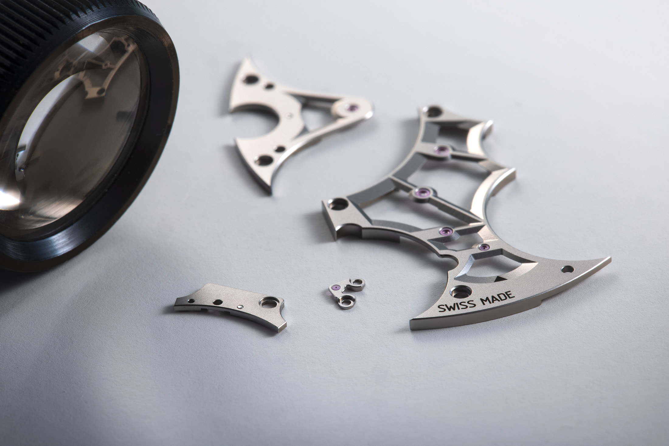 ケースバック/ムーブメントプレートはタングステンカーバイド(グレー)、ロウワーケース本体(チタン、ライトグレー)、巻上げ用ツマミ(右)と時刻合わせ用ツマミ(左)。