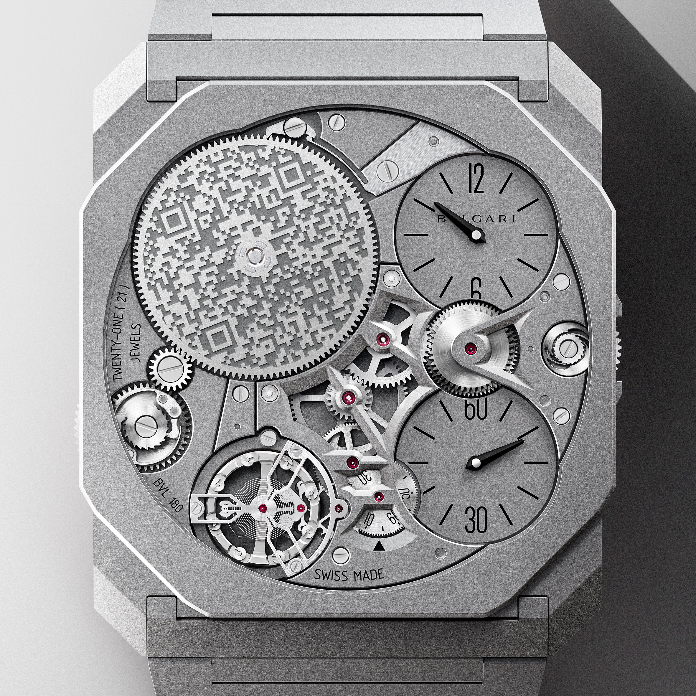 超薄型マニュファクチュール手巻きムーブメント、BVLCal. 180(厚さ1.50mm)。ラチェットホイールにはNFTのアートワークにリンクする独自のQRコードが刻印されている。50時間パワーリザーブ、2万8800振動/時(4Hz)。フォールディングクラスプつき超薄型チタン製ブレスレット。