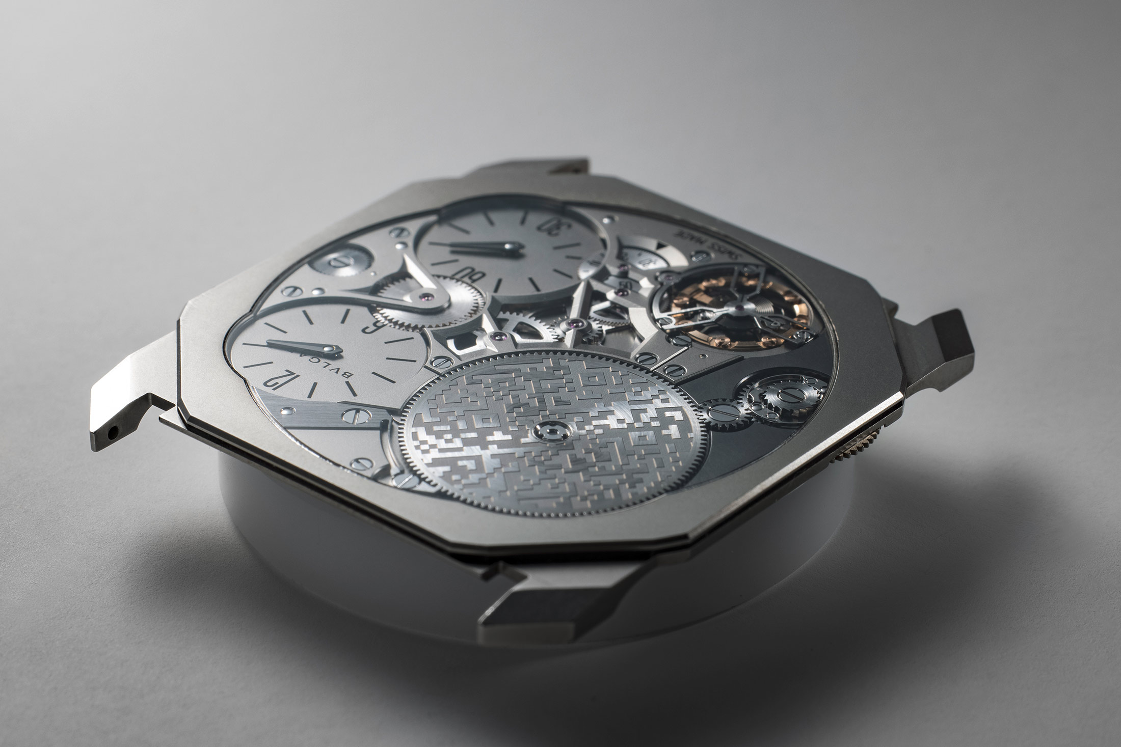 スティリアーニ氏によれば、そのときブルガリとコンセプト社は、白紙からやり直したのだという。「ラウンド型にする必要も、3針にする必要もない」と彼は言った。何度も修正を重ね、コンセプ ト社は完成に至った。ムーブメントは文字盤の丸い開口部にぴったりと収まるが、右側には時・分のサブダイヤルのエッジのためにふたつの切り欠きがあり、主ゼンマイ、テンプ、ふたつのサブダイヤルの中心軸は、正確には四角形ではないにしても、少なくともその四隅に配されている。