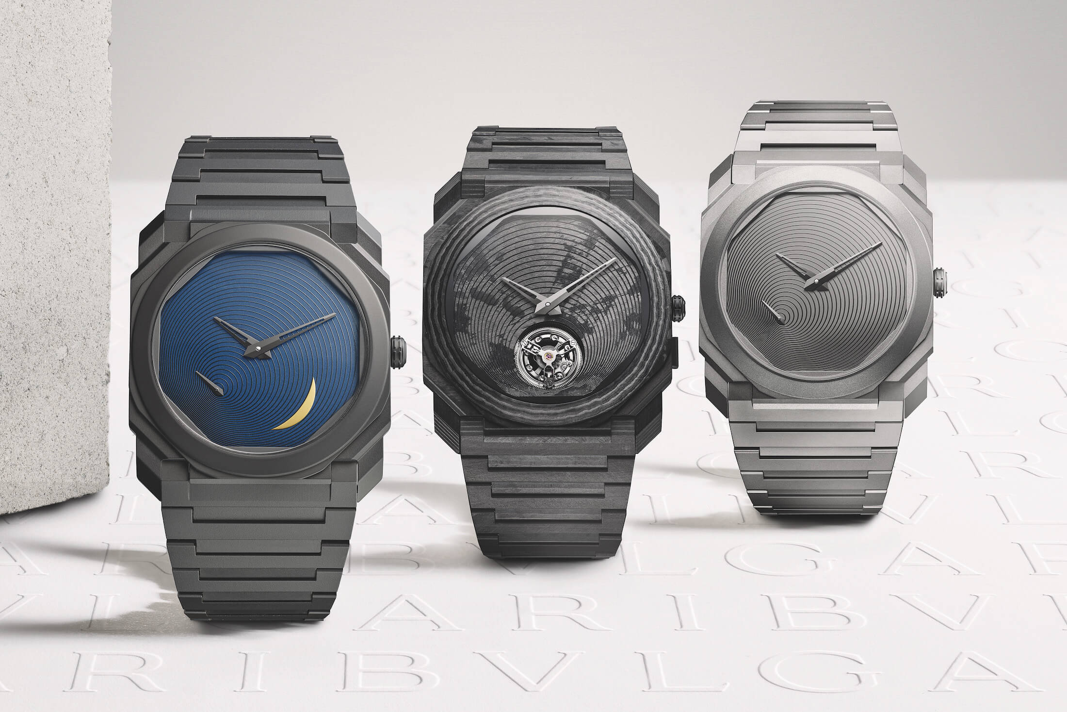 ブルガリ×安藤忠雄のコラボモデルたち。右2本が初回の試みで生まれた日本限定。個性の異なる3本が製作されている。