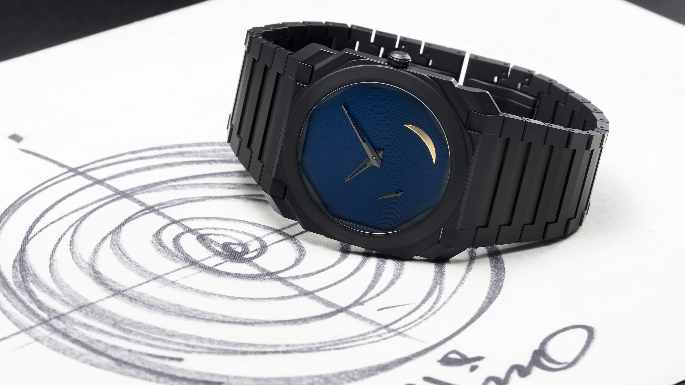 プロジェクトを実現させたのが、ブルガリ ウォッチ デザイン センターでシニア・ディレクターを務めるファブリツィオ・ボナマッサ・スティリアーニ氏だ。イタリア・ナポリに生まれ、自動車業界にも在籍したキャリアは、クルマと時計というジャンルを横断し、デザインの視座はイタリアの歴史と文化を象徴する建築にも注がれる。だからこそ安藤氏とのコラボレーションを「自身のデザインキャリアとして最高の時計となりました」と喜びを隠さない。制作のプロセスではかつてない刺激を受けたのだと推察される。「じつは第一作でこれ以上の時計はないと思っていたんです。国内外のコレクターから大きな反響もいただきました。ところが安藤さんは満足しなかった」。誕生した新作はまさに時と同様、無限に広がる二人のクリエイティビティを証明するのだ。「前作は安藤さんの作品と近い世界観にするために、チタンを採用しました。今作でブラックセラミックに変更したのは夜を表現するためで、限られた素材感によって日本の美観に沿ったデザインとしています」