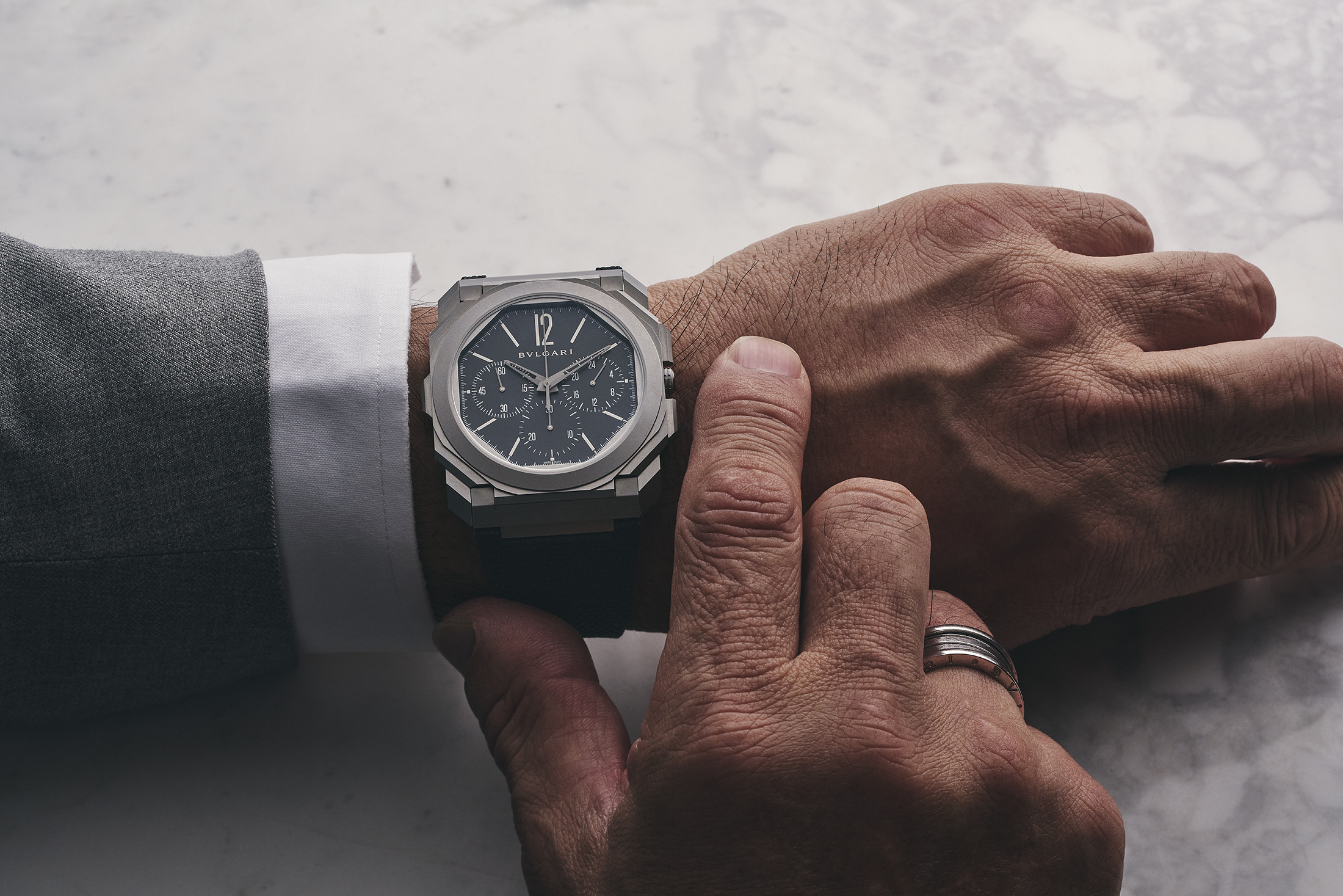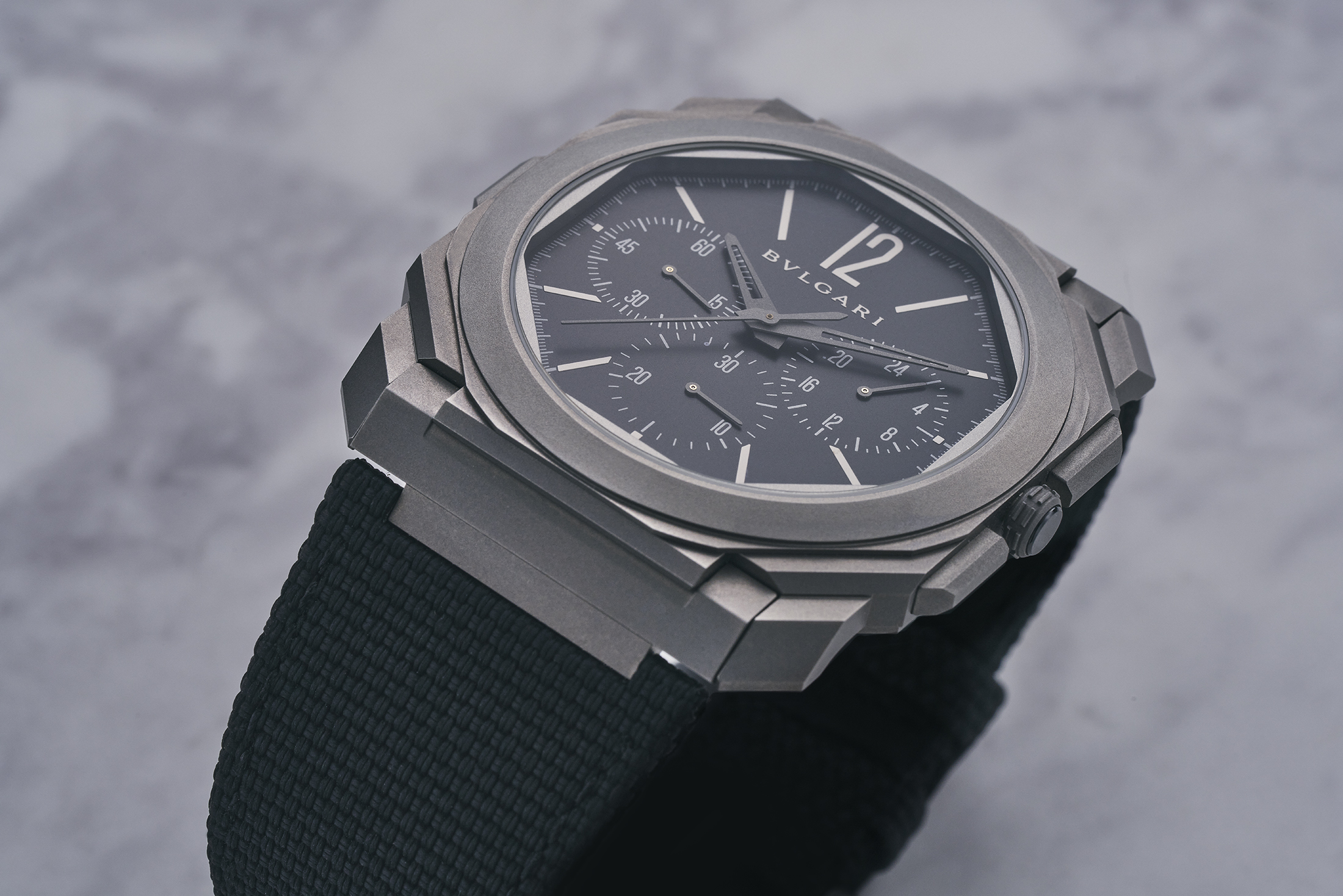 オクト フィニッシモは、現代を生きる男たちのエレガンスを追求し、多彩なライフシーンを彩る薄型という新たなラグジュアリースタイルを提案。軽量かつ堅牢なチタン素材の採用や、スタイリッシュな一体型ブレスレットもそれを支える要件だ。2019年登場のクロノグラフ GMT オートマティックはまさにその象徴となる1本である。スポーツウォッチを代表するクロノグラフと、グローバルに広がる現代の時間軸を刻むGMTという多機能を対極的な極薄に組み合わせた。その用途に不可欠な自動巻きにはペリフェラルローターを採用することで、ムーブメントは3.3㎜厚、ケースは6.9㎜厚に抑えている。