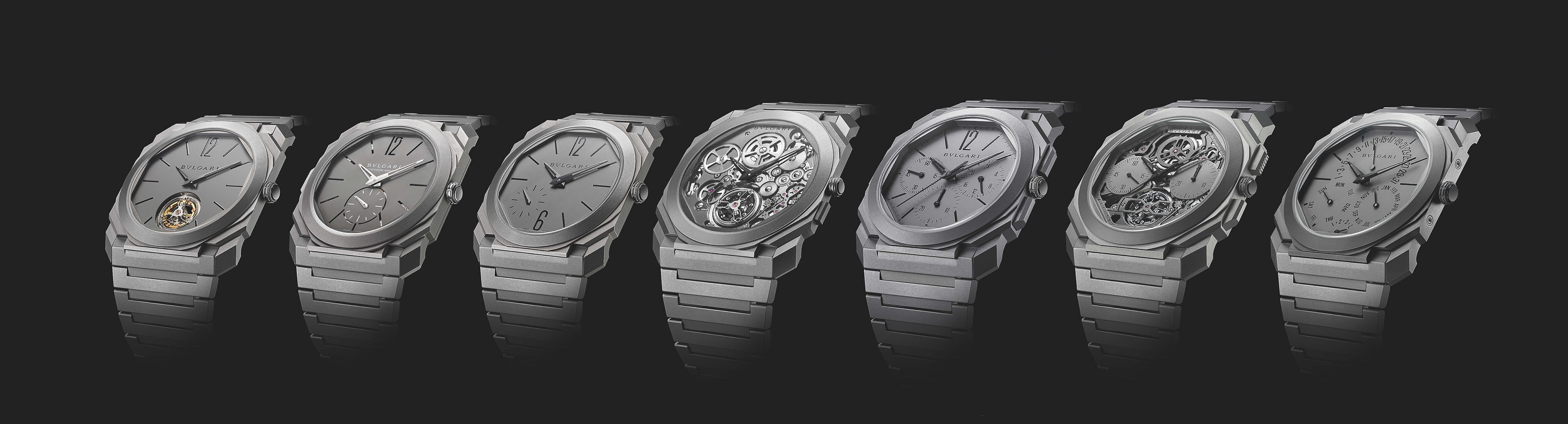 ワールドレコードを樹立した7つのオクト フィニッシモ。左から、トゥールビヨン、ミニッツリピーター、オートマティック、トゥールビヨン オートマティック、クロノグラフ GMT、トゥールビヨン クロノグラフ、そして今年の衝撃作パーペチュアルカレンダー。