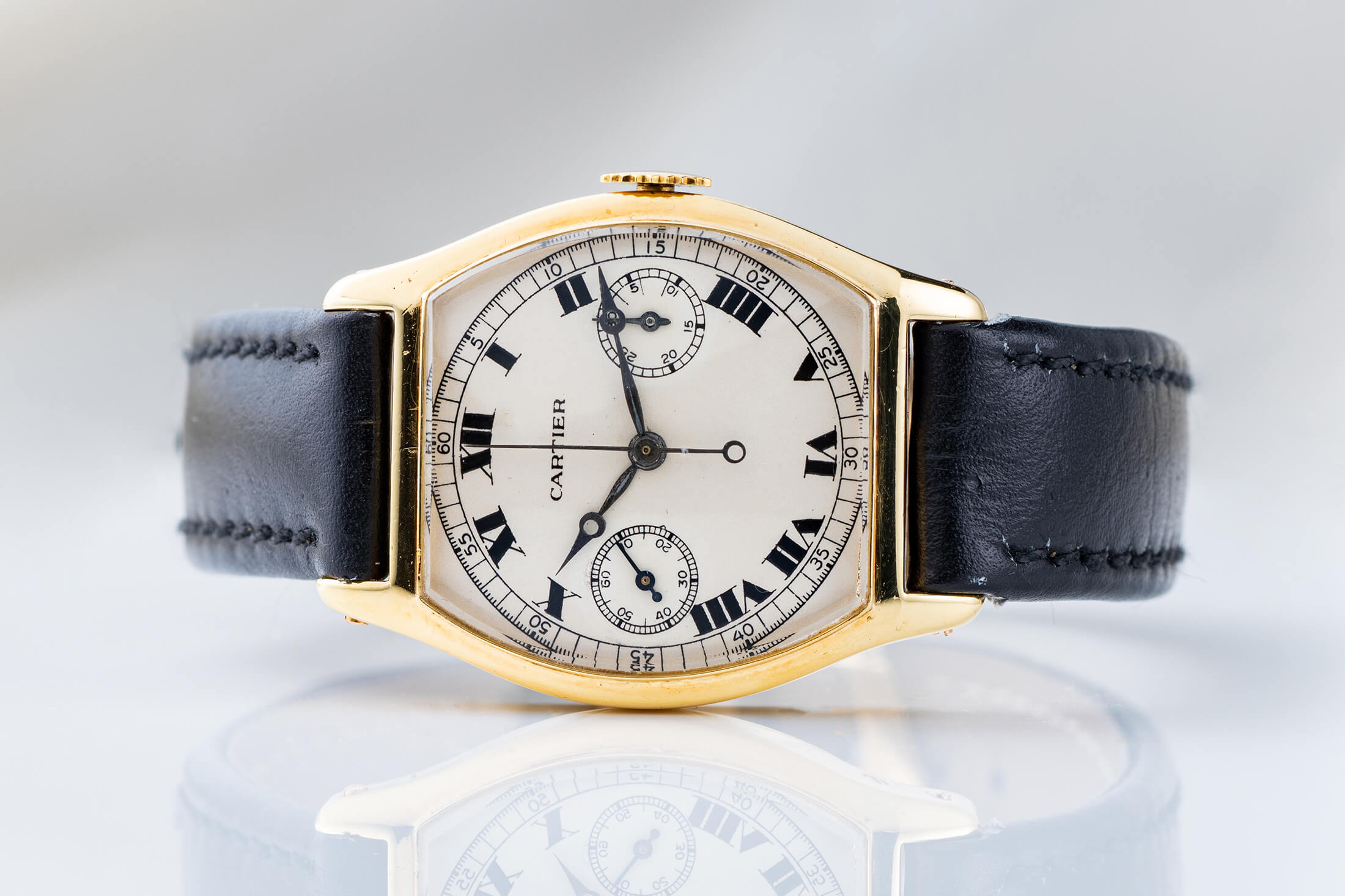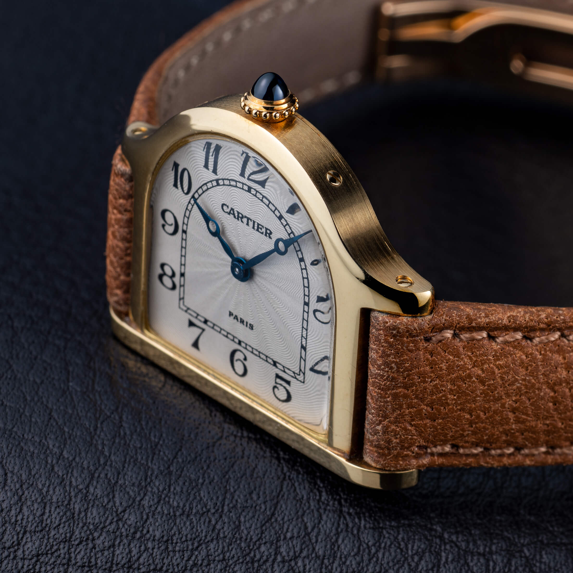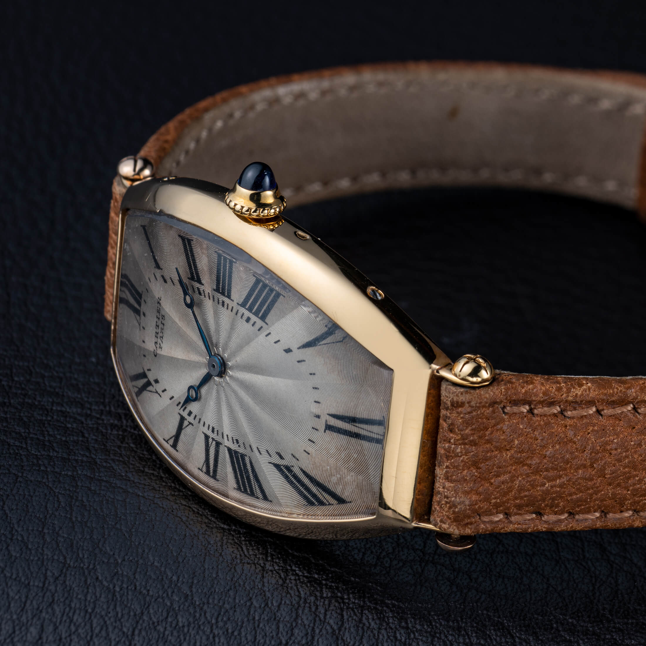 現行コレクションとほぼ変わらぬスタイルを持つ「トノー」ウォッチ。初期の量産型腕時計として製作され、カルティエウォッチのアイデンティティでもあるリューズに配されたサファイアカボションの先駆けともなった。ファーストモデルの誕生は1906年だが、これは1911年にカルティエ パリで製作されたもの。現行モデルのダイヤルには繊細なサンレイエフェクト装飾を採用しているが、こちらの個体ではダイヤル中心部から外側に向かって放射状に広がるソレイユギヨシェ彫りが施されている。