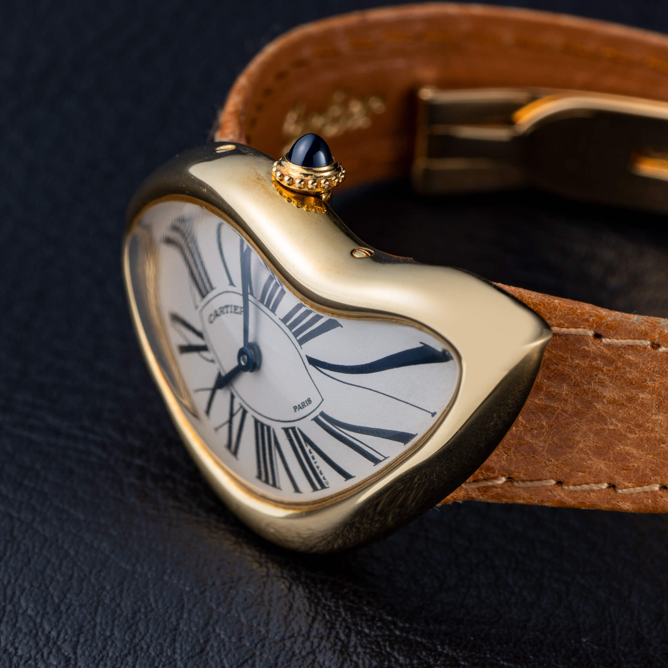 400本限定で1991年に復刻したモデル。「クラッシュ」ウォッチはアクシデントによって思いがけず変形してしまったカルティエウォッチを、カルティエ ロンドンがデザイン表現として取り入れたことから1967年に誕生した。ロンドンで生まれたモデルでダイヤルに“London”の文字がプリントされたものが有名だが、この個体は“PARIS”表記のカルティエ パリ製。これまでコレクターの関心はコレクションが誕生した当時の初期モデルなどが中心だったが、同じ1990/91年に製造された“ロンドンダイヤル”モデルはオークションで高値をつけた。比較的新しいポストヴィンテージ・カルティエに対する関心の高まりを示す好例である。