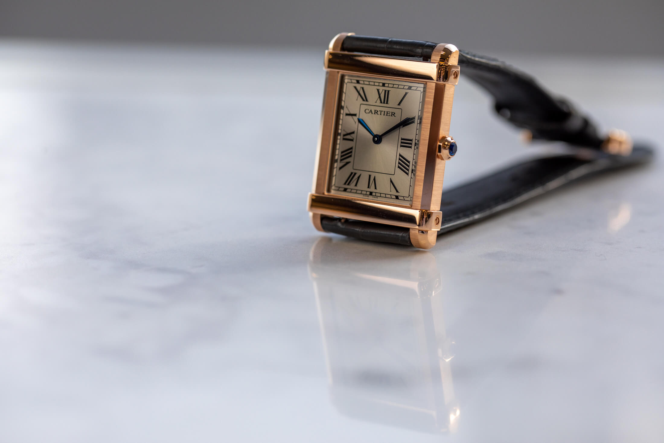インデックスのローマ数字は細くシェイプされ、ベーシックなタンクより大きくとられた文字盤に対して余白を持たせながら配されている。CARTIERのロゴも同様で、通常よりやや細いフォントに変更されている。