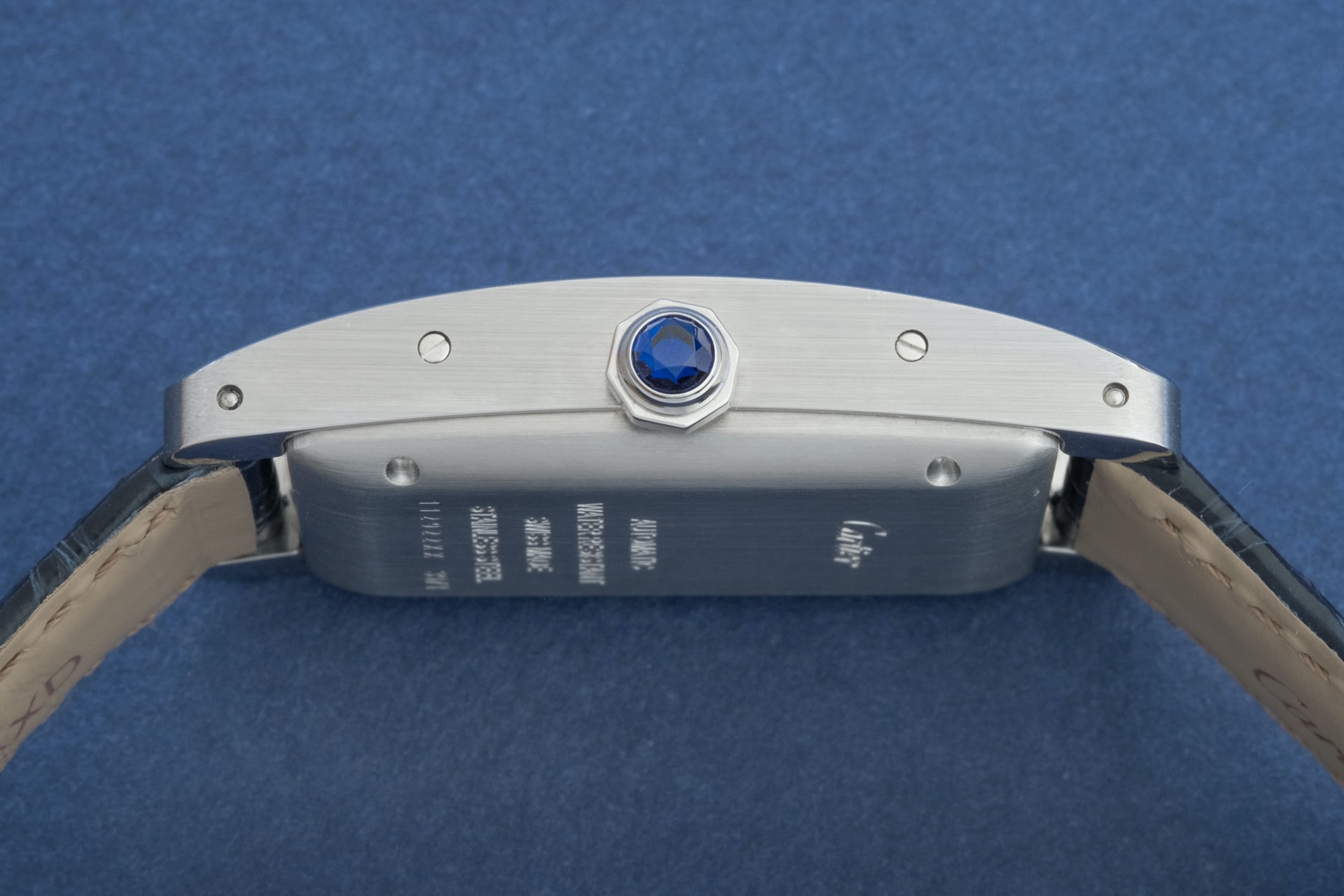 ベーシックなフォルムの奥には、サンバースト仕上げの鮮やかなダイヤルが控えています。期待された全てがそこに完全に残されています‐放射状に配置されたブラックのローマ数字、数字の7に隠された“Cartier”のサイン、上下にカーブしたチャプターリングなど。また、伝統的な2針ではなく、3本めのブルースティール針がついていることにも気づくでしょう。これは、自動巻きムーブメントを搭載していることを示す、ランニングセコンド(秒針)です。