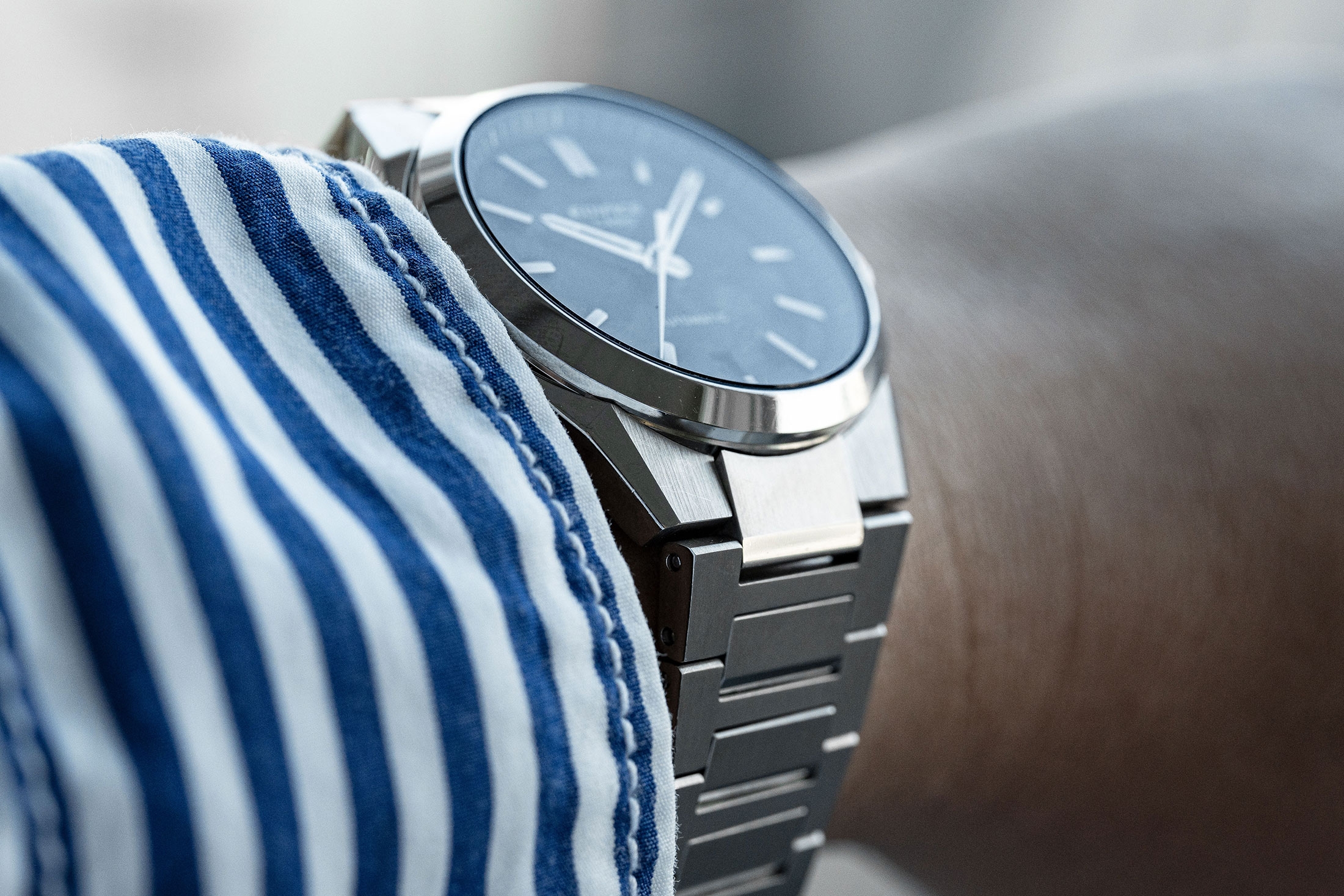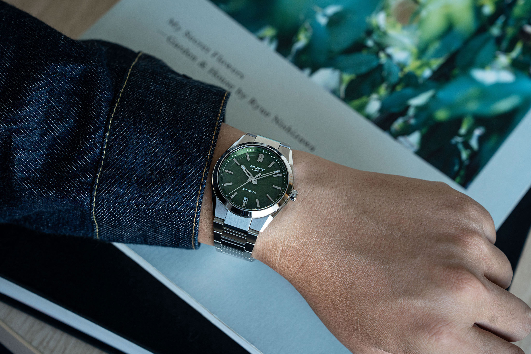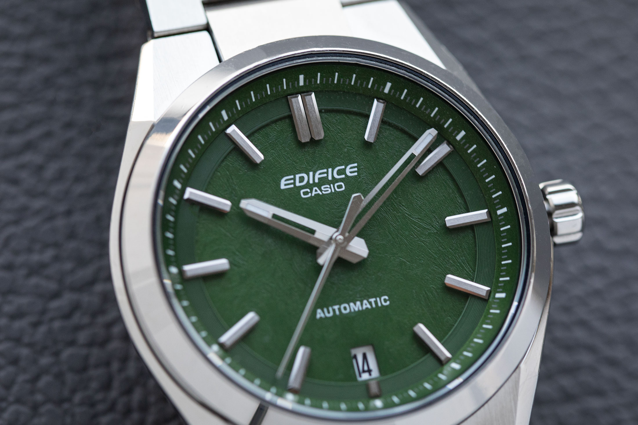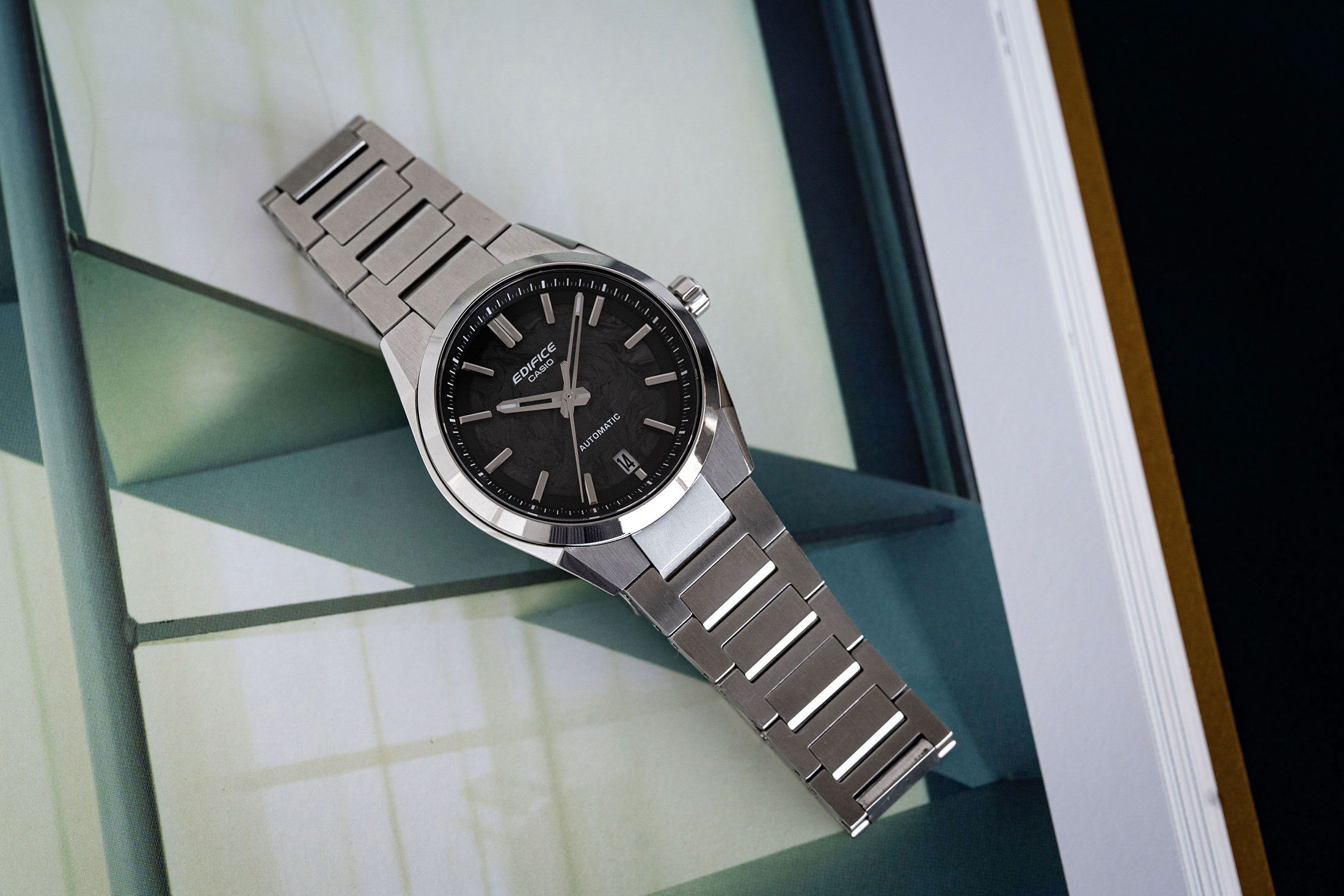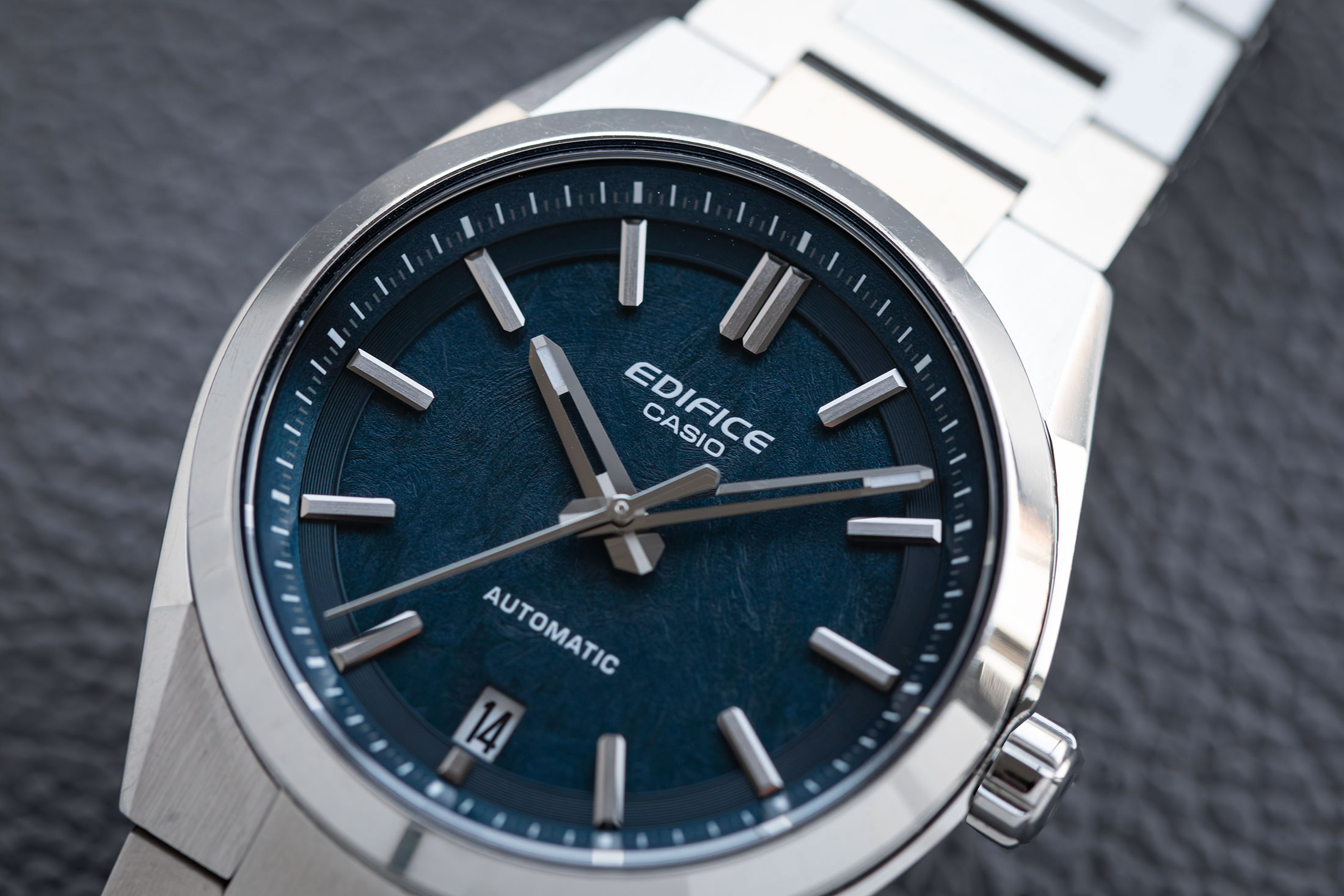 さらに外装に目を向けると、エッジの効いた造形が確認できる。サイドの流麗なラインと複数の面で構成されるケースは、都会的なクルマのデザインに着想を得たものだという。とりわけSS製のモデルにおいては、ケース、ブレスレットともにヘアラインとポリッシュの磨き分けを行い、立体感を表現しつつもソリッドな印象を強めている。「機械式ムーブメントを搭載しつつも、デザインはメカメカしさよりモダンさを意識しました」。そして小島氏は、風防をなぞりながら次のように続ける。「外装においても、同価格帯での競争力は強く意識しています。サファイアクリスタルの採用もそのひとつですし、ケース、ブレスレットのエッジと仕上げは特に心を砕いた場所です」。これもまた、カシオの他ブランドで培われた外装技術によって実現したもので、他社の同価格帯モデルに比肩する仕上がりを見せている。