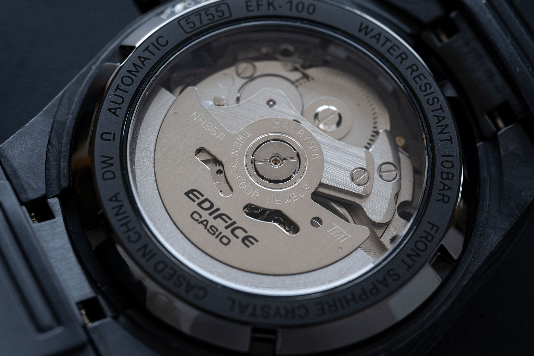 本作は、エディフィスのブランドとしての幅を広げるための取り組みから始まった。しかし一方ではエディフィスにふさわしい価格帯を維持することも絶対とされ、さらには機械式時計のエントリーモデルとしても選択肢に加えてほしいという願いから、搭載する動力機構には他社製の汎用ムーブメントが選ばれた。スケルトンバックから覗くムーブメントを確認すると、採用されたのはTMI製のCal.NH35Aのようだ。「企画時にはすでに他社からも手ごろな価格の機械式時計が出揃い、評価を受けている状況でした。そのためムーブメントの選定においては、まずは機能の面でそれらに負けないことが条件となりました」と、小島氏は本作で目指したスペックについて語る。Cal.NH35Aは日付表示と秒針停止機能が付いたスタンダードな3針の自動巻きムーブメントで、振動数は2万1600回/時、パワーリザーブも約40時間を保持するなど、同価格帯の他社製モデルと比べても遜色のないスペックを有している。