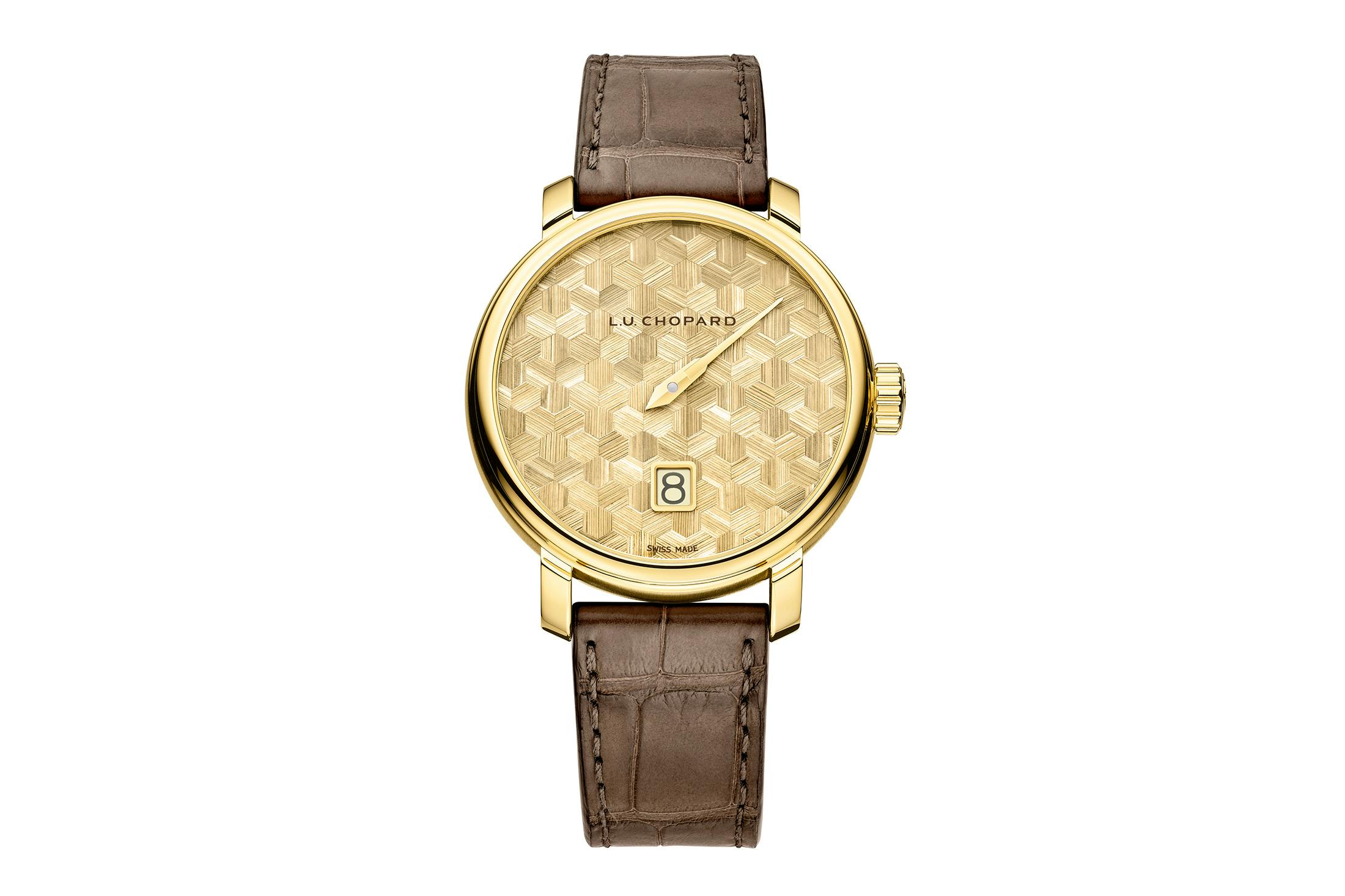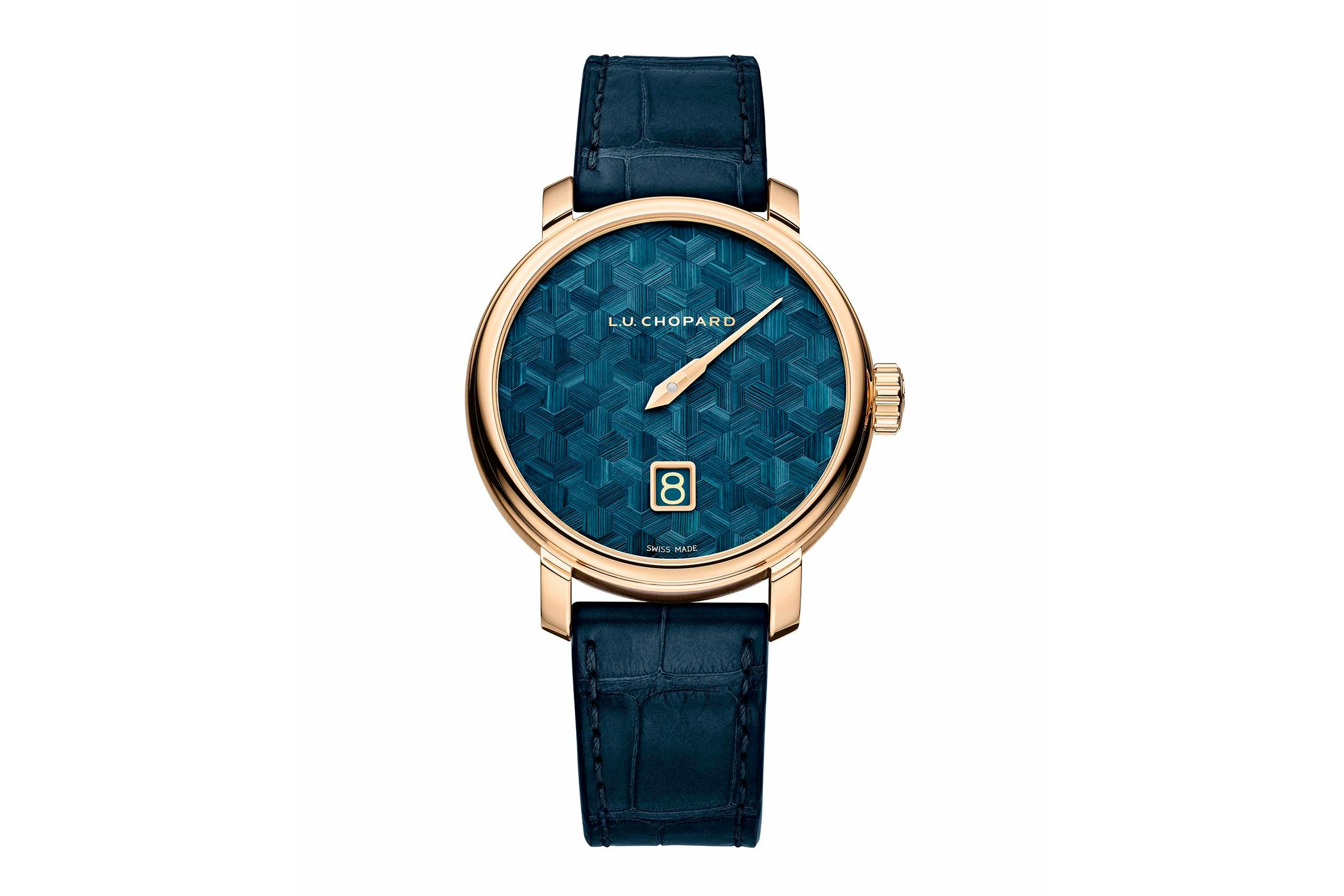 特徴は、既存モデルとはひと味違う鮮やかな色彩を取り入れた点だ。新たな18KエシカルYGケースモデルでは素材である麦わら本来の、着色や加工が一切されていないナチュラルカラーのストローマルケトリー(麦わら寄木細工)を採用。一方、18KエシカルRGケースではディープブルーを取り入れた。素材も変わらず、フランス産ライ麦を1本ずつ裂いて組み上げており、ハニカムモチーフは、創業者ルイ-ユリス・ショパールが重んじたミツバチから着想を得たものだ。よりはっきりとした色使いが目を楽しませてくれる新作と言えよう。