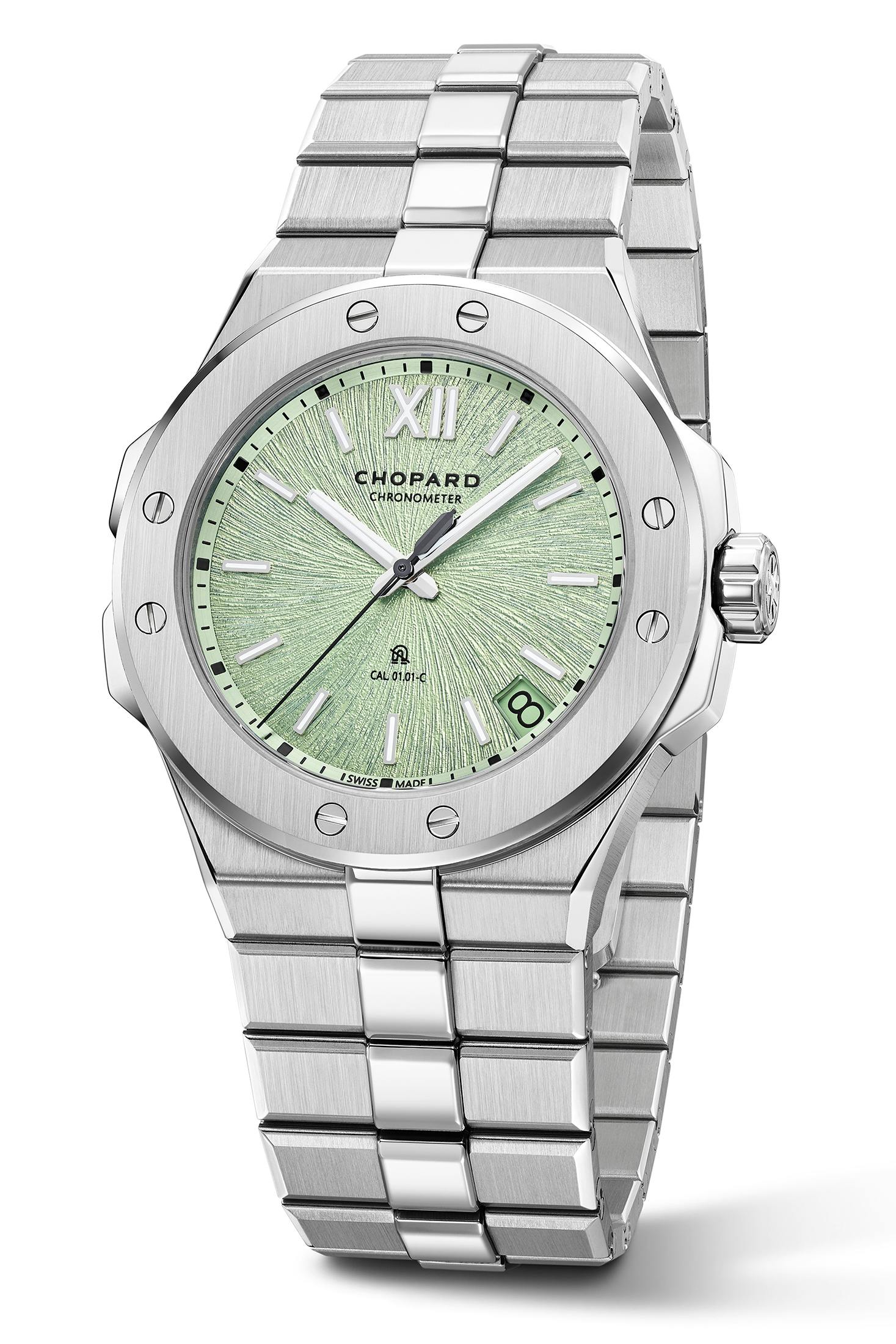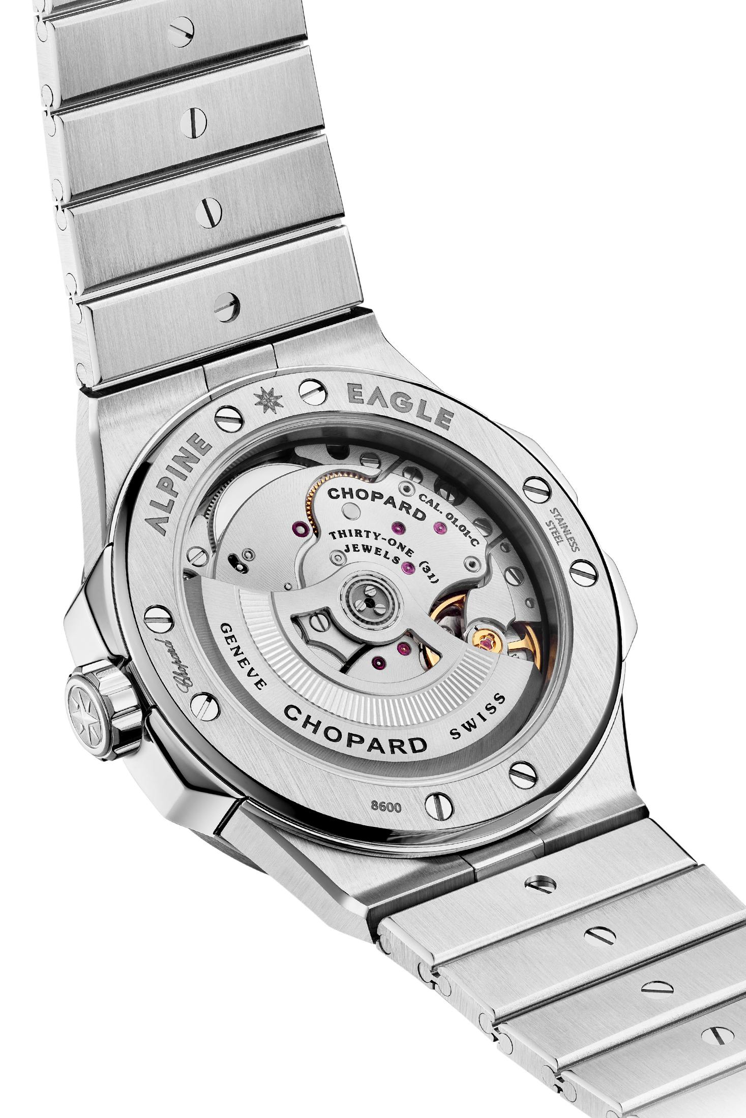 耐磁の中核となるのは、非磁性ヒゲゼンマイを備えた自動巻きムーブメント Cal.Chopard 01.01-Cだ。キャリバーナンバーだけをみると、既存の41mmモデル、ラージサイズのアルパイン イーグルに搭載されてきたムーブメントと変わらない。さらにCOSC認定クロノメーター、約60時間パワーリザーブ、ストップセコンド付きという基本性能も、既存モデルと同じだ。しかしメゾンは、新作では従来のヒゲゼンマイを搭載したムーブメントと比べて磁気感度を15分の1に抑え、磁気の影響がある環境でも精度と信頼性を維持できるようにしたことが、最も大きく進化したポイントだとしている。