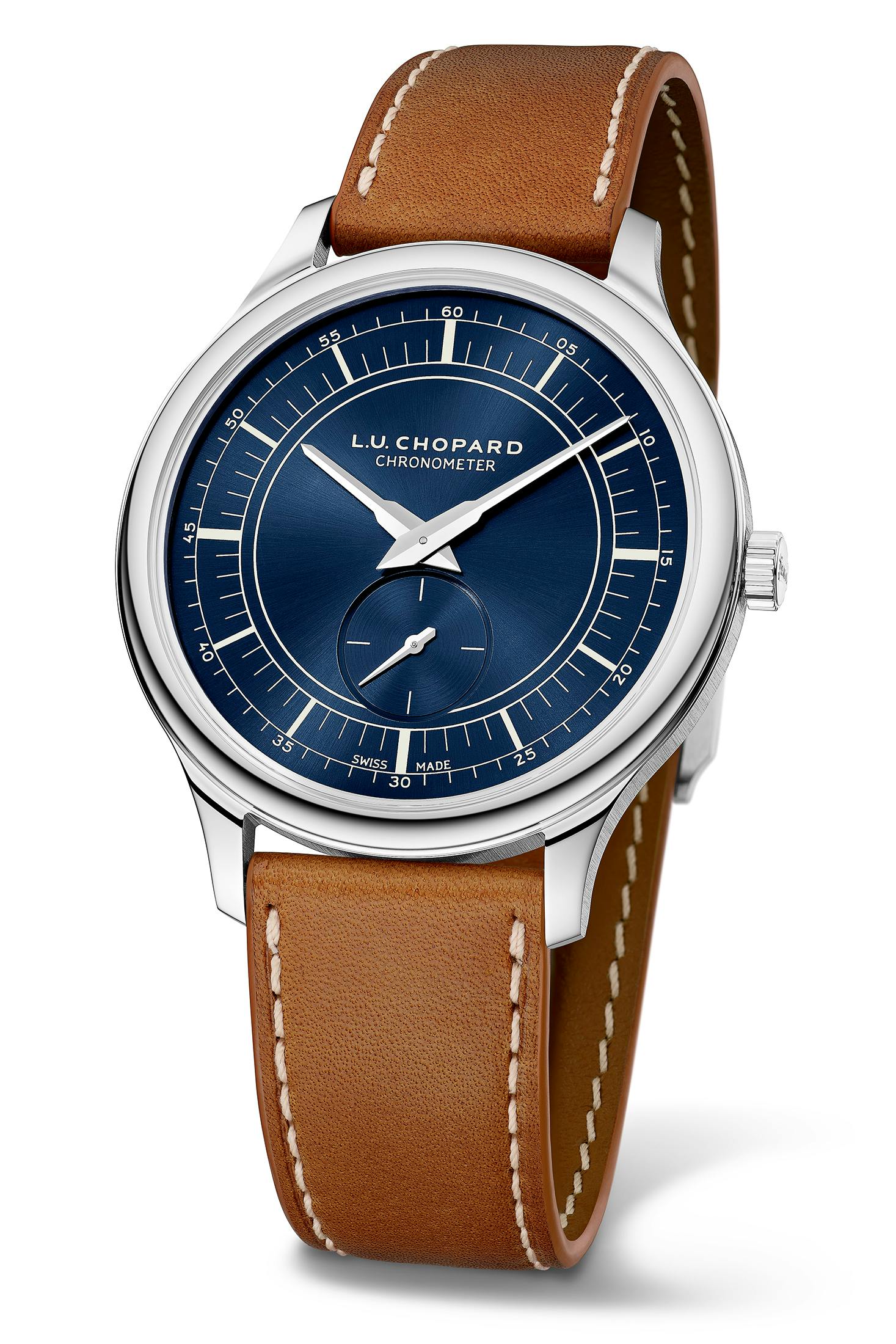 最大のポイントは、“プルシアンブルー”と名付けられた新しいカラーのダイヤルだ。ショパールはこのカラーについて、17世紀当時のプロイセン王国の首都であったベルリンの染物商人によって偶然発見された深く濃密な色彩であり、ショパールが30年前に設立したマニュファクチュールのあるフルリエを擁するヌーシャテル州の独特な歴史に敬意を表するものだとしている。プルシアンブルーについて付け加えると、これは1704年に前述の染物商人によって発見された、深い青色を持つ化学合成によって作られた初の合成顔料である。葛飾北斎が浮世絵で使用した“ベロ藍”としても知られ、着色力が強く、従来の植物性染料にない鮮明で耐光性のある青色を特徴とする。