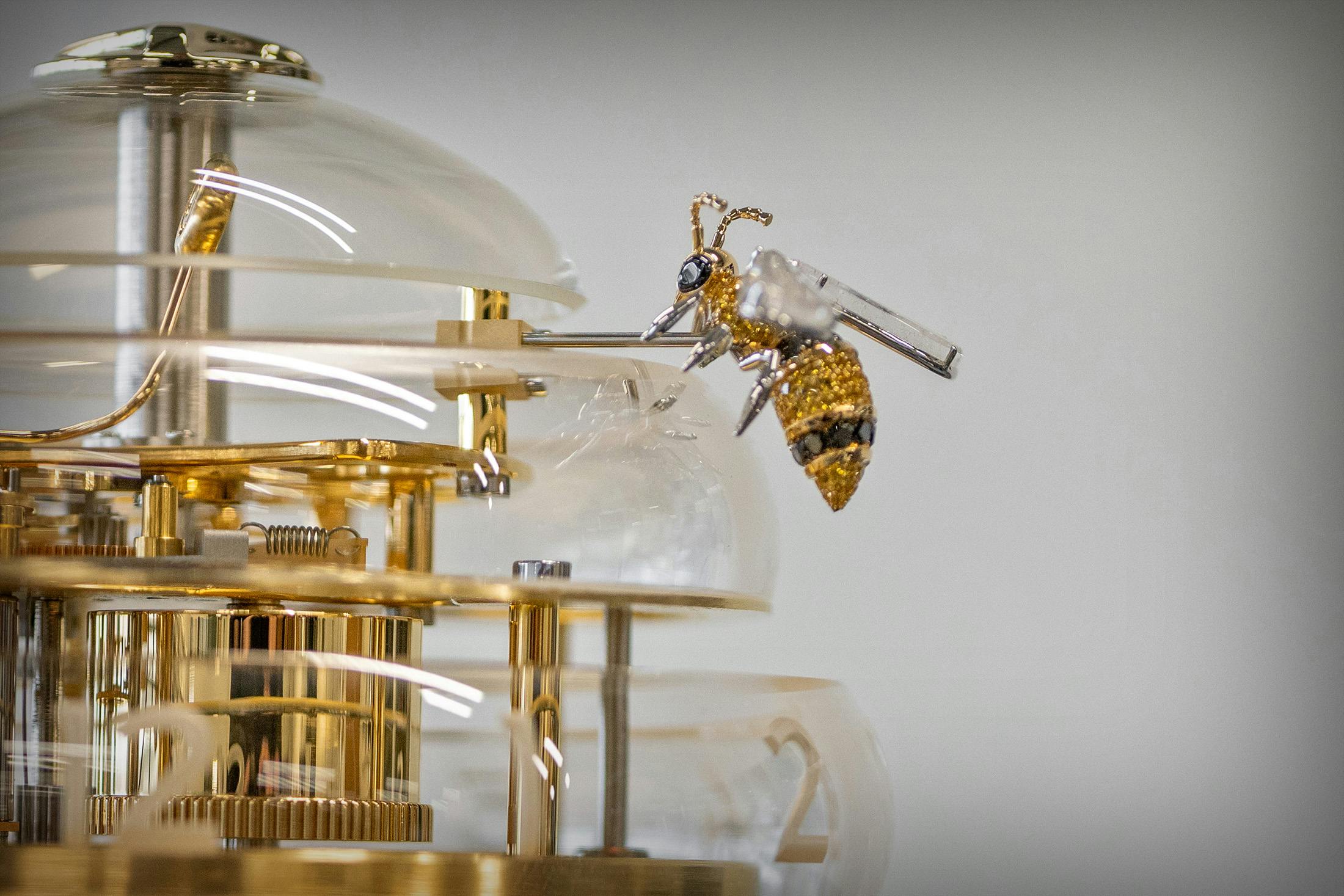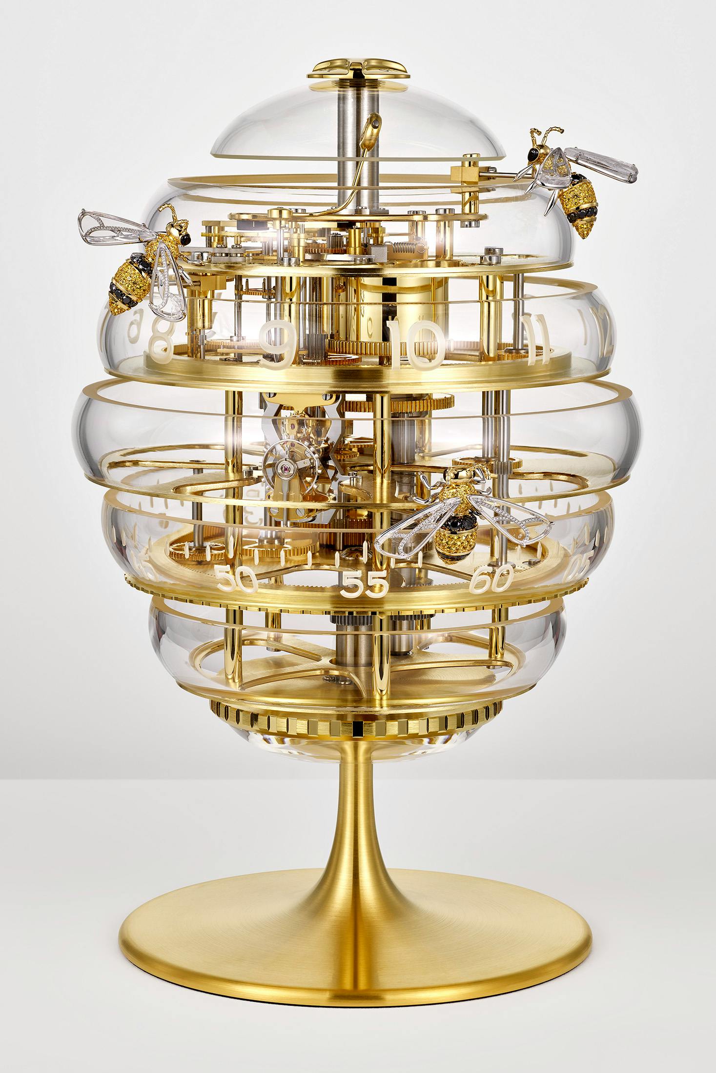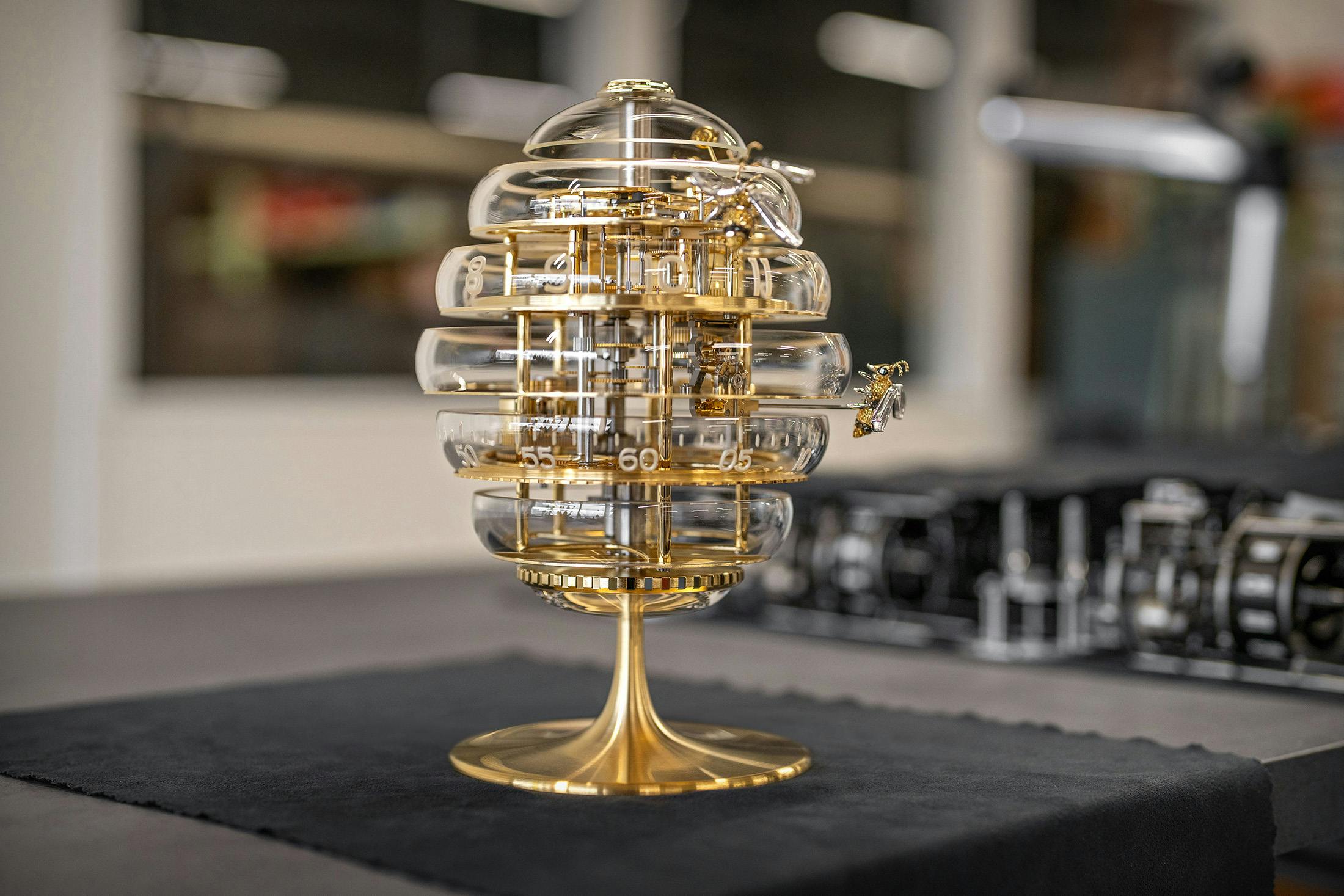 最大の特徴は、チャイミング機構が搭載されている点だろう。そしてクロックの造形、時刻表示、そして報時機構のすべてが“ビーハイブ(ミツバチの巣)”というテーマと結びついているところもユニークだ。外装は高さ25.8cm、最大径16.5cmで、丸みを帯びた7段のガラスリング(素材には透明度、耐熱性、硬度に優れたホウケイ酸ガラスを採用)で構成されており、多層構造の機械式ムーブメントを囲むように、ガルバニック加工を施した強化スティール製ベースで支えている。ガラス内側にエッチングによるマット仕上げの時・分インデックスを与え、透明な造形のなかでも視認性を確保。時刻表示は一般的な針ではなく、18Kエシカルイエローゴールド製の3匹のミツバチ(ショイフレ家3世代を象徴するモチーフでもある)が行うが、2匹が時・分のマーカー、もう1匹がチャイミングモードの表示を担う。装飾モチーフがそのまま表示機構の一部になっているところも、本作のおもしろい点だ。