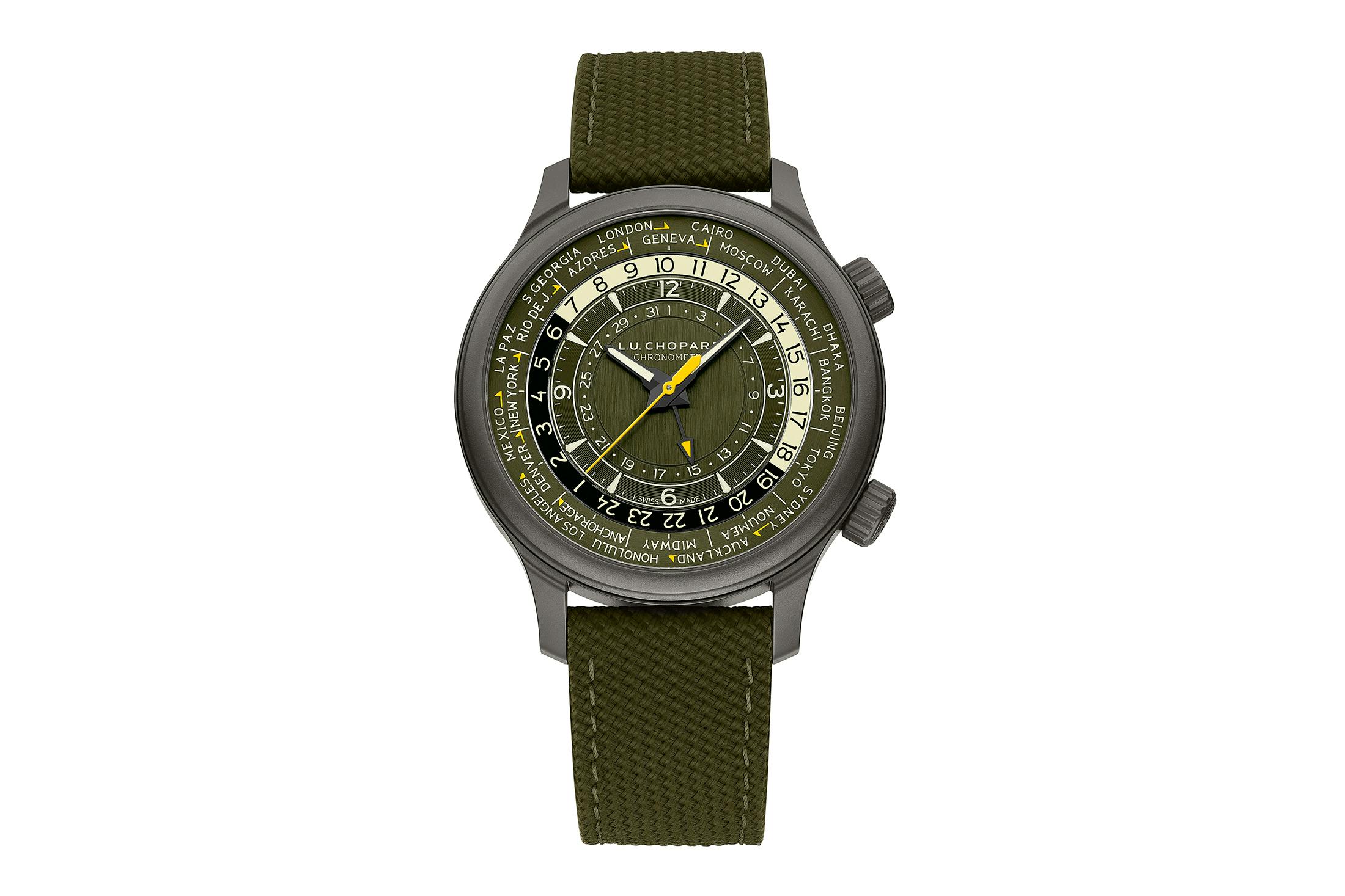 従来モデルもスポーティな意匠であったが、チタンの強度と羽根のような軽さ、そしてセラミック由来の硬度と耐傷性を兼ね備えるセラマイズドチタンをケースに、そして冒険心やミリタリーヘリテージから着想を得たというカーキグリーンのダイヤルを合わせることで、よりいっそう実用的でタフな性格となった印象だ。ショパールがこれまでワールドタイマーに採用してきた伝統的なブラック、ブルー、シルバーのカラースキームとは一線を画す、新たな個性を表現した1本。なお、本作は世界限定250本のリミテッドエディションとなっている。