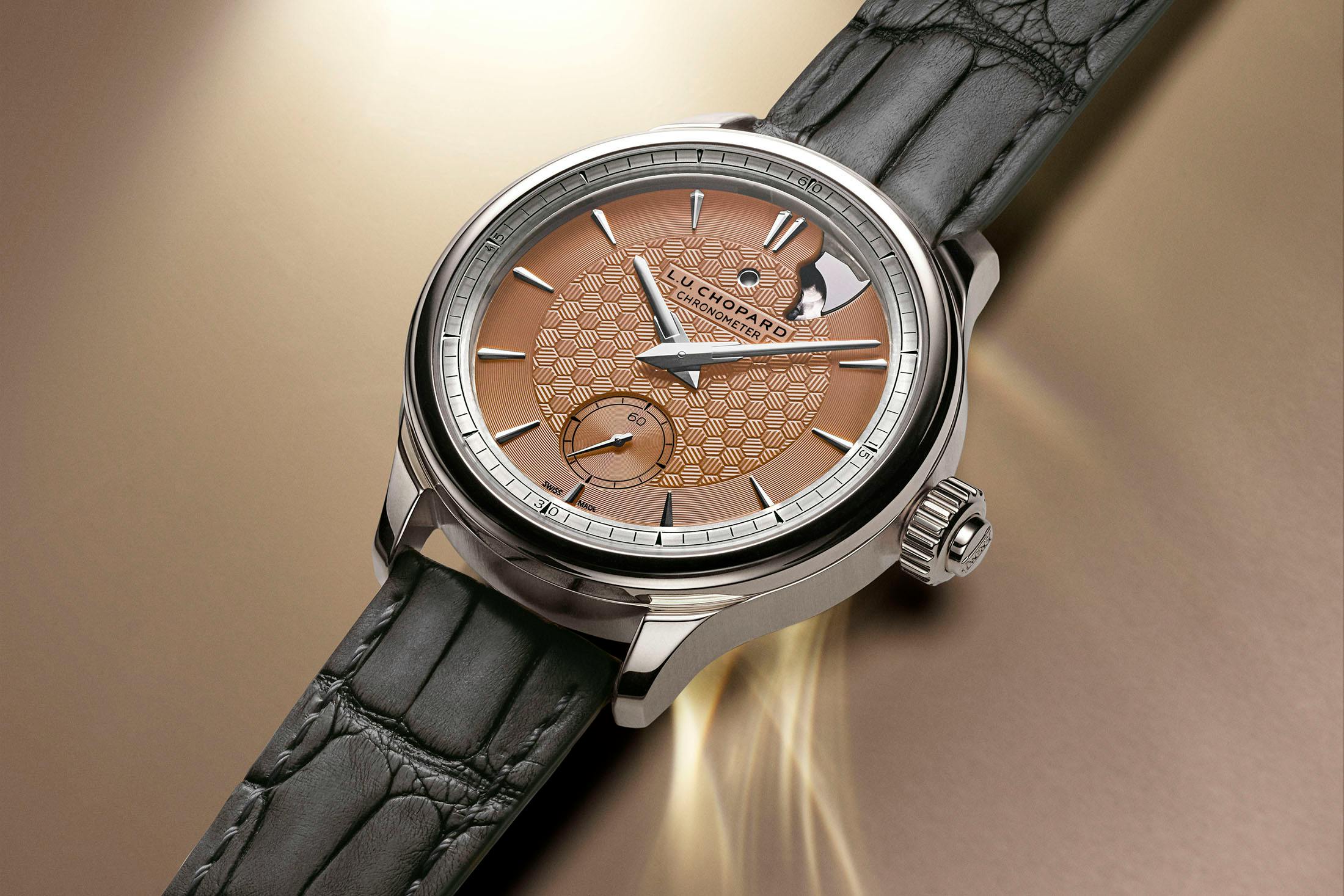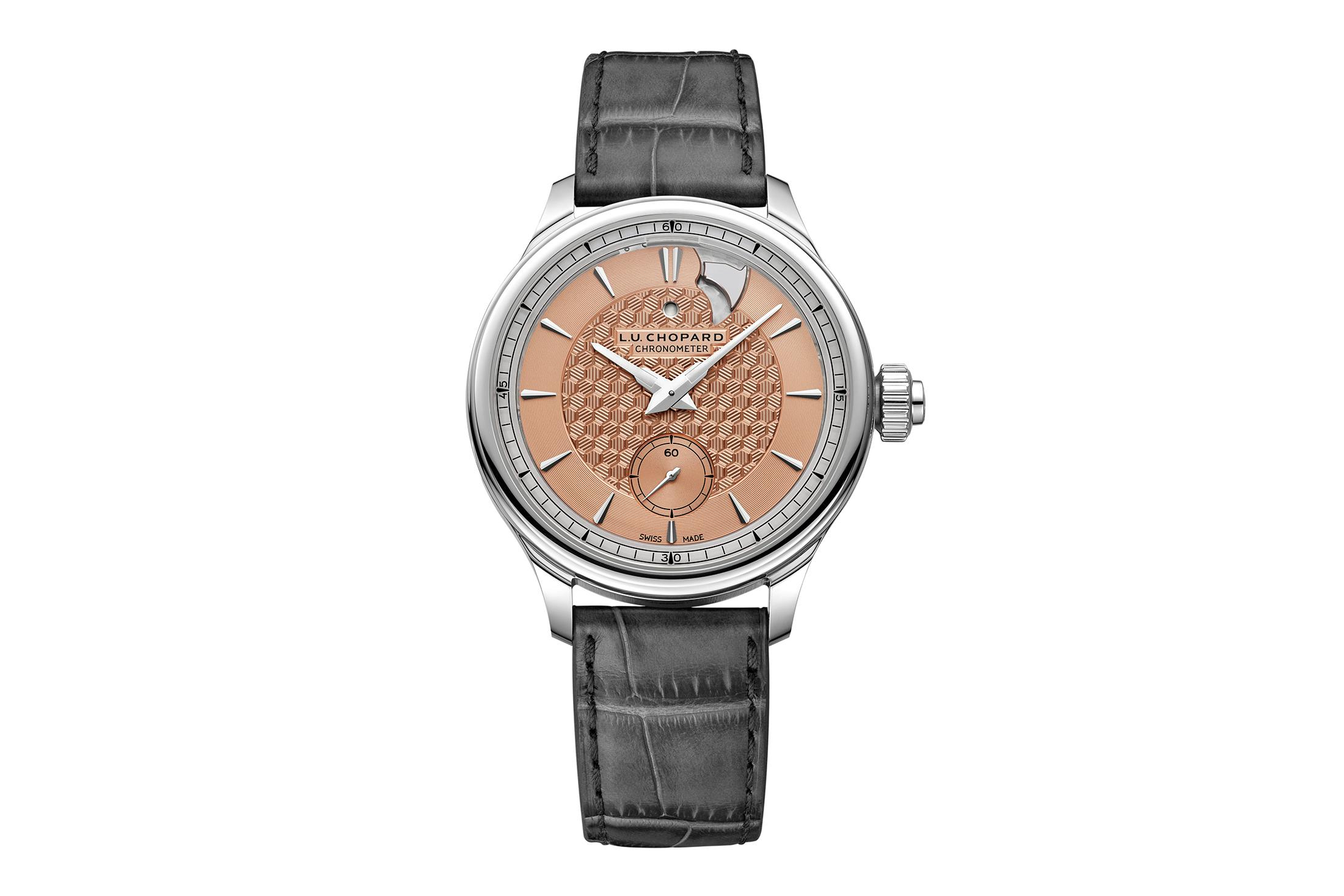 サーモンカラーのダイヤル、そしてケース素材はこれまでと異なるものだが、ダイヤル素材やデザインはこれまでのものを踏襲。18Kエシカルローズゴールド製のダイヤルに、ハニカムパターンのハンドギヨシェ装飾を施し、12時位置の作動表示を設けるなど、音響技術と審美性を高次元で両立している。既存のL.U.C ストライク ワンの系譜を受け継ぎつつ、素材や装着感を洗練させたアップデートモデルだ。