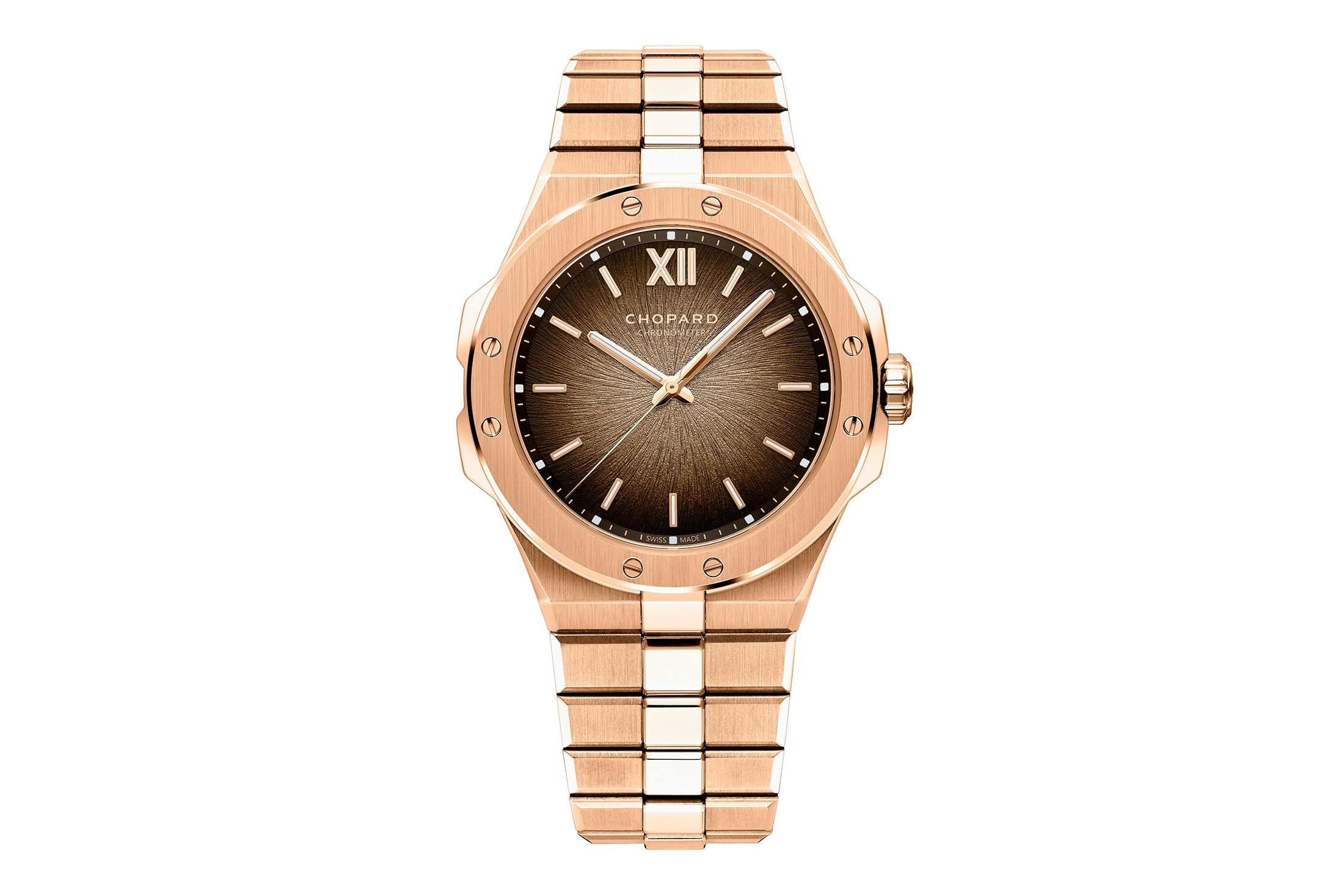 アルパイン イーグル 41 XP CSは、アルパイン イーグルにL.U.Cに見られる本格的な薄型オートオルロジュリーのコンセプトを持ち込んでいるのが特徴で、新作においては“シェイド オブ ウッド”ブラウンのグラデーションダイヤルが見どころだ。通常のアルパイン イーグルに見られるブルーやグレーを中心としたスポーティな印象のダイヤルと比べると、温かみと落ち着きを強めており、本作のグラデーションダイヤルは18KエシカルRGケースと相まって、プラチナの冷ややかなグラデーションと比べると、温かみのある印象を与える。