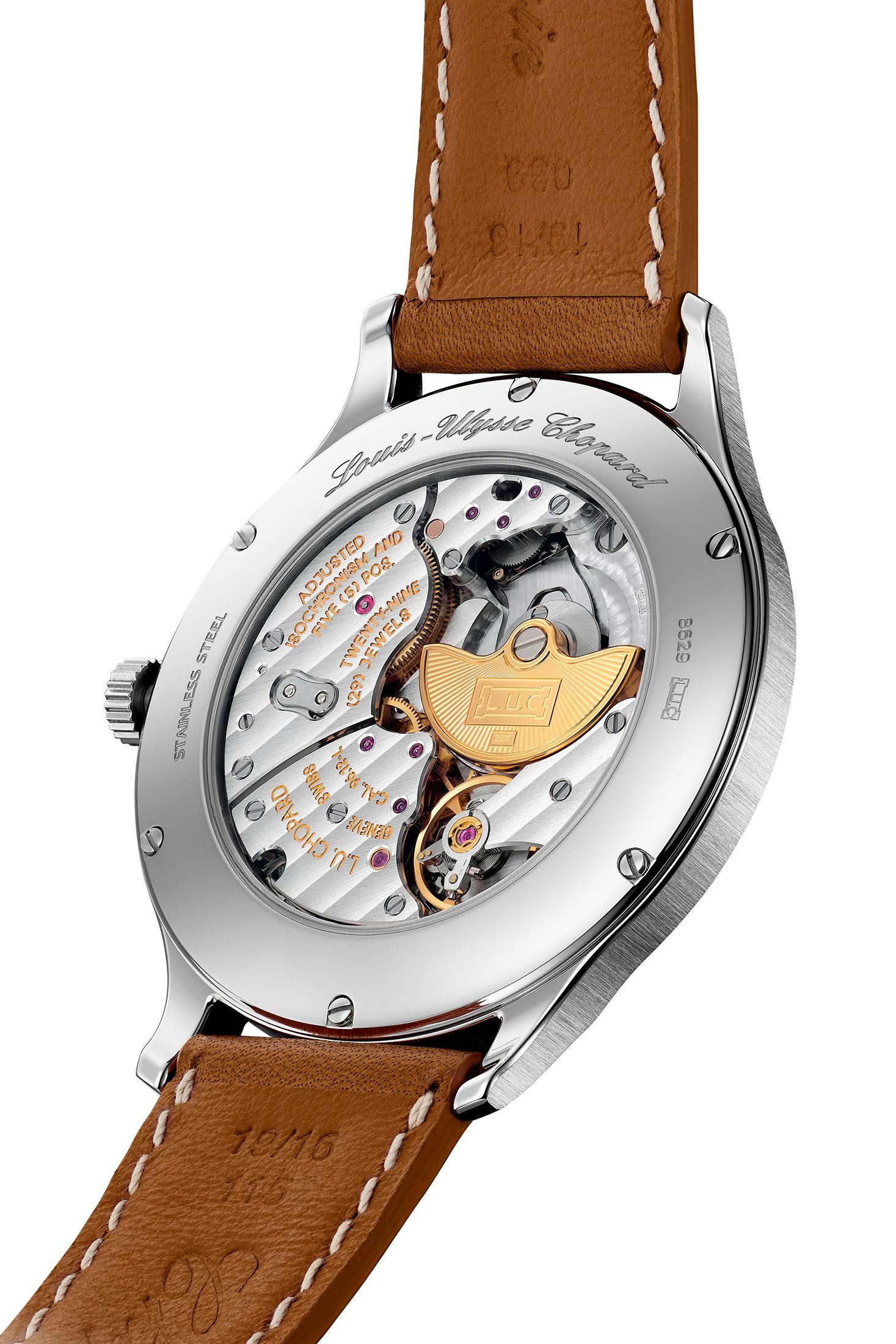 キャリバー:L.U.C 96.42-L。機能:時・分表示、センターセコンド、ストップセコンド機能。直径:27.4mm。厚さ:3.3mm。パワーリザーブ:60時間。巻き上げ方式:自動巻き。振動数:2万8800振動/時。石数:31。クロノメーター認定:あり、COSC認定クロノメーター。追加情報:ジュネーブ・シール、積載式二重香箱(ショパールツインテクノロジー)、コート・ド・ジュネーブ装飾を施したブリッジ、環状テンプ、スワンネック緩急針、フィリップス外端曲線のヒゲゼンマイ