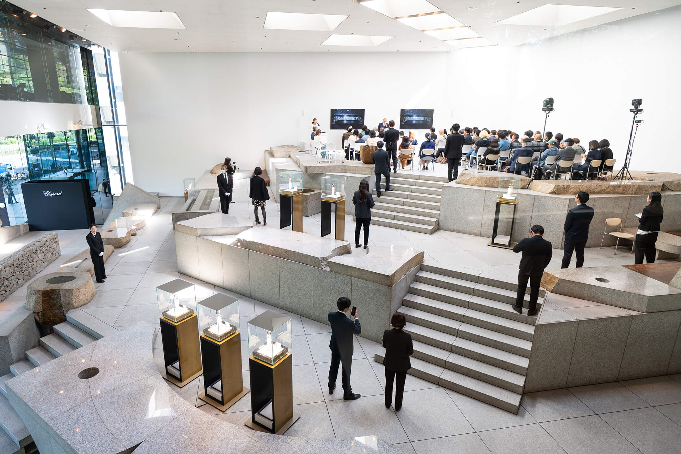 日本のモダニズム建築の巨匠、丹下健三が設計した草月会館。その1階部分を占めるのは、彫刻家や作庭家、インテリアデザイナーなどさまざまな顔を持っていた世界的アーティスト、イサム・ノグチによる石庭『天国』を有する大空間だ。© Chopard