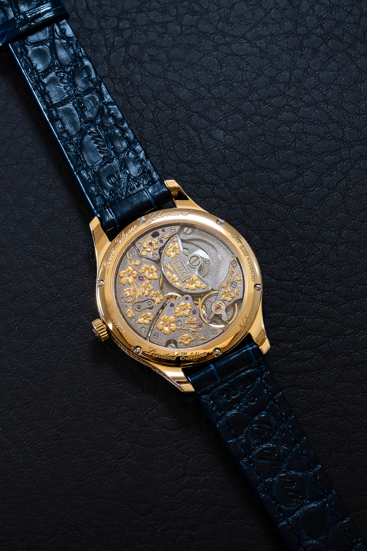 もちろんムーブメント側も抜かりがない。ショパール マニュファクチュールの職人によって受け継がれてきた伝統のフルリザンヌ彫刻技法を用いて、文字盤と同様に洗練された装飾が施された。ホワイトゴールド製のブリッジは、精巧な花を掘り込むキャンバスとなり、そのなかで桜のモチーフが際立つ。その表現はきわめて繊細で、エングレービング後、まずは全体に薄い金箔を施して花の周囲を丹念に削り取っていく。さらに周囲の表面にはドット模様を刻み、コントラストを生み出すことでゴールドをまとった桜の花々だけが浮かび上がるように仕立てた。こうして洗練されたツートンカラーのムーブメントとなるが、ブリッジの堅牢性を保ちつつ、その美しさを高めるために、わずか0.02mmの厚さの表面に細部に至るまで緻密な配慮がなされている。