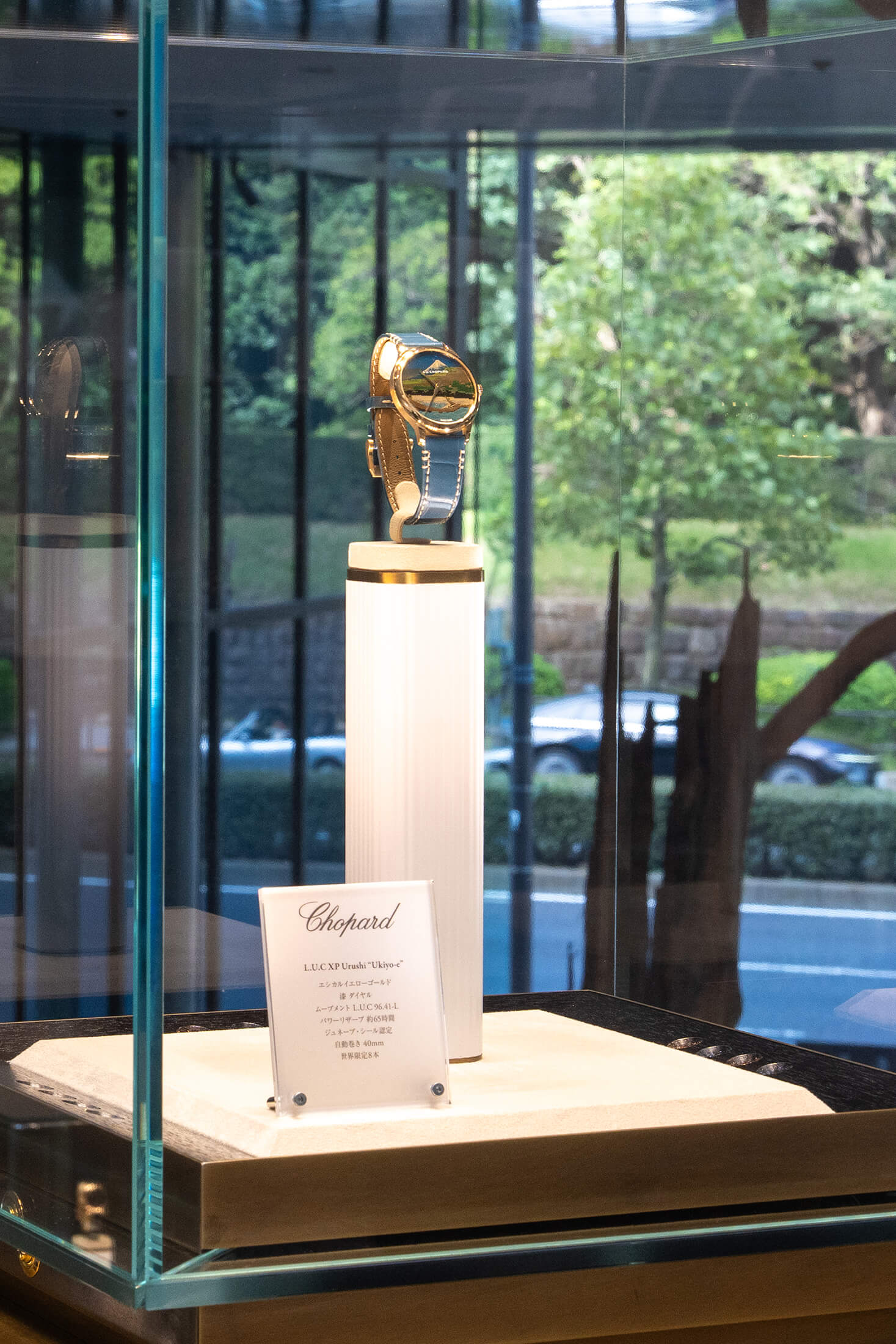 そのダイヤルは、1774年に創作された歌舞伎演目『二人椀久(ににんわんきゅう)』で、遊女松山太夫がまとう舞台着物にインスピレーションを得たもので、夜に輝く桜を模した精微なミニアチュールが、儚く移ろう生命の美を表現する。ショパールはこのモデルのためにメゾンが有する最高の職人技を結集。背景に繊細なギヨシェ装飾を施し、半透明のラッカーをコーティングすることで光の角度や強さによって刻々と変化する輝きを作り出し、幻想的な夜桜の雰囲気を描き出した。