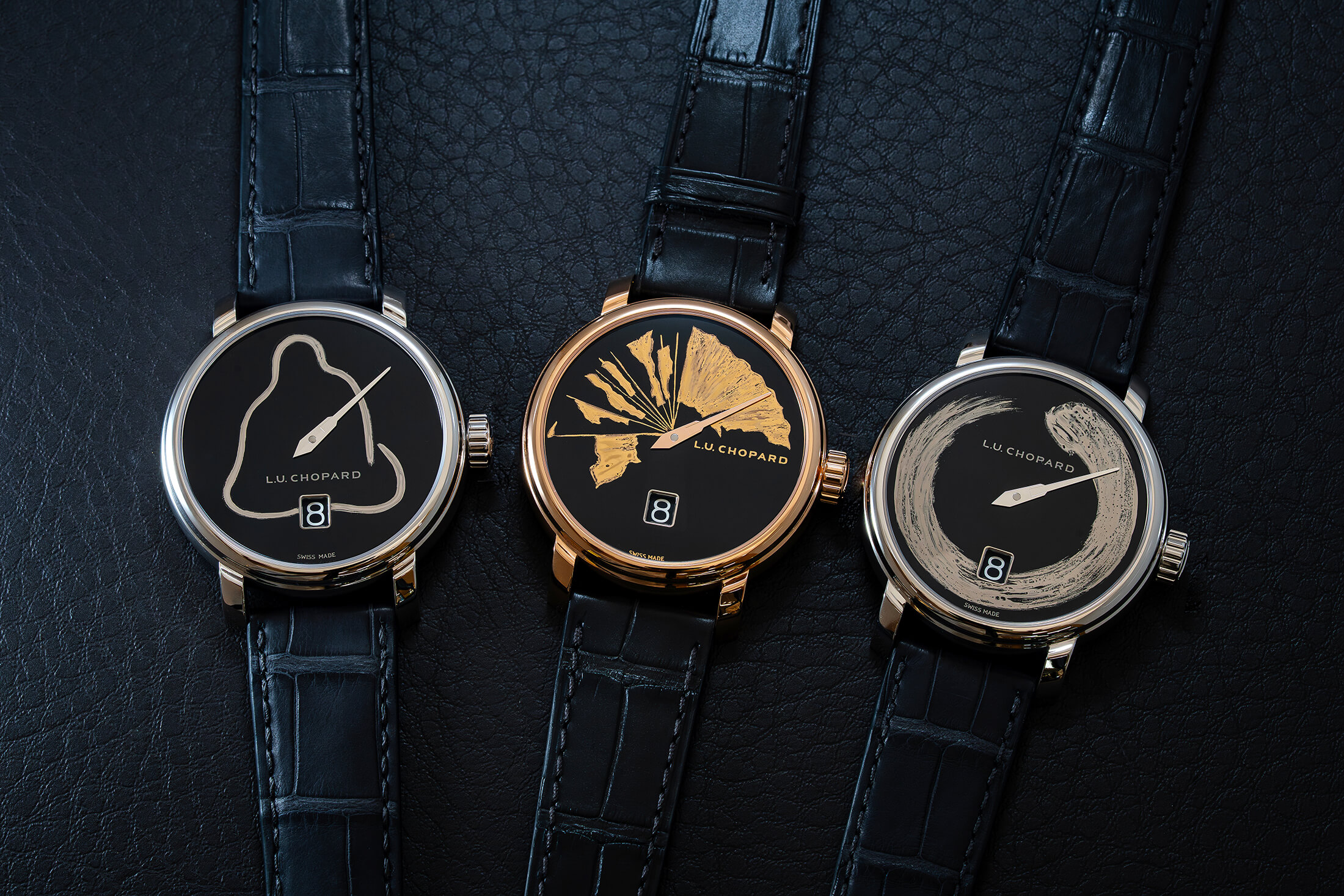 マニュファクチュールの熟練職人によるグラン・フー エナメルの技を通して、東洋と西洋の邂逅というテーマを表現したのが、この3作品。いずれもジャンピングアワー機構を搭載したL.U.C クアトロ スピリットをキャンバスとしている。すべてブラックのグラン・フー エナメルダイヤルを備えており、一見すると単なるダイヤルデザインバリエーションのようにも見えるが、内実はそれほど単純ではない。