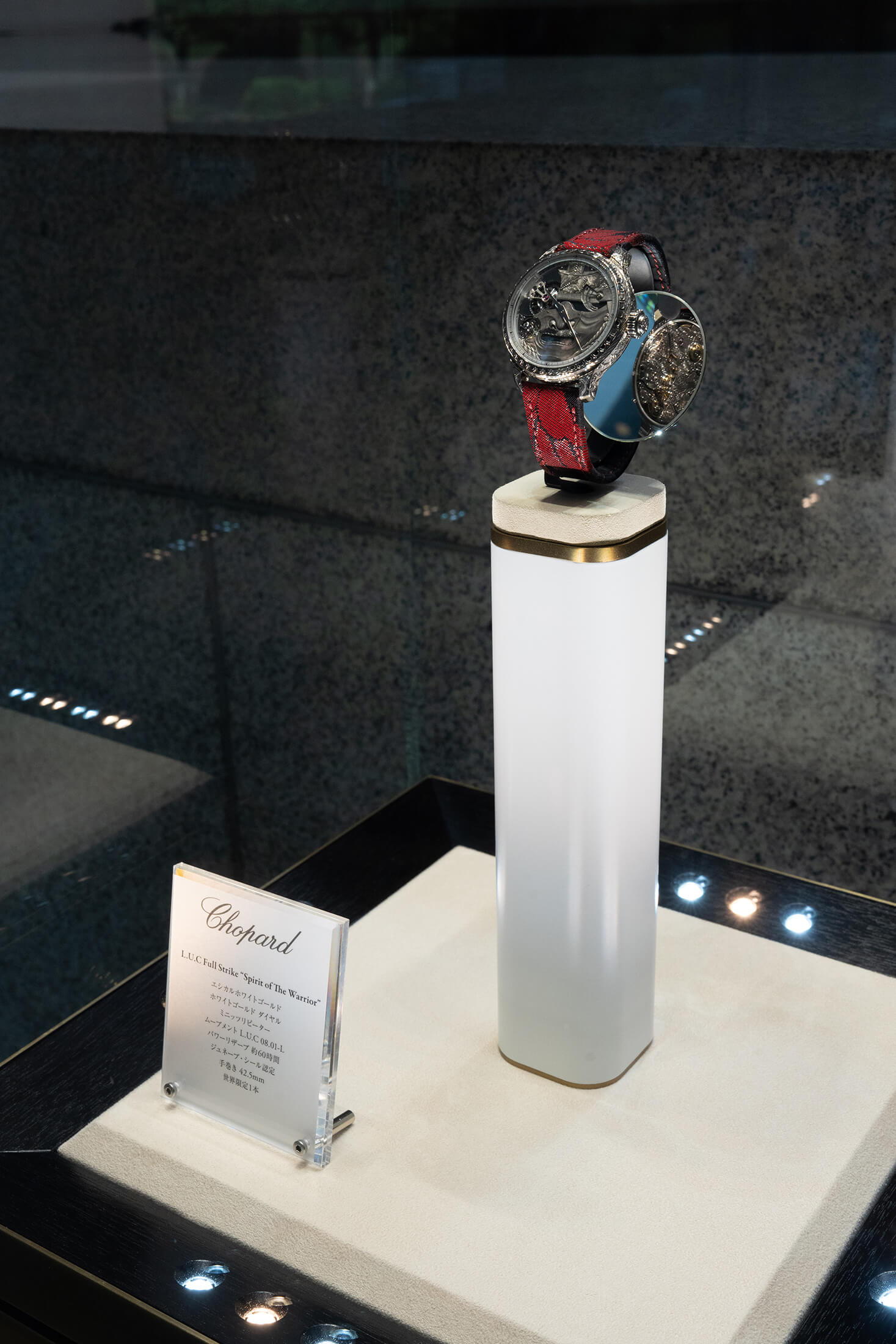 なんと言っても最も目を引いたのは、ユニークピースとなるL.U.C フル ストライク スピリット オブ ザ・ウォリアーだ。見てのとおり、侍の面頬(めんぽお、甲冑に付属した顔面を守るための防具)を大胆に表現したダイヤルが印象的だ。武士の世界観にインスピレーションを得たというこの時計は、ダイヤルのみならず、随所に施された手彫りのディテール装飾がストーリーを紡ぐ。