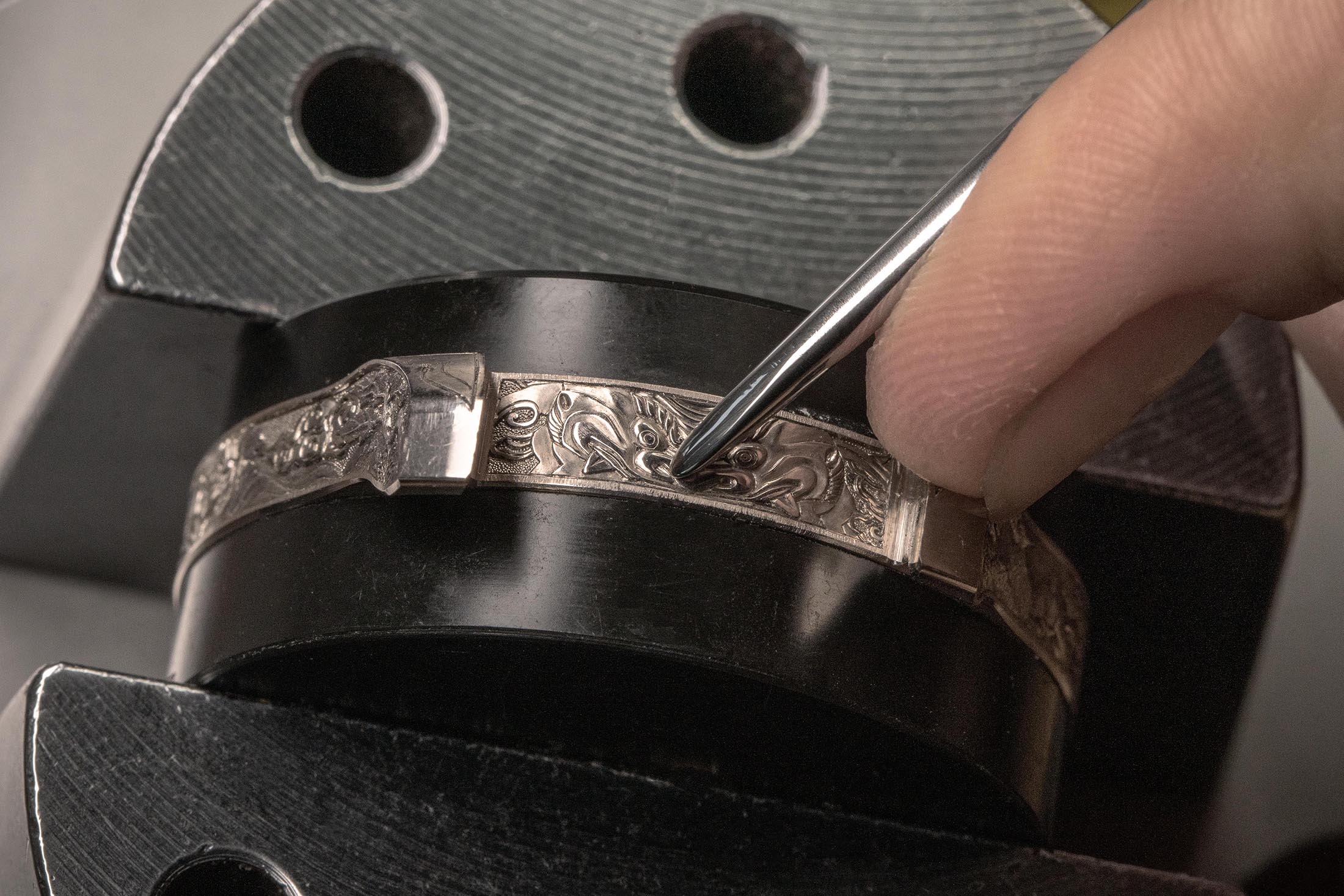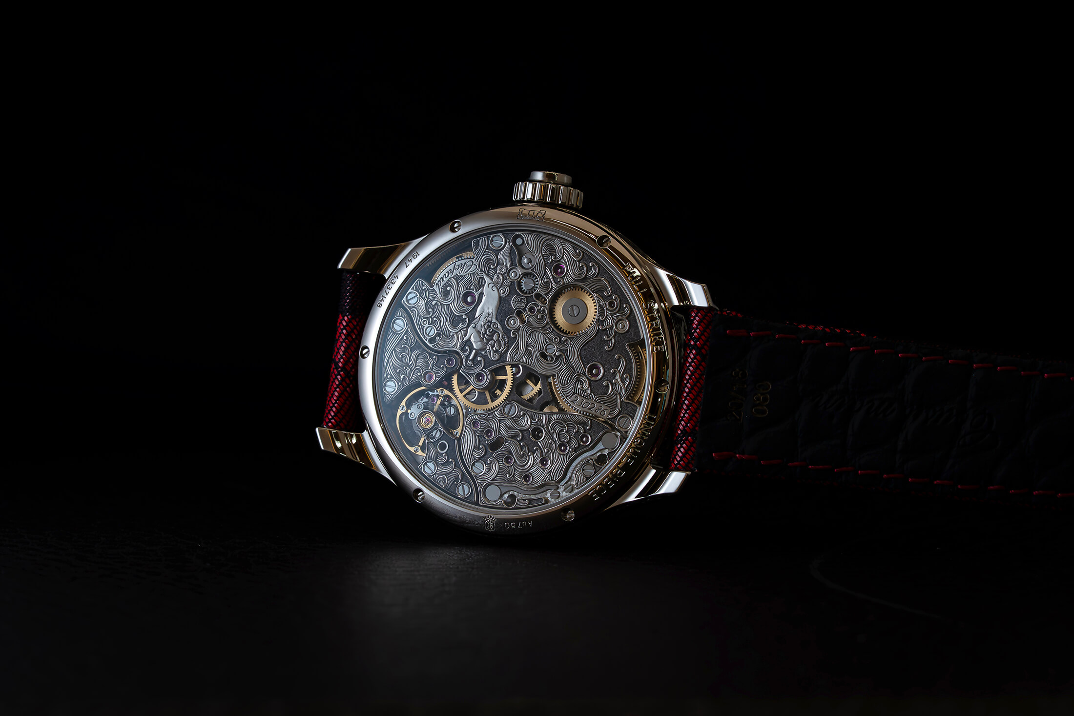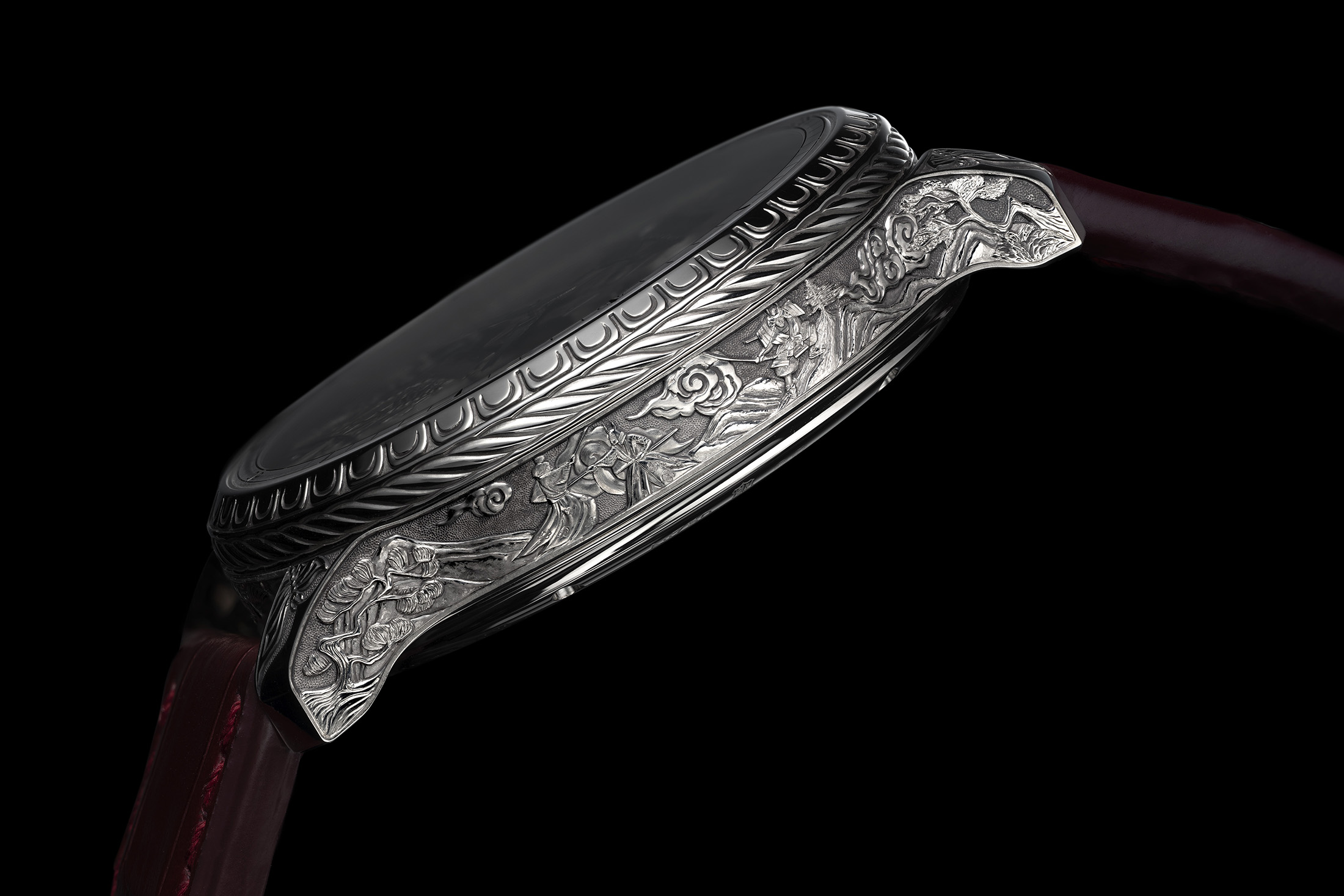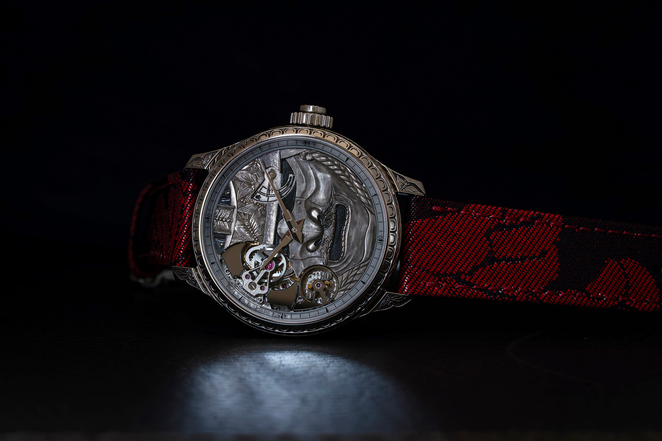 ケース側面には、瞑想する武士と琵琶を奏でる人物(3時側)と激しい戦闘シーン(9時側)が彫刻で表現されている。これは武道の規律と精神的探求との二元性を描き出したものだという。そしてラグのあいだには不気味な形相でありながら守護的な意味合いを持つ鬼の彫刻、ベゼルには伝統的な鎧の意匠である毛引縅(けびきおどし)や古(いにしえ)の仮面を彷彿とさせる装飾が施される。