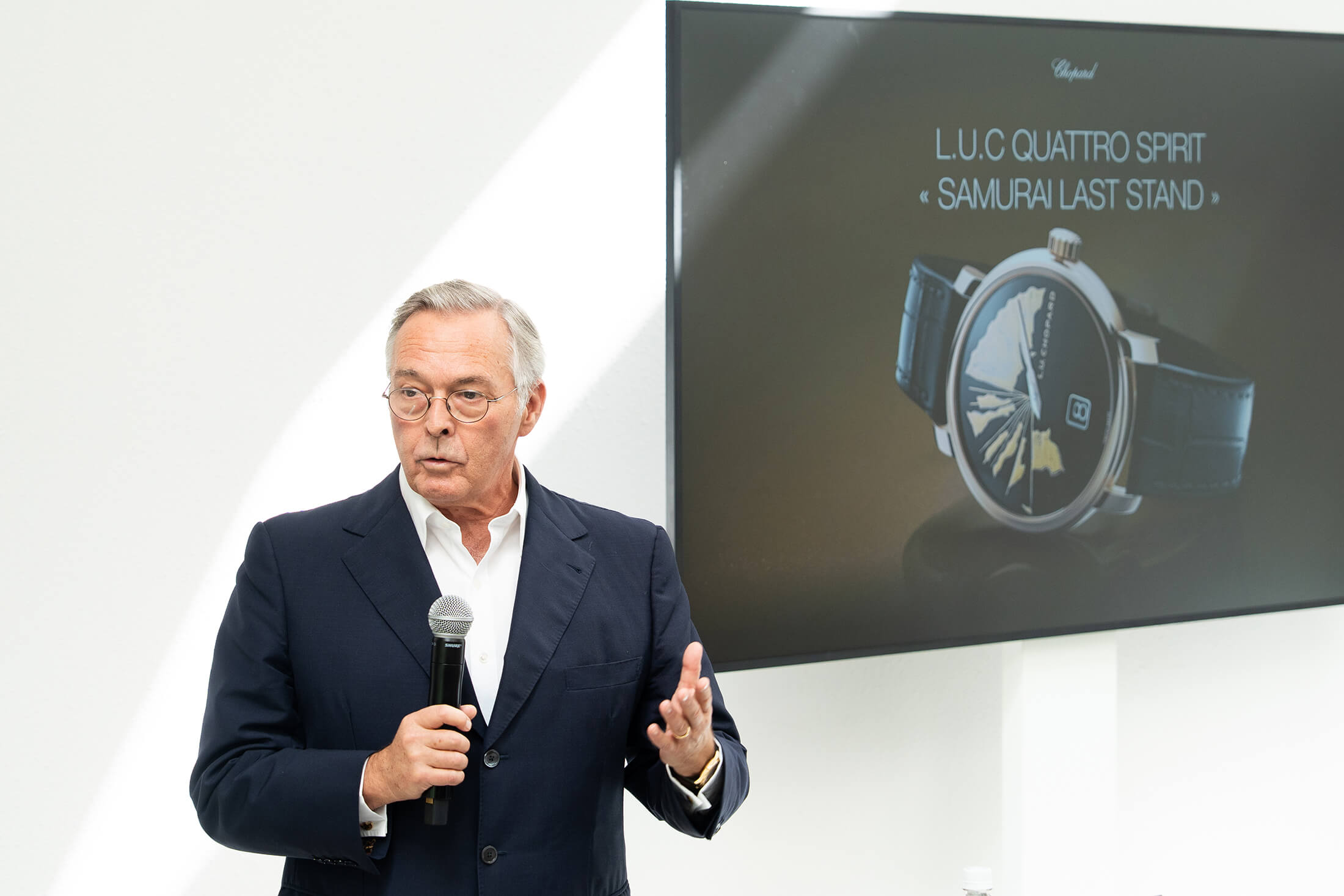 ショパール共同社長カール‐フリードリッヒ・ショイフレ氏自ら、プレス向けに「Inspirations from Japan - Artistic Crafts in Time」コレクションについてプレゼン。その力の入れようがうかがえる。© Chopard
