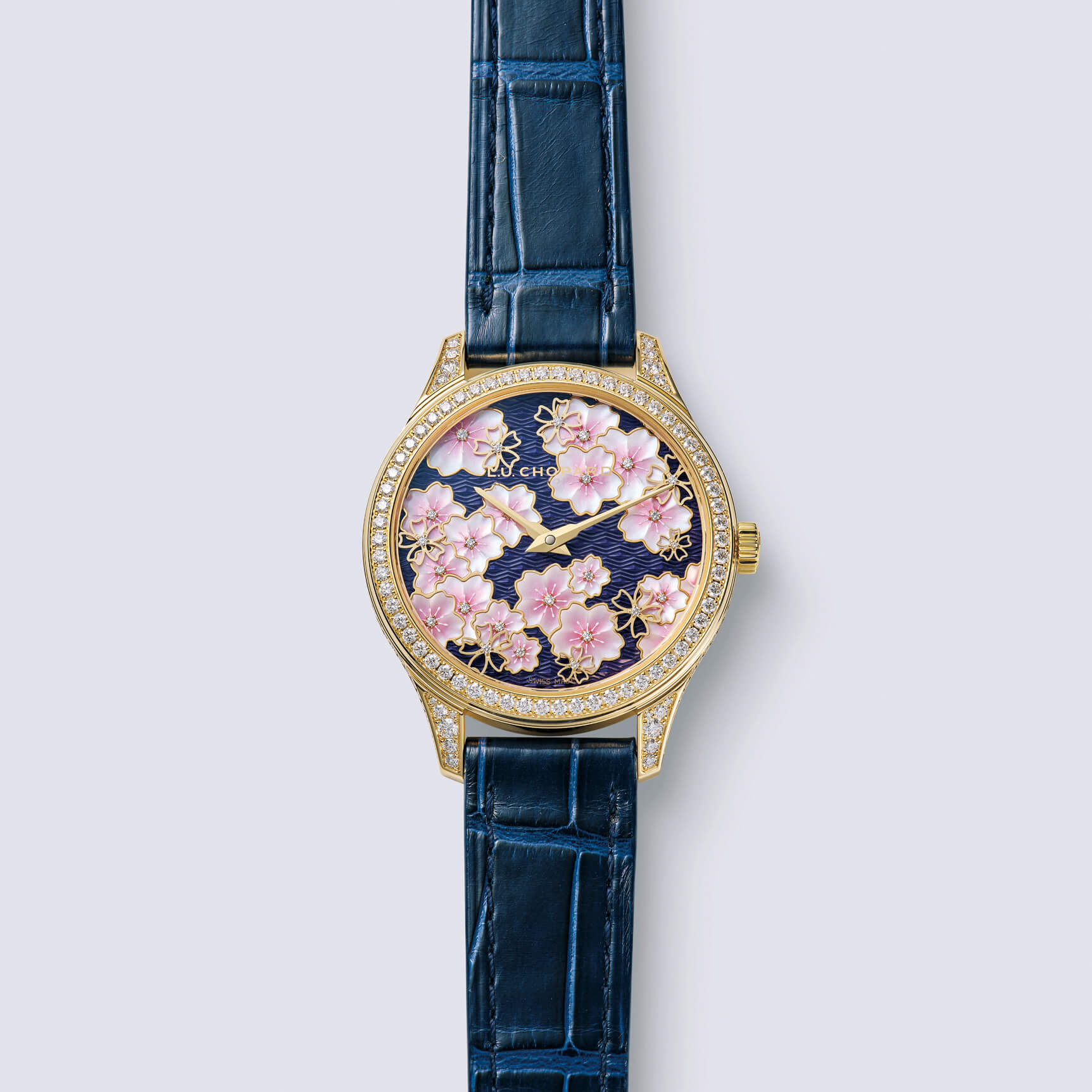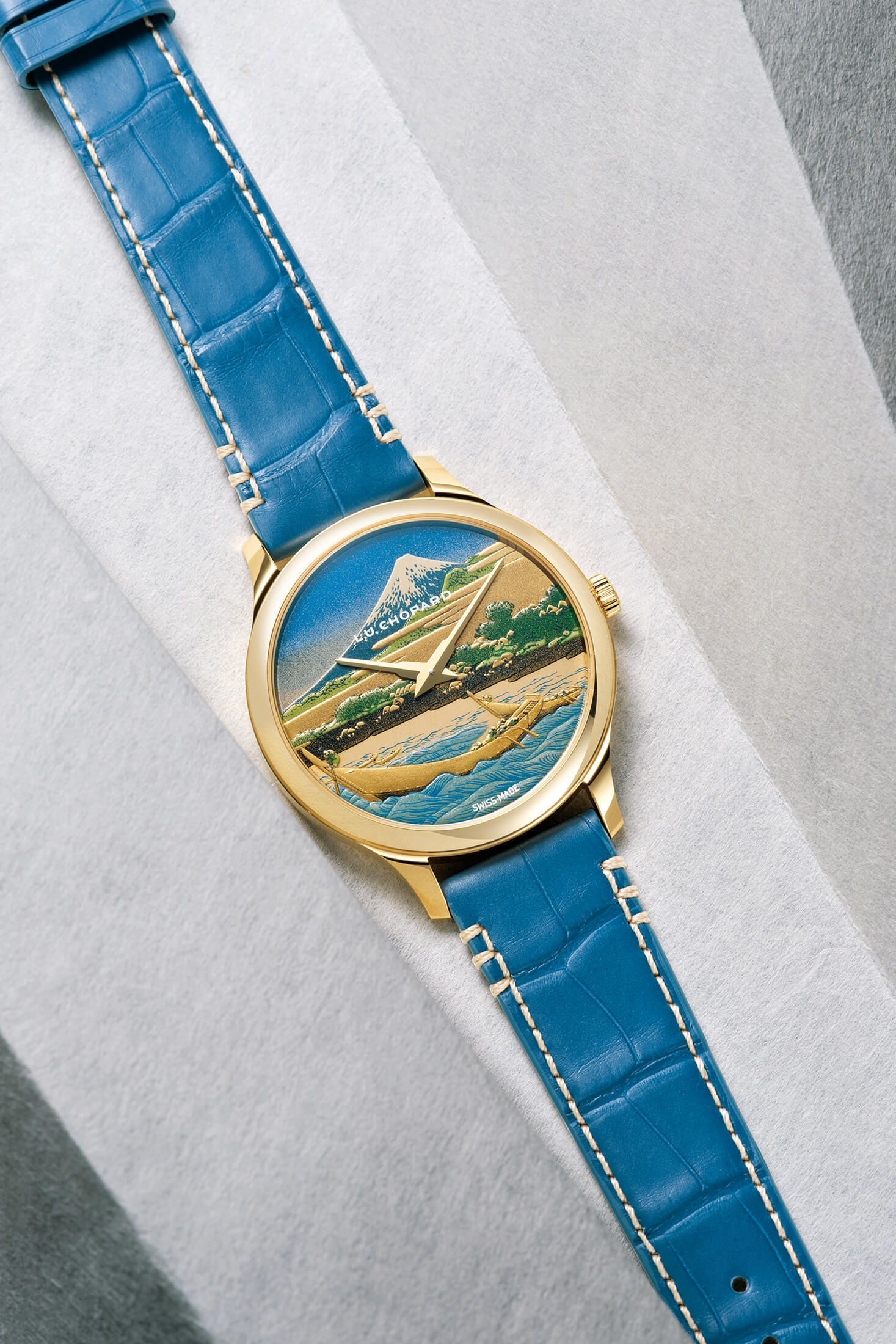 L.U.C XPをベースにしたモデルは3作ある。日本刀は、文字盤にダマスカス鋼を用い、120〜160層を重ねた鋼板を手作業で仕上げて生まれる模様は波紋を思わせ、無常観を説く禅の哲学が漂う。日本刀は武士の魂であり、武器という以上に神聖な精神性を象徴する。漆 浮世絵は、葛飾北斎の『東海道江尻田子の浦略図』にオマージュをささげ、漆工芸職人の小泉三教氏が制作した。唯一の日本人作家によるもので、それも日本古来の漆芸である蒔絵技法へのリスペクトからだろう。オリジナルの絵柄を生かしつつ、浮世絵本来の間を見事に表現する。サクラ バイ ナイトは、歌舞伎演目『二人椀久』での着物を着想源にした。ラッカー仕上げのブルー文字盤に、花弁をかたどったゴールドやマザーオブパールを立体彫刻した桜の花をあしらい、その中央にはダイヤモンドをセッティングし、彩色する。暗がりに浮かび上がる夜桜は、妖艶かつ幻想的だ。日本人は再生の象徴として桜の開花を祝い、やがて散りゆく定めに愁いを抱きめでる。繚乱する花はそんな心情を表現するのだ。