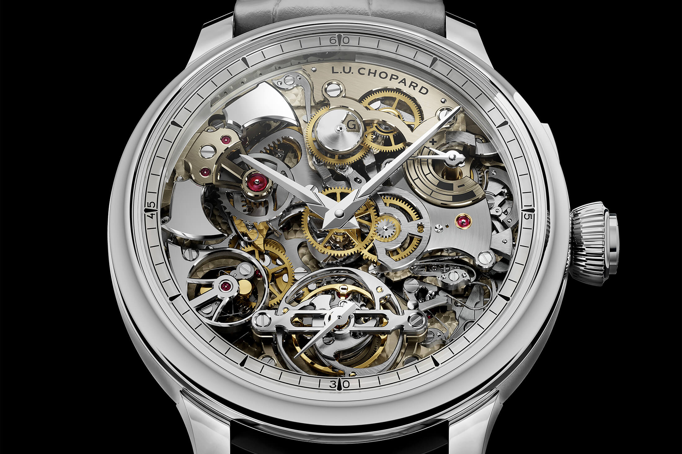 直径43mmの18Kエシカルホワイトゴールド製ケースに収まるのは、計686点ものパーツで構成されるCal.L.U.C 08.03-Lだ。完全なオープンワーク仕様になっており、ダイヤル側からもその全体像を見ることができる。ケースデザインは端正であるものの、きわめて控えめ。そのため、視線が自然とムーブメントへ注がれ、繊細なメカニズムに目が奪われる。