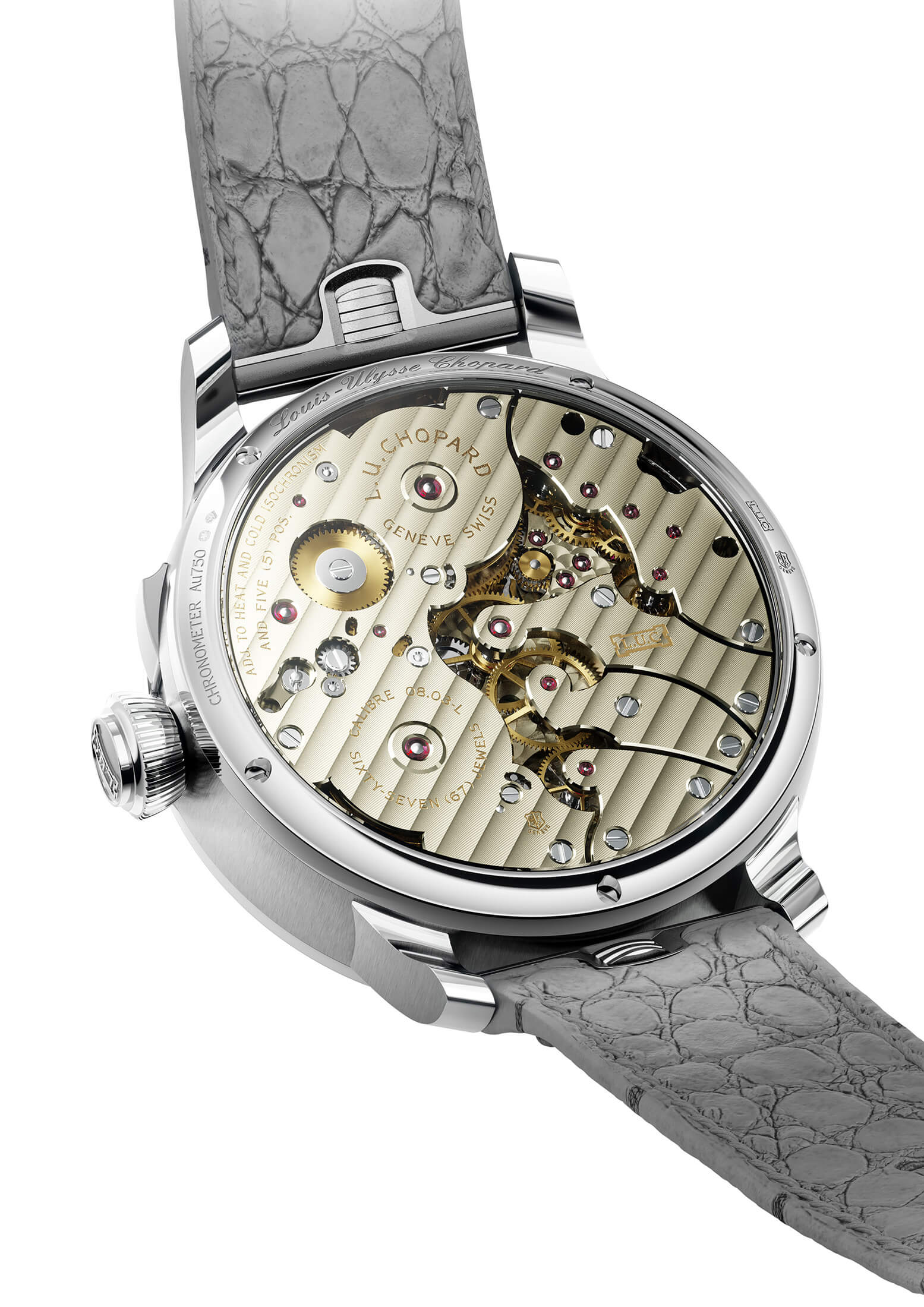 また優れたエネルギー効率を実現するため、本作が搭載する自社製手巻きCal.L.U.C 08.03-Lは、ふたつのゼンマイ香箱を備えており、ひとつは計時機能用、もうひとつはチャイミング機構専用としてそれぞれ独立している。ソヌリ用の香箱は完全に巻き上げられた状態で、チャイムを頻繁に鳴らすグランソヌリモードにおいても12時間途切れることなく作動し続けるエネルギーを提供する。