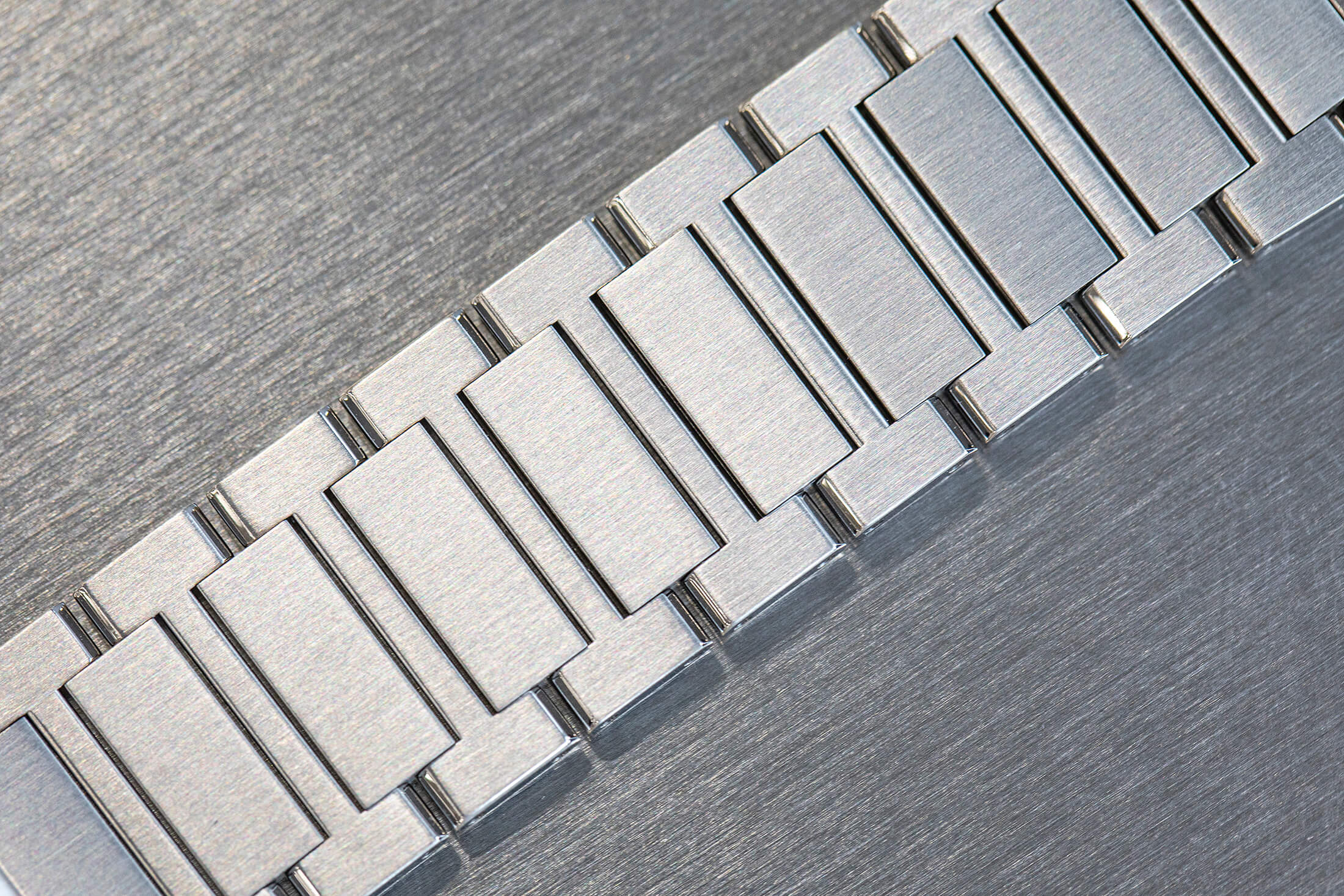 ケースからブレスレットへとつながる⼀体感のあるデザイン、そしてベゼルを留める4ヵ所のネジにはこれまでより⼤きなものを採⽤するなど、全体的にスポーティな印象に仕上げられている。ケースとブレスレットは繊細なヘアラインで落ち着いた雰囲気に仕上げながら、ベゼルとケースの斜⾯にはザラツ研磨によって平滑で美しい鏡⾯加⼯を施し、華美な装飾を削ぎ落したなかにもドレスウオッチらしいエレガントなコントラストをもたらしている。