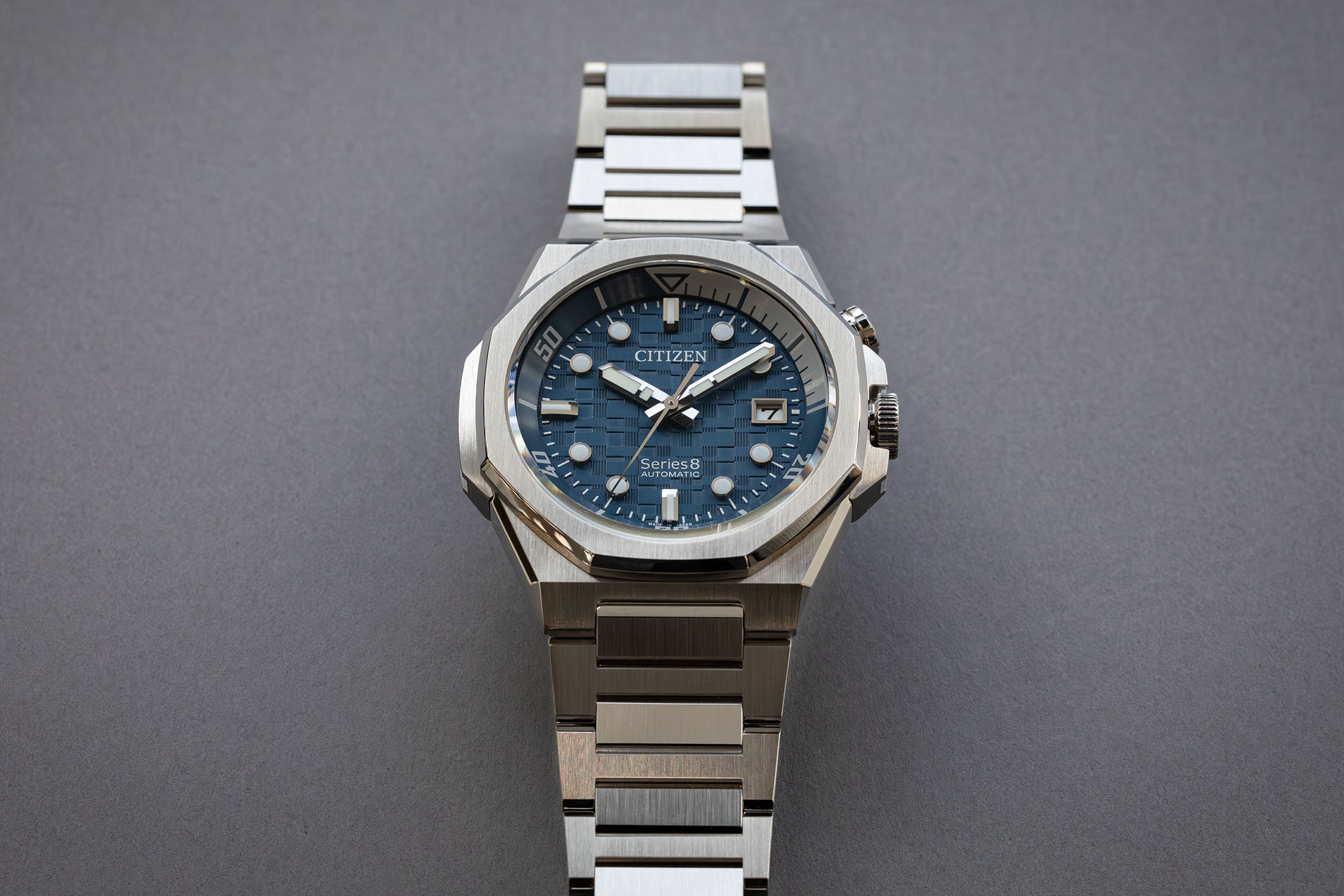 上でも述べたとおり、ケースの厚さはやや控えめだ。しかし、面ごとに磨きを変えた別体のベゼルやサイドパーツ、ダイヤルのパターンによって、設計値以上の立体感と奥行きを感じるデザインに仕上がっている。特にサイドビューは別体パーツを留めるビスや複数パターンのヘアラインの使い分けなど細かなディテールが効いていて、メタルの質感を存分に生かしたシリーズエイトらしい高級感を楽しむことができる。また、太めに幅を取られたインナーベゼルやメタルブレスはスポーティな印象を強めており、都市生活者のためのスタイリッシュなスポーツウォッチとして考え抜かれたパッケージに仕上がっている。