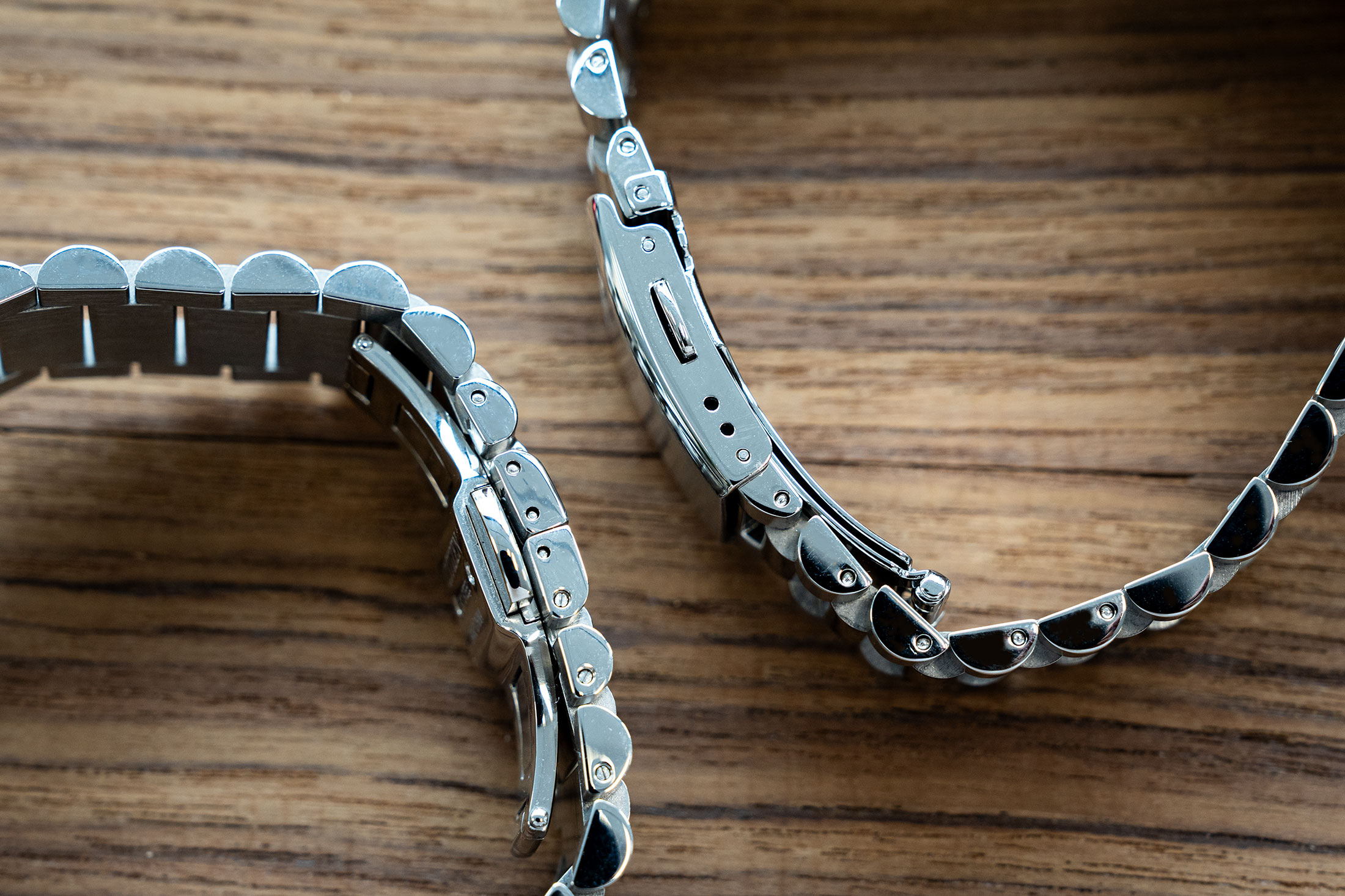 まずはポジティブな面から解説する。新作において中ゴマの幅が大きく広がったことで、手首の上での安定感は増したように思う。コマ間の遊びがより少なくなり、さらにホールド感が増した印象だ。またダイヤルの主張が強くなった分、ブレスの存在感が増してバランスが取れているように見える。ちなみに新型においてテーパーはまったくなくなったわけではなく、リンクのひとコマ目から4コマ目にかけて2mmほど絞られている。しかし、既存のデイト付きモデルと比べるとそのインパクトは少ない。