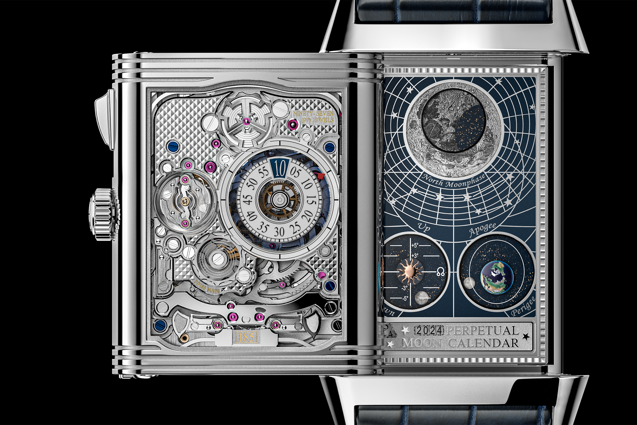 機械的に言えば、この時計の心臓部は永久カレンダー機構であり、この機構が他の天文複雑機構を動かしている。月の周期は、メインケースからクレードル上のプッシャーに伸びるピンによって、1日1回、真夜中に更新される。これは、ジャガー・ルクルトが2006年に発表したハイブリス・メカニカのレベルソ・グランド・コンプリカシオン・トリプティックでも採用した方法だ。