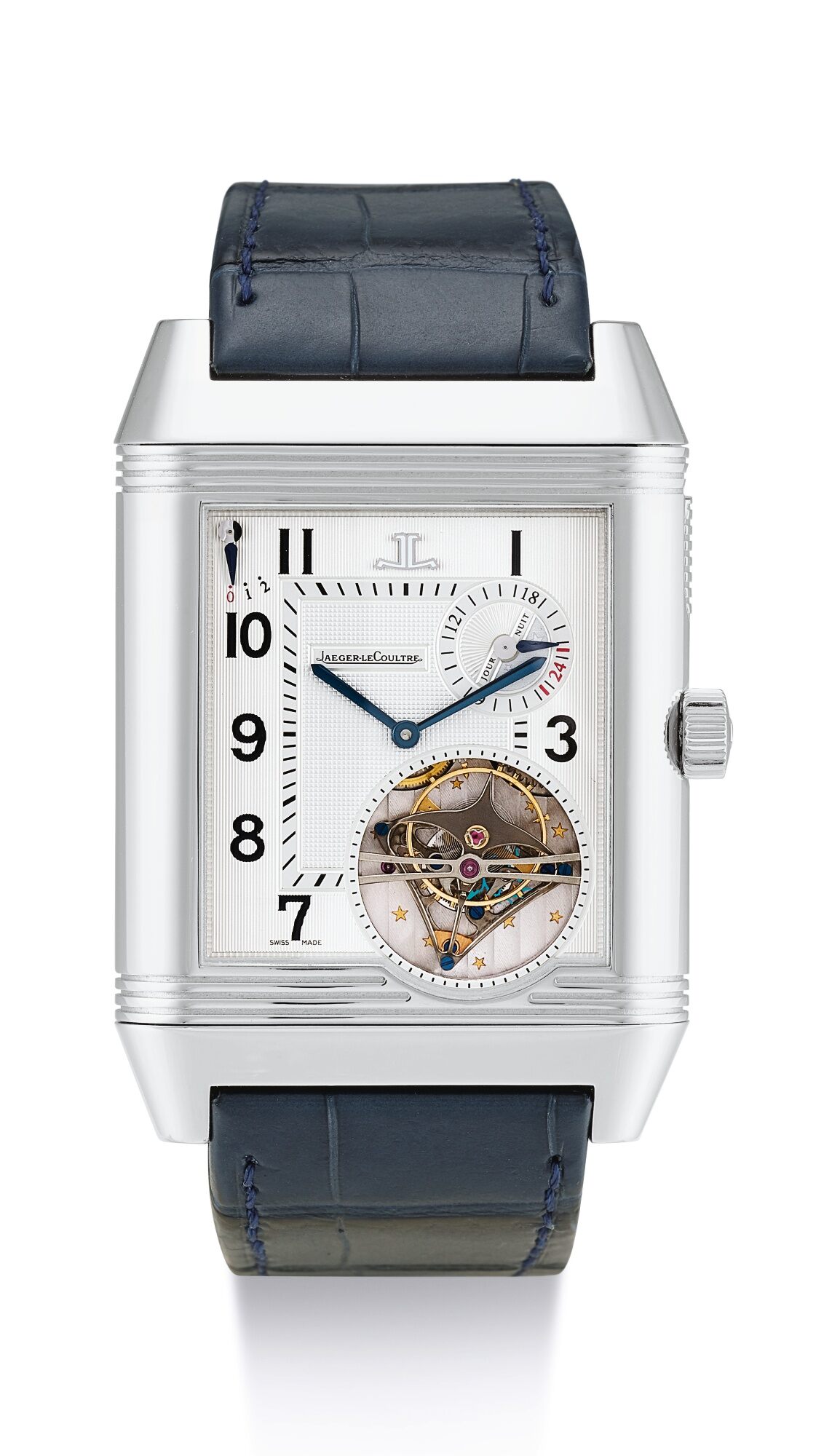ジャガー・ルクルト レベルソ・ハイブリス・メカニカ Cal. 185クアドリプティック Ref. Q7103420: ケース 51.2mm×31mm×5.15mm、18Kホワイトゴールド製。防水性能30m。レベルソ、ケースの表裏、ケースクレードルの表裏にインダイヤルを配置。