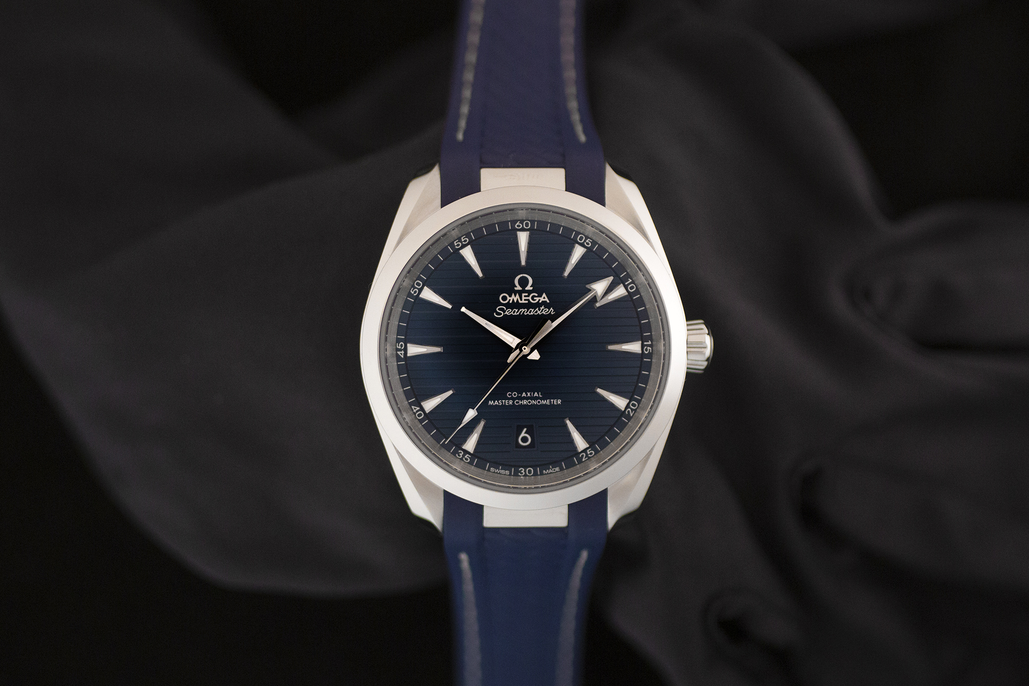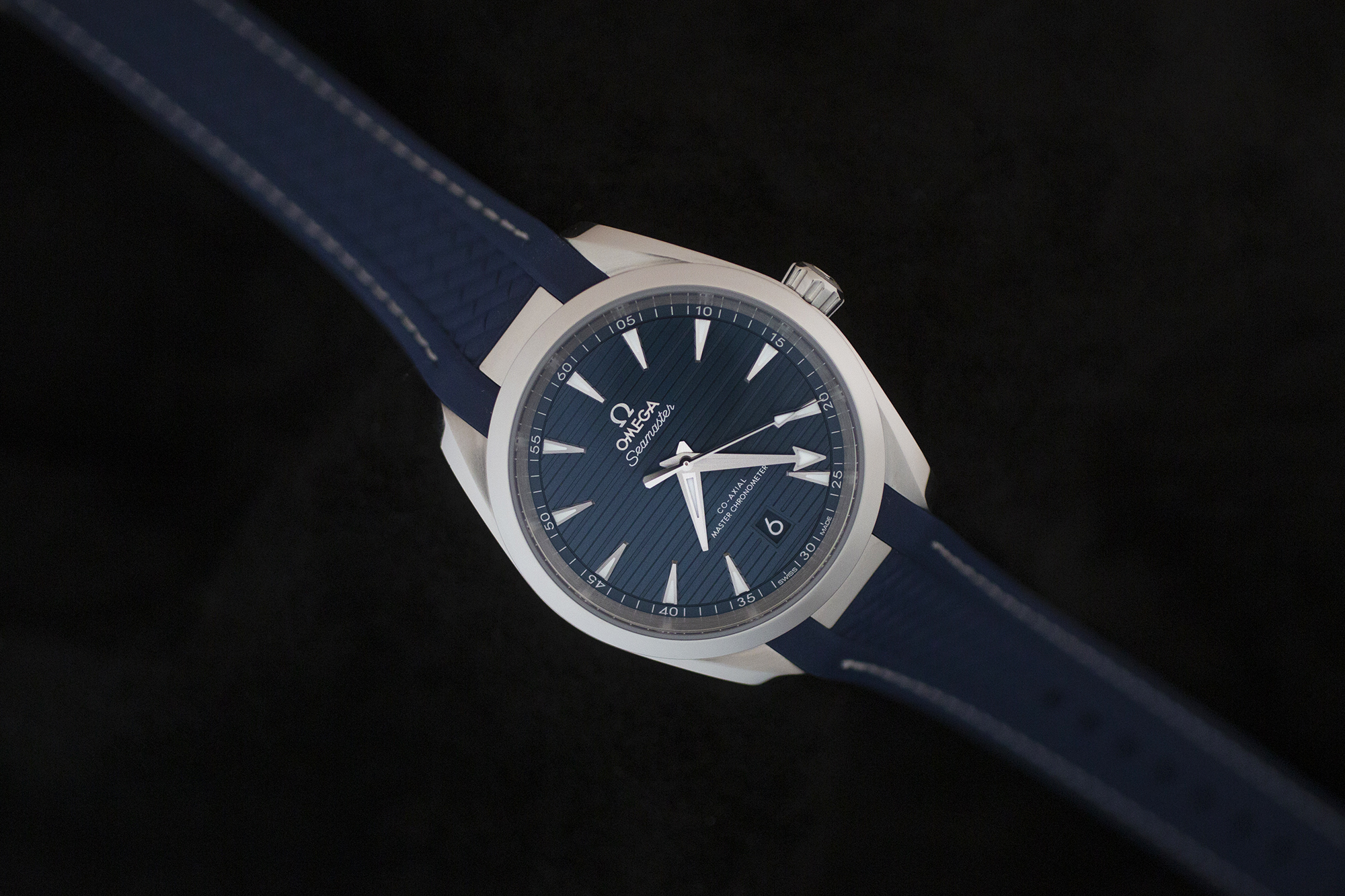 アクアテラ は、ダイバーズほどストイックではない、日常使いできるマリーンスポーツウォッチとして独特なテイストを味わせてくれる。 オメガのスピードマスターやプラネットオーシャンのような重厚なスポーツウォッチとは一線を画したドレッシーさを持ち合わせつつ、デ・ヴィルよりもスポーティだ。 その証拠に、このアクアテラは、直径38mm、厚さ12mm、ラグからラグまでわずか44mmで、近年のオメガにしては少し小さく設計されているのだ。 クルージングやヨットを好む男女向けに、アクアテラ 150Mは、オメガの最先端ムーブメントに加えて、仕上げの細かさときらびやかさをブレンドしたシーマスターシリーズの非常に魅力的なエントリーモデルとなっている。