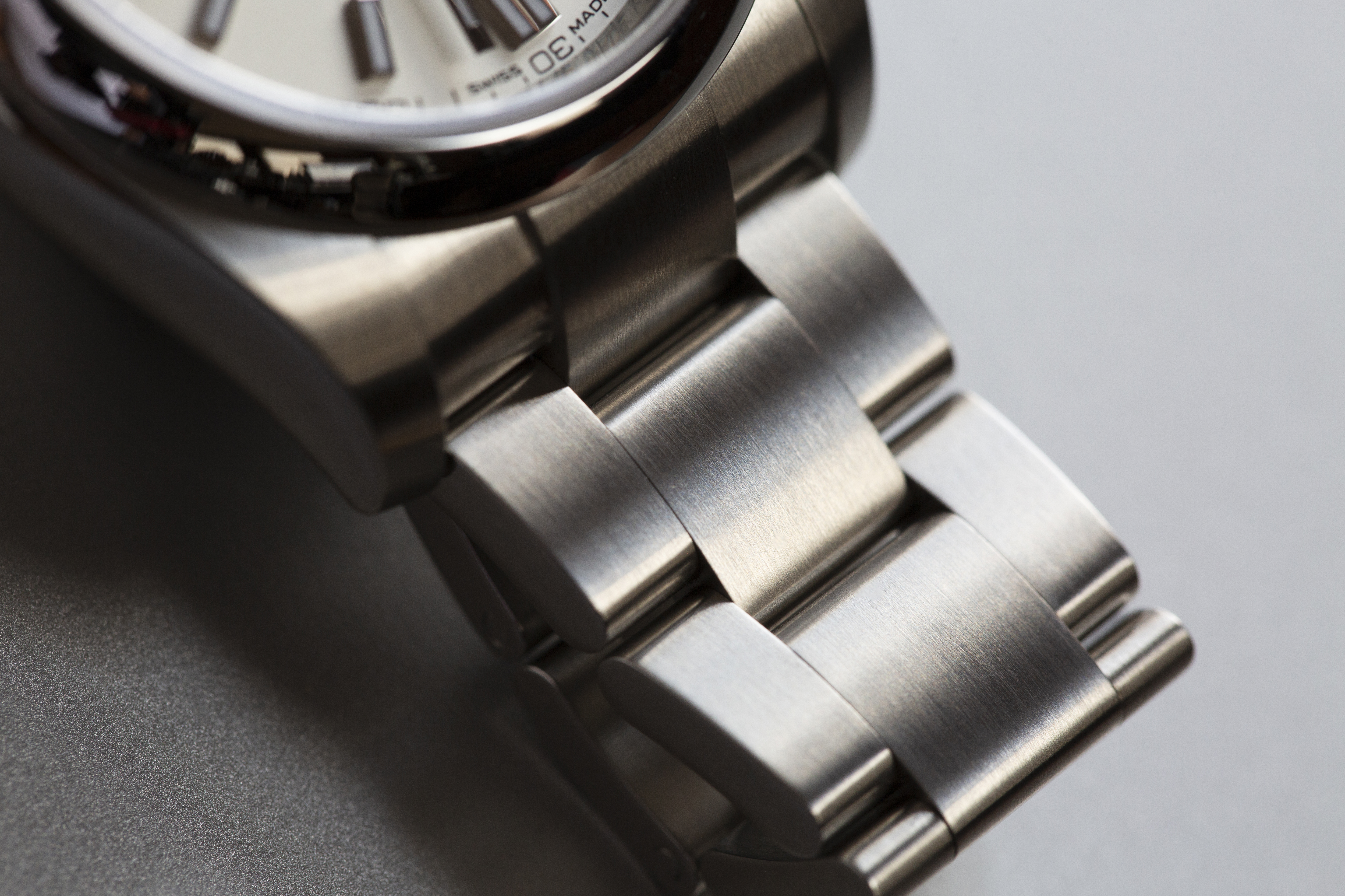 モータージャーナリストはロードフィールについて語るように、時計ジャーナリストは腕に乗せた際の感触について語るべきだ。オイスター パーペチュアル 36mmのスティールブレスレット腕に乗せた際の感触はまさに理想とされるものだ。時計を身に着けるうえで、ステンレスは険しい田舎道を走る機敏で正確な操舵性を持つ車から得られる安定感と信頼感に似た、ほど良い重量感があるのだ(チタンだと場合によっては軽すぎる)。