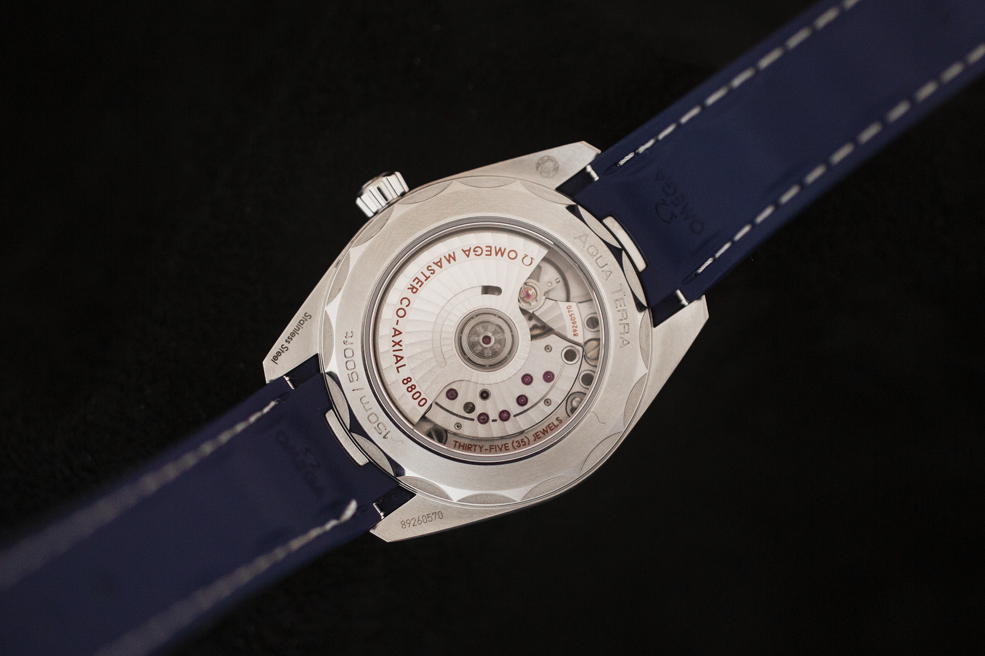 ムーブメントの観点からも、アクアテラ 150Mは価格以上の価値を提供してくれる。このエントリーモデルでも、オメガのCal.8800 マスターコーアクシャルを搭載しており、非常に高い精度を保証するために、フリースプリングテンプ、Si14シリコン製ヘアスプリング、METAS認定を備えている。3.5Hz振動の非常に現代的な自動巻きムーブメントは35石、55時間のパワーリザーブを確保する。
