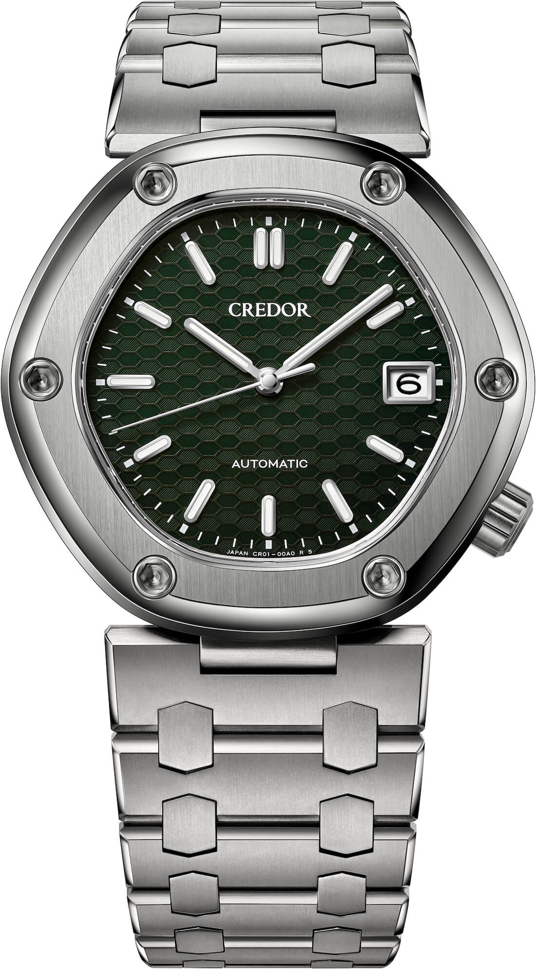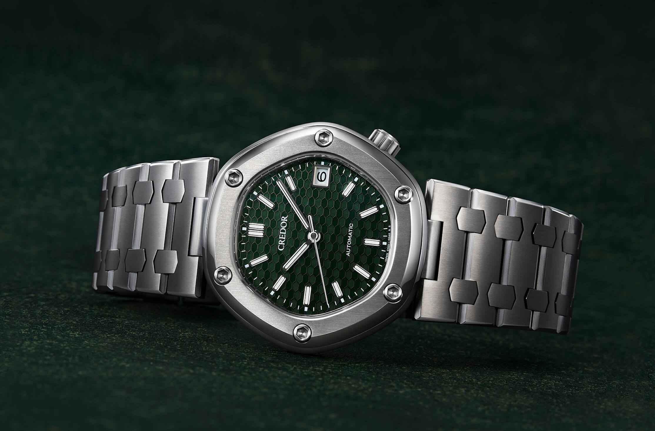 昨年リバイバルして大きな話題を呼んだ、クレドール ロコモティブに早くも新色が登場。しかも限定本数のない通常生産品として、5月23日より販売を予定している。細かな六角形のパターンがあしらわれた少し深みのあるグリーン文字盤は、「Green Light=青信号、Goサイン」を表現しており、光が当たる角度によって色が明滅するような効果も与えられている。
