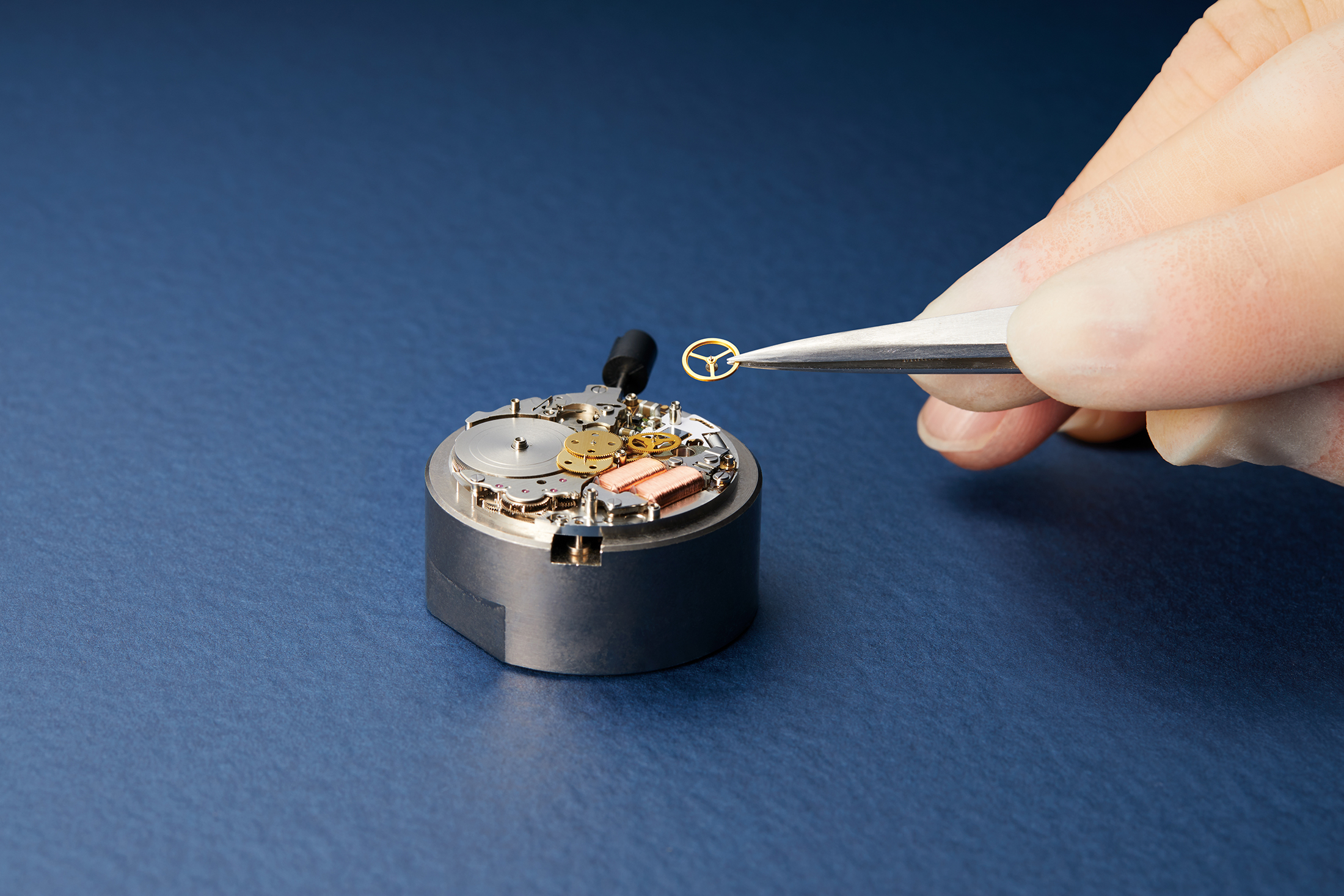 スプリングドライブCal.9R65におけるグライドホイールの取り付け。