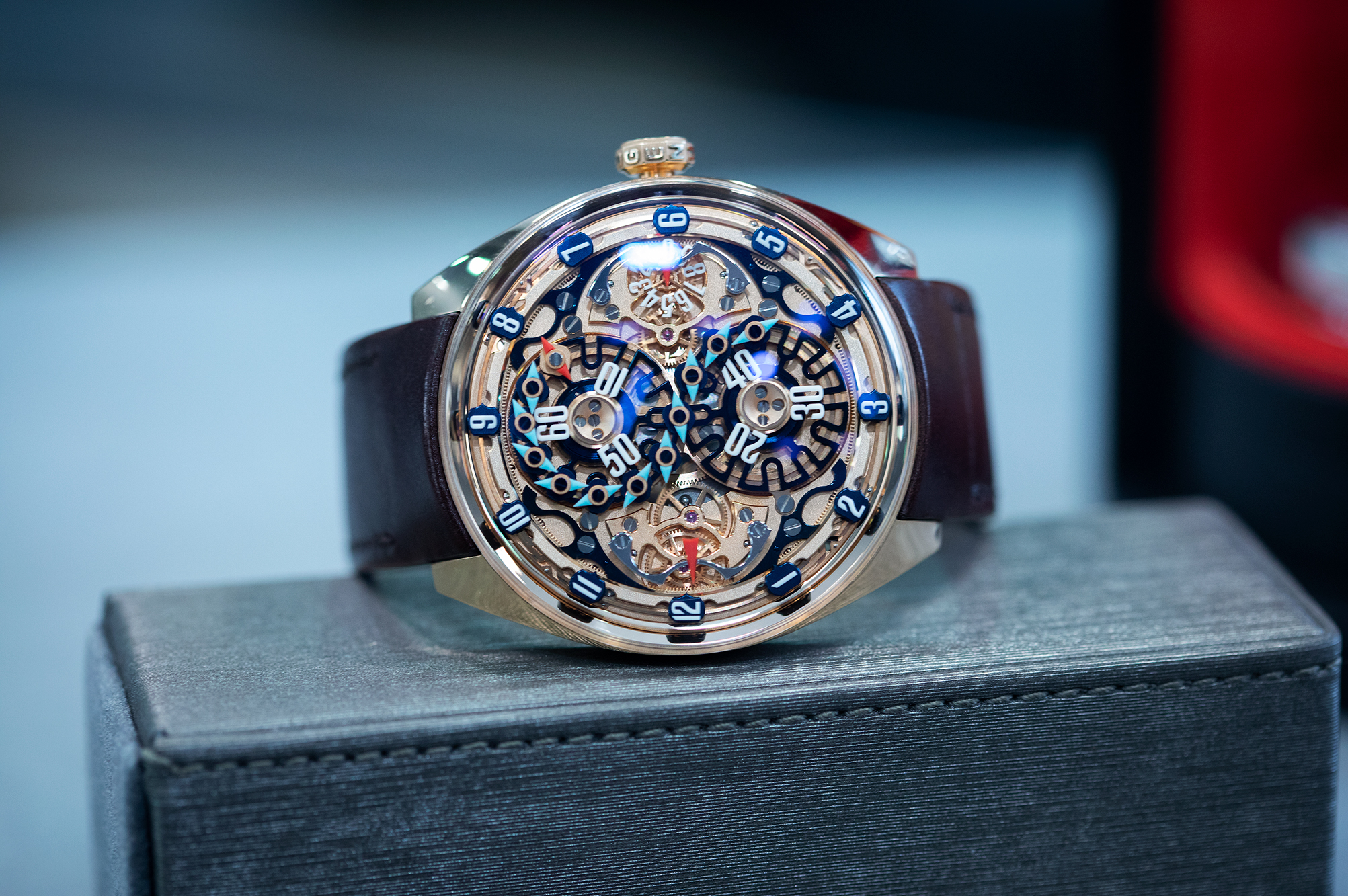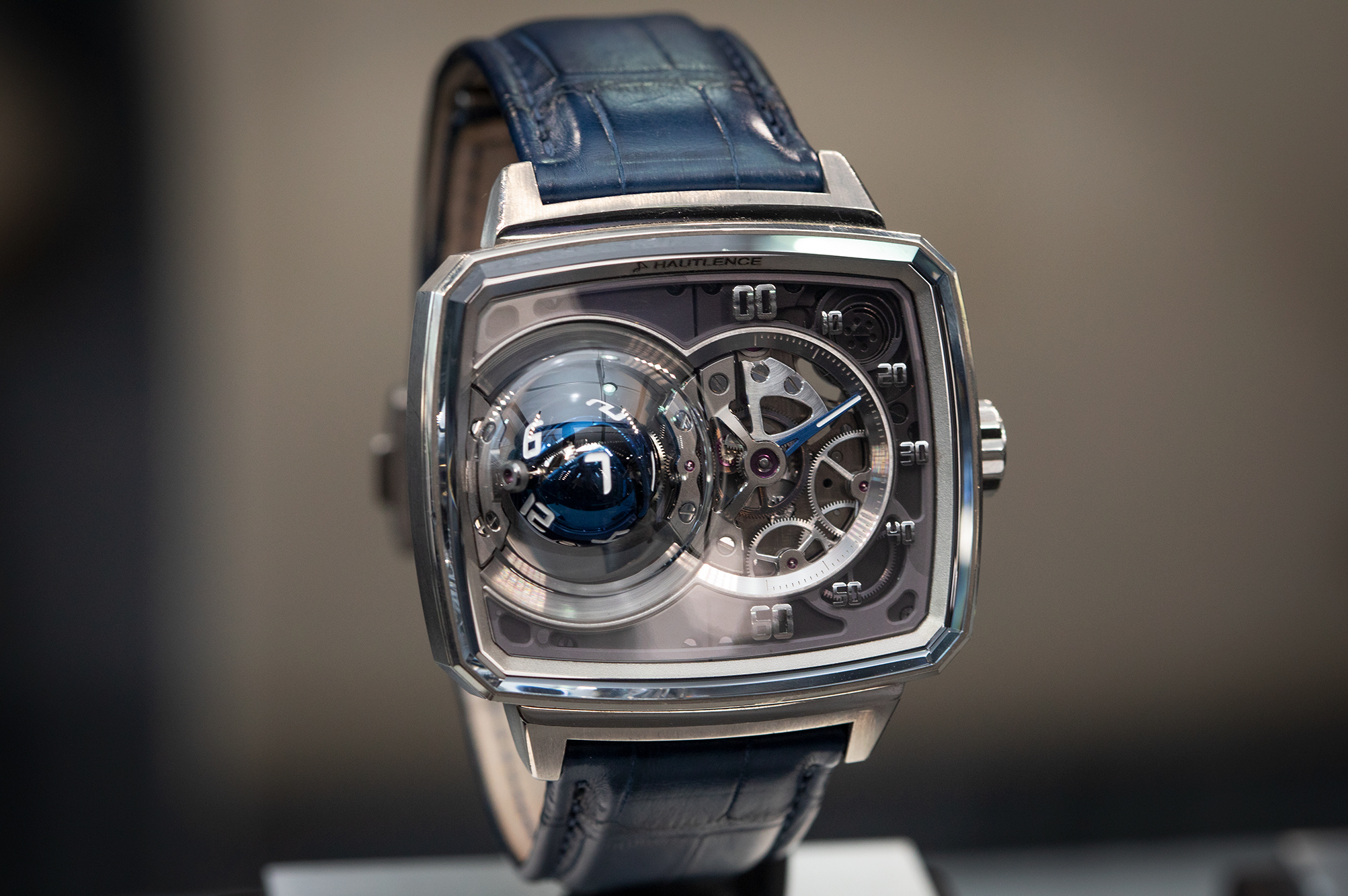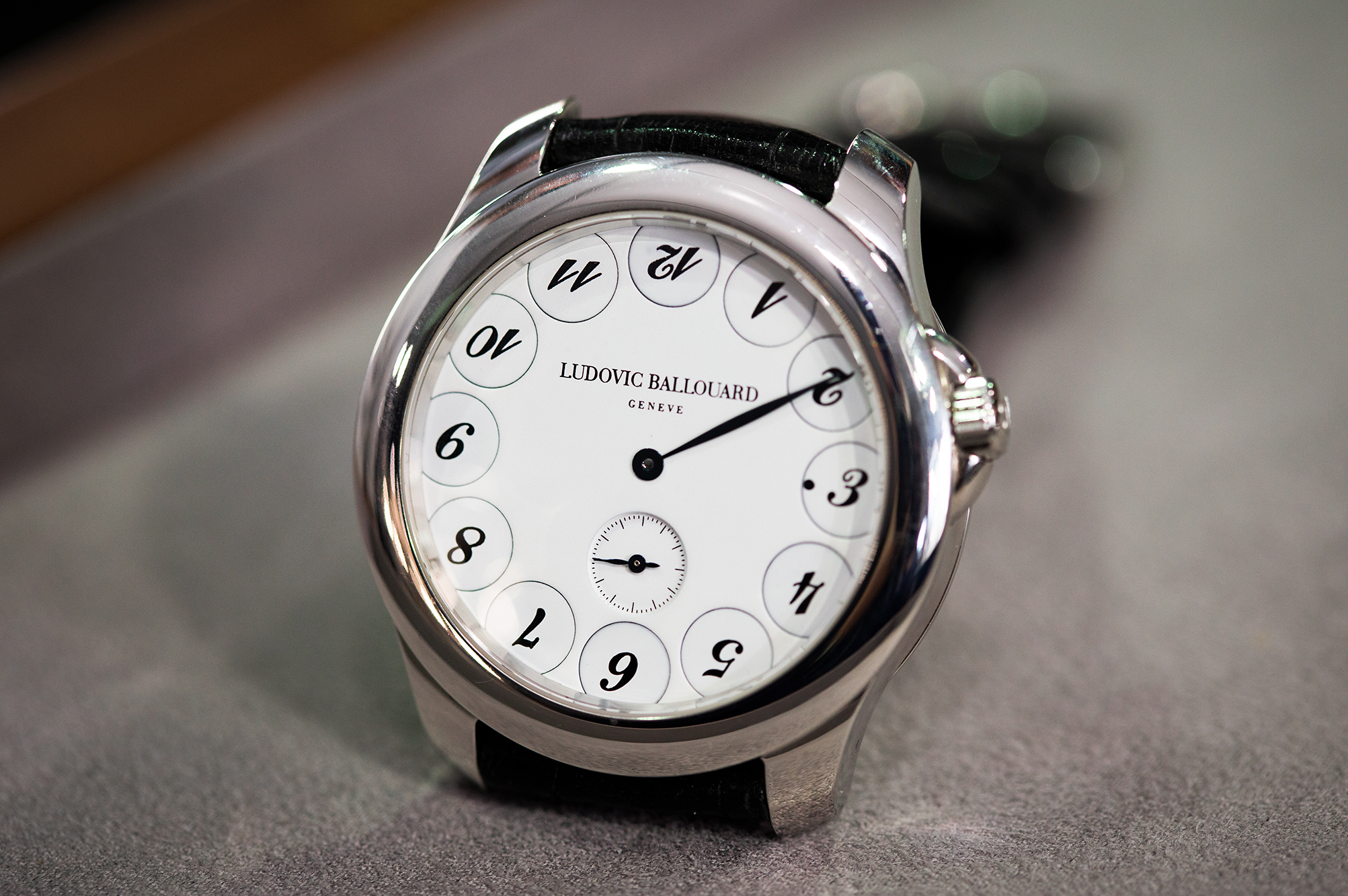 ルドヴィック・バルアー 「アップサイドダウン」ウォッチ。現在の「時」を示すディスクが正しい向きに回転しており、「分」は中央の分針1本で表示される。