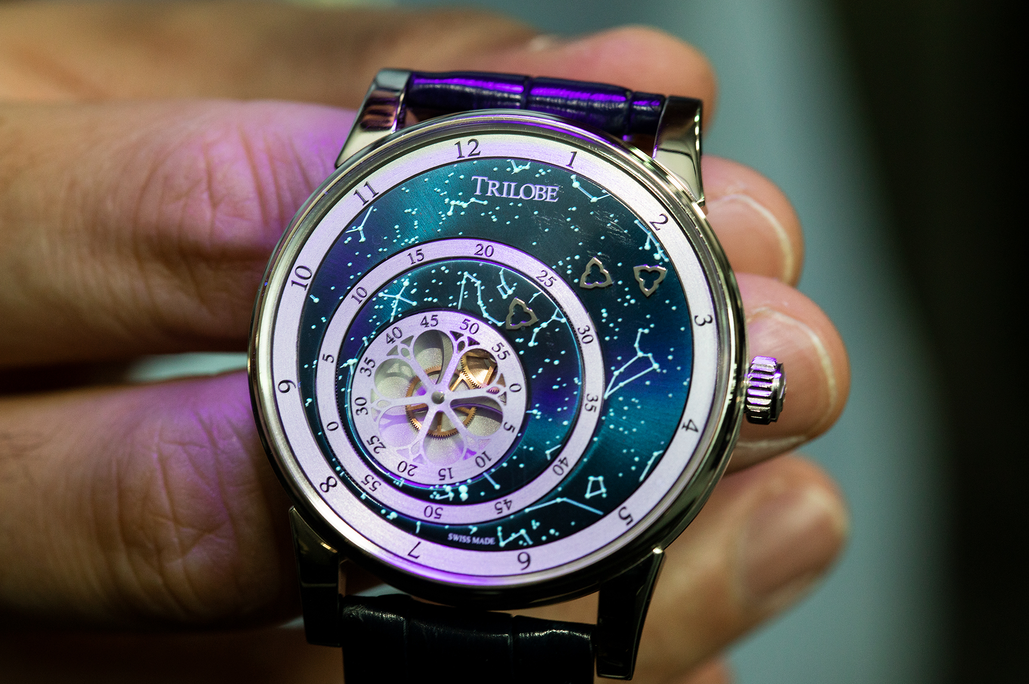 トリローブ 時刻は三つ葉のマークを使って、3つの回転するディスクから読み取る。ブランド名はこの三つ葉が由来である。