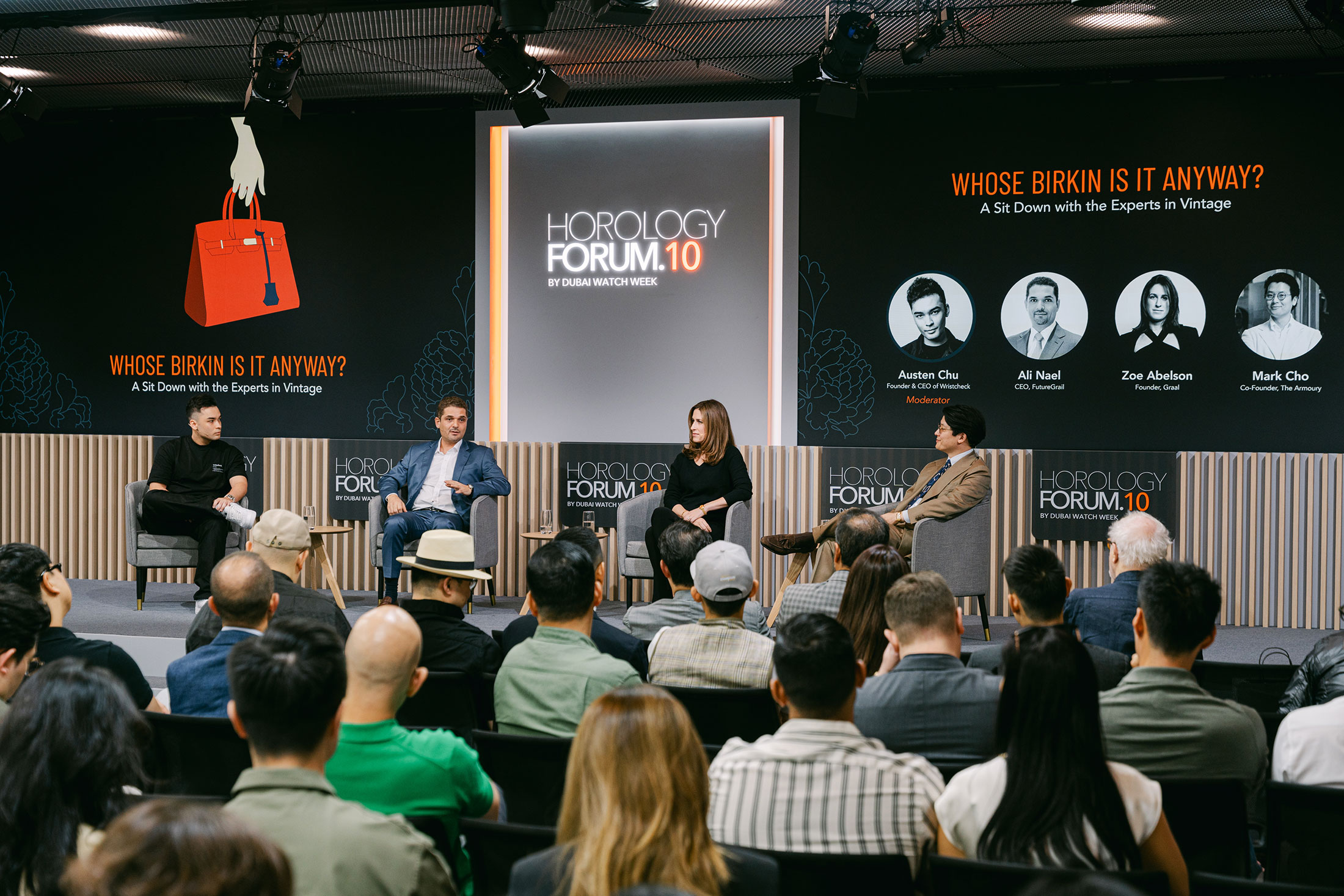 ちなみに上記の「振り子は東へ揺れる」のように僕らにとって関係が深いアジアのコミュニティに直結する内容のものもあったが、フォーラムのテーマは基本的にはユニークで自由だ。たとえば23日(2日目)の昼から開催された「Whose Birkin Is It Anyway? A sit down with the experts in vintage(そのバーキン、誰のもの?―ヴィンテージ専門家との対談)」はタイトルのとおり“時計界のバーキン”、すなわち価値あるヴィンテージウォッチが人から人に手に渡ることが普通になり、セカンダリーマーケットの存在が当たり前になってきた現状についての談義が行われた。同フォーラムには、リストチェックCEOのオースティン・チュー(Austen Chu)氏にGraalの創業者であるゾーイ・エーブルソン(Zoe Abelson)氏、フューチャーグレイル創設者であるアリ・ナエル(Ali Nael)氏、そしてHODINKEE Japanでも親交の深いアーモリーの共同創設者マーク・チョー(Mark Cho)氏が登壇していた。