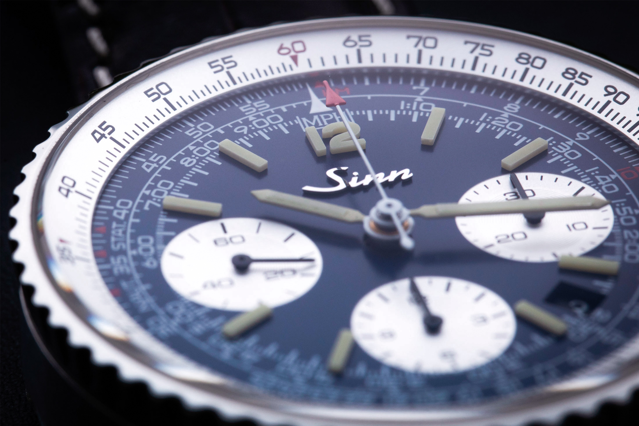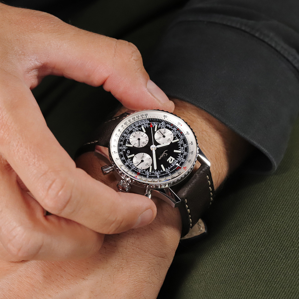 私が推したいリバースパンダウォッチはジンの903.St.IIだ。一見するとブライトリングのナビタイマーにそっくりだと思うかもしれない。というのも1979年に、クォーツショックの荒波のなかでブライトリングが一時休眠状態に陥った際、ジンの創業者であるヘルムート・ジンがデザインの権利やパーツを正式に買い取ったのがその理由だ。つまり、この903はナビタイマーの正統な血統を受け継ぐ、いわば兄弟のような存在なのである。