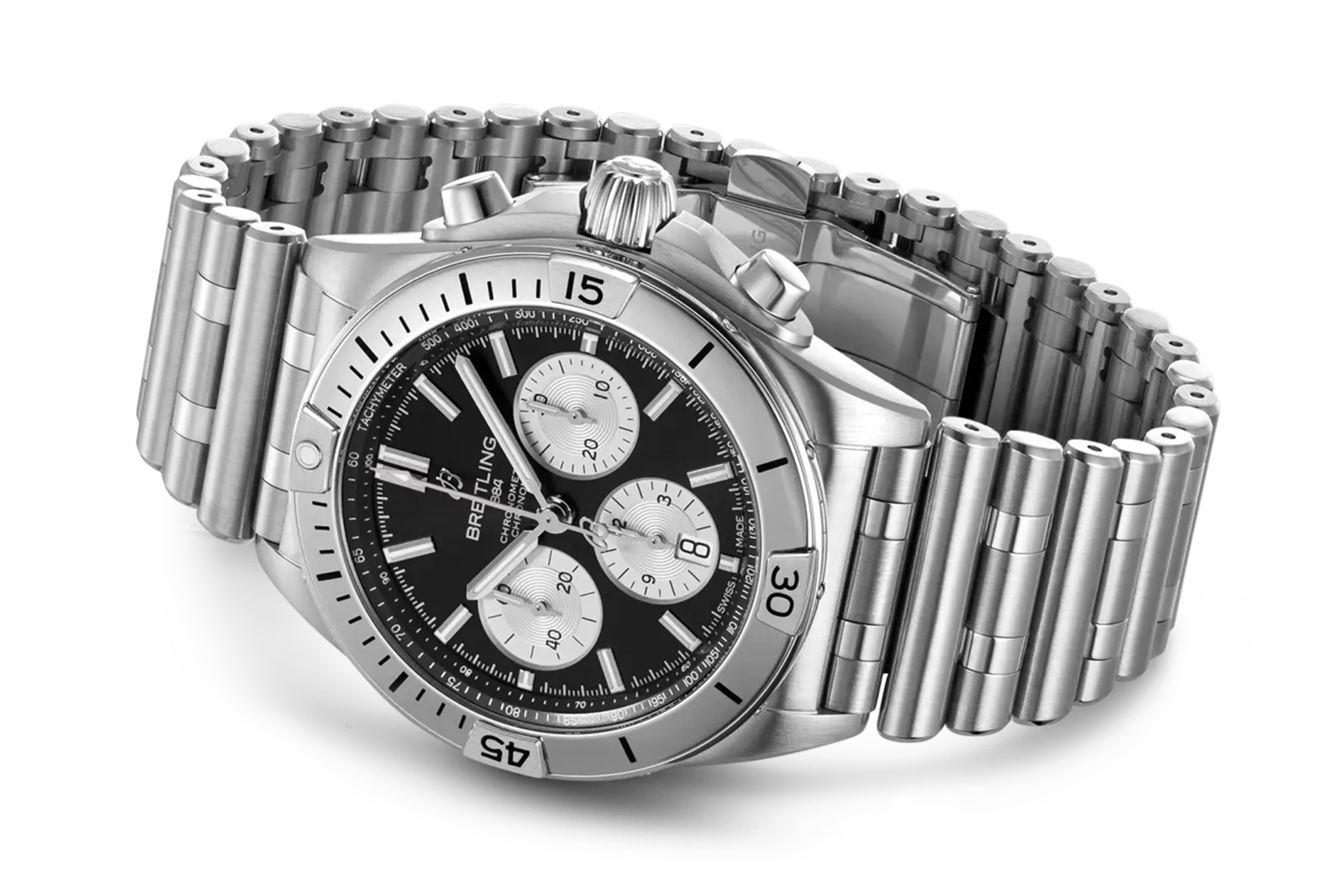クロノマット B01 42 ジャパン エディションは文字どおり、日本限定販売仕様モデルだ。ベースは、2020年にフルモデルチェンジを果たし、1984年に市販されたオリジナルに回帰したデザイン、そして円筒形状のコマが特徴的なルーローブレスレットを持つクロノマット B01 42。本作ではブラックダイヤルにホワイトではなく、シルバーのインダイヤルを合わせる。