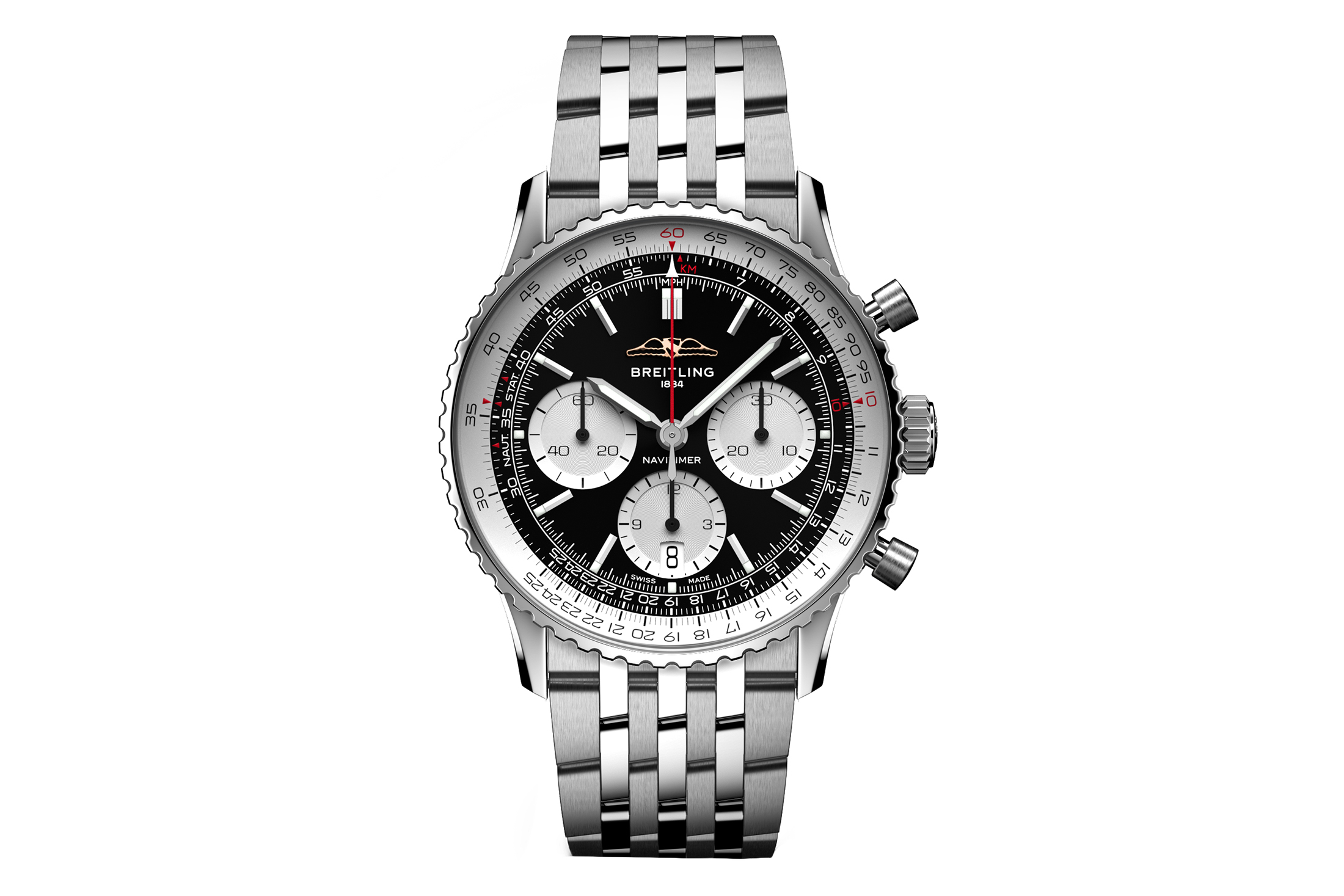 プロフェッショナルツールであり、ブライトリングの最もアイコニックなタイムピースであるナビタイマーにはリバースパンダダイヤルが多い。こちらは現行のナビタイマー B01 クロノグラフ 41(AB0139211B1A1)。