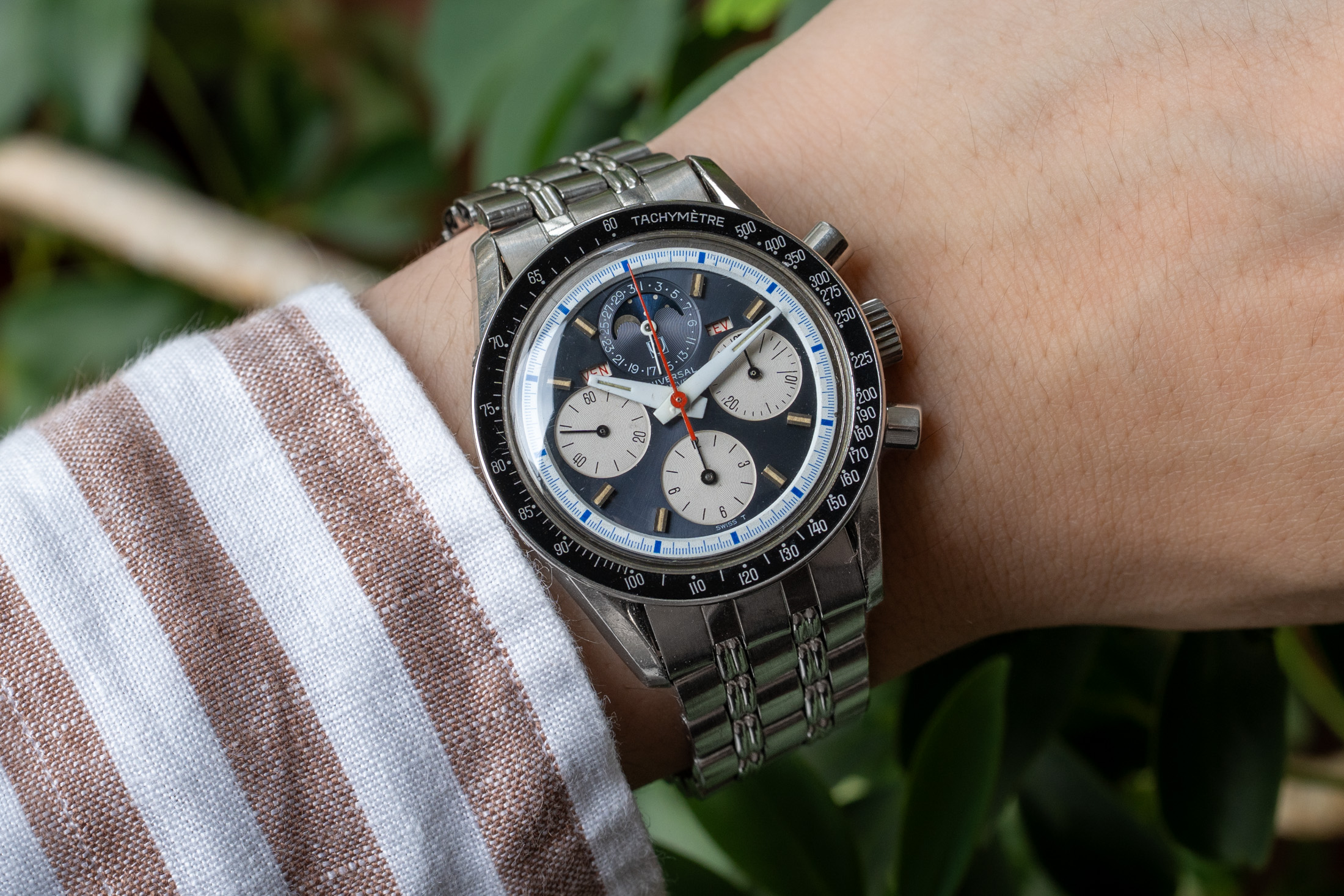確かに希少な存在ではありますが、このトリコンパックスの魅力はそれだけではありません。トリプルカレンダー、ムーンフェイズ、クロノグラフを備えながら35.5mmというサイズ感、そしてこの独特なカラーリングは、現代のモダンウォッチではほとんど見られないもの。だからこそ、時代を超えてなお強く惹かれてしまうのだと思います。