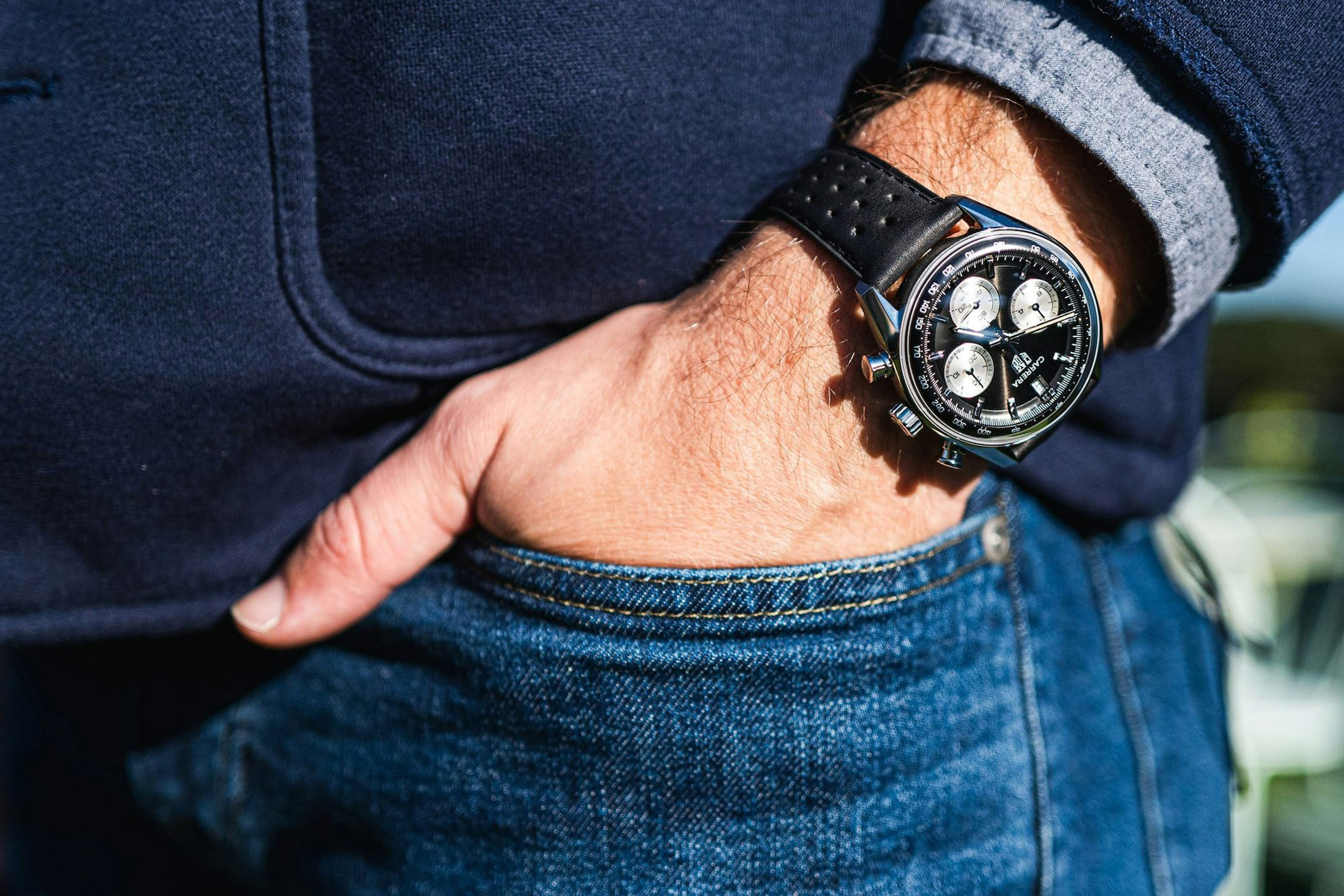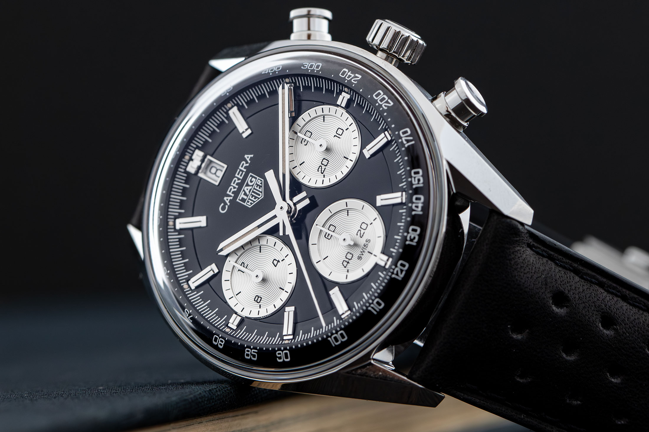 今ではすっかり見慣れた、ホイヤーの初代クロノグラフから継承したドーム型サファイアクリスタル、風防に沿って隆起する独特なアウターフランジの中央には、アズラージュ仕上げを施した横3つ目のサブダイヤルが鎮座する。39mmとやや小振りでシャープなケース形状も相まって、全体としてはモダンなルックスだが、インデックスと針の夜光はヴィンテージを思わせるクリームカラー。クラシカルな雰囲気も漂わせている。現在は同じダイヤルで7連のメタルブレスも用意されているが、初登場時はカレラの出自を思わせるパンチングレザーストラップ一択だった。これがレーシーな逆パンダダイヤルやヴィンテージライクなディテールとよくマッチし、実に男らしい印象だった。