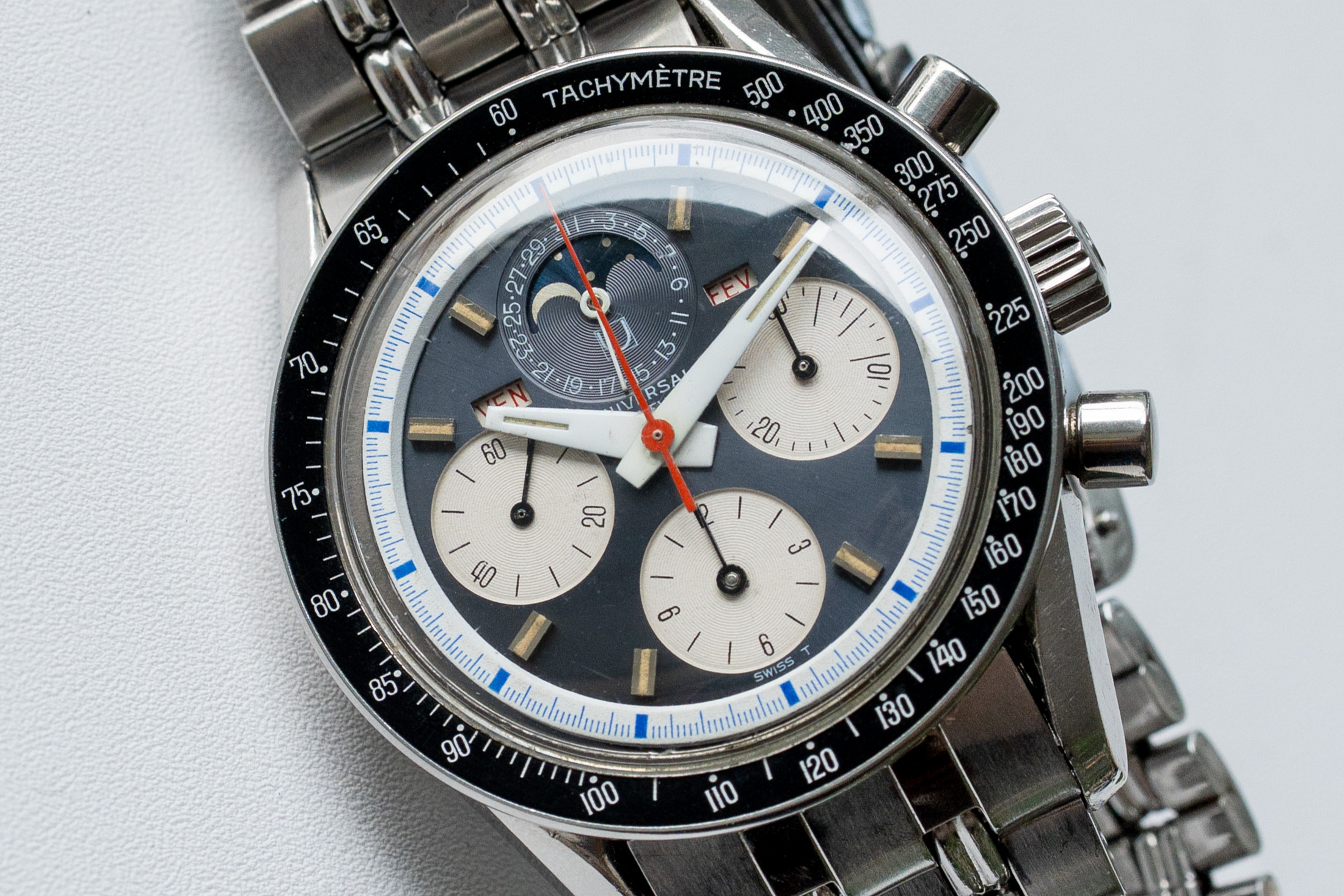 そもそもリバースパンダダイヤルとは、パンダダイヤルがあって初めて生まれた対となる存在だ。パンダダイヤルは、ホワイトダイヤルにブラックのインダイヤル、そしてリバースパンダダイヤルはそれを反転したブラックダイヤルにホワイトのインダイヤルの組み合わせを指す。どちらもメイン(時刻表示)とサブ(クロノグラフ積算計)のコントラストを高めることによって視認性と判読性を追求するという実用的な側面から考えられたものだが、特にレース中の瞬間計測やドライバーがひと目で理解できる配色が求められた1960年代のモータースポーツシーンと結びつき、ロレックスのコスモグラフ デイトナやホイヤーのカレラ、ユニバーサル・ジュネーブのコンパックスといった名作に採用されたことで、パンダ/リバースパンダダイヤルはクロノグラフの象徴的なデザインへと昇華した。“パンダ”の名称は後年の時計愛好家たちによる愛称で、文字どおりその配色が動物のパンダの顔のようであることに由来する。そしてパンダダイヤルとは配色が逆転しているから“逆パンダ”、“リバースパンダ”というわけである。